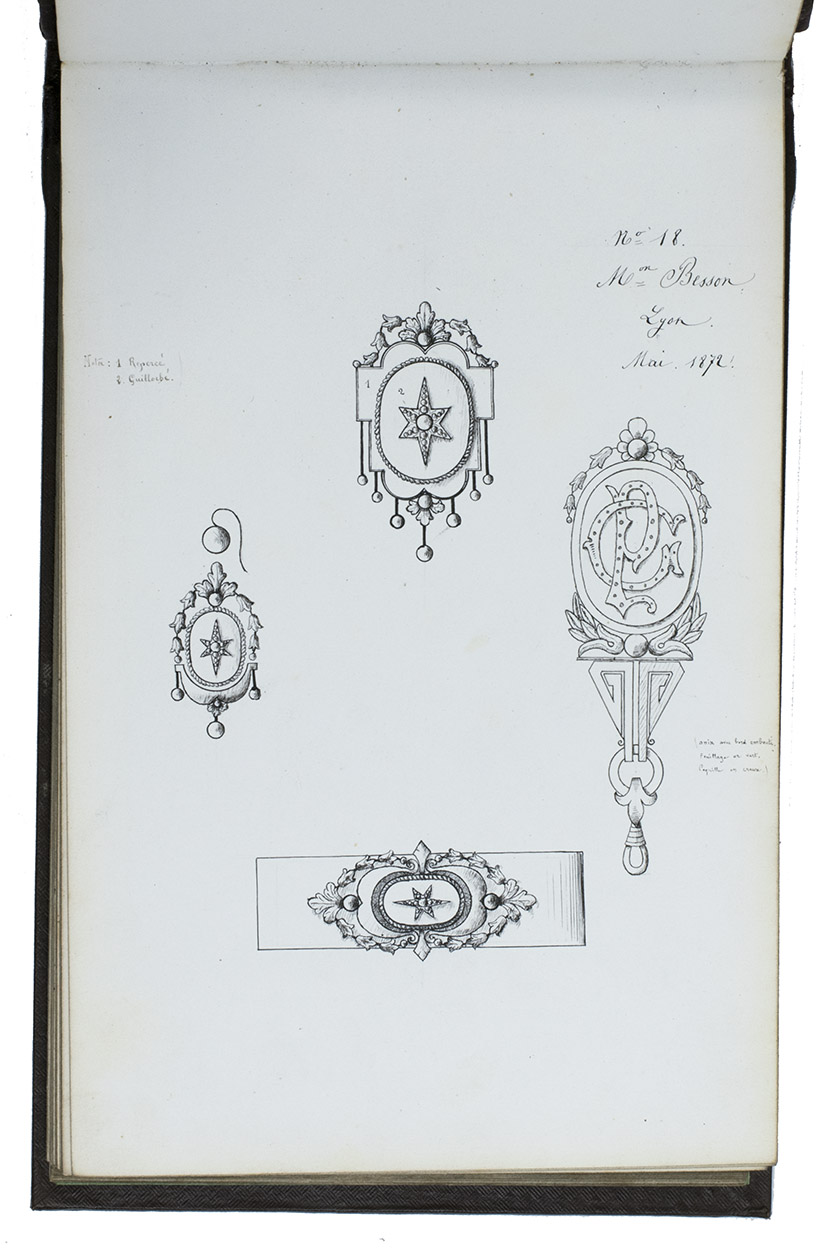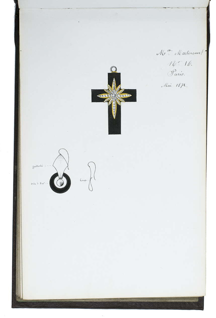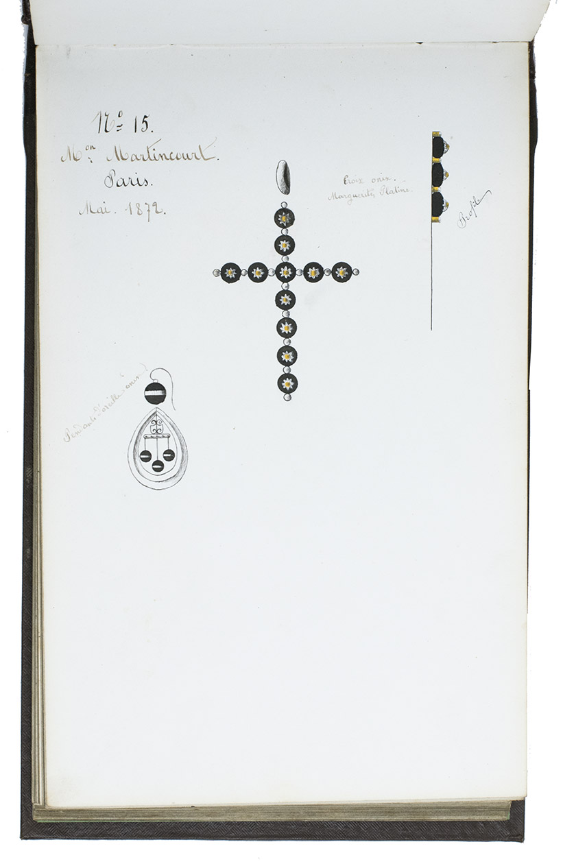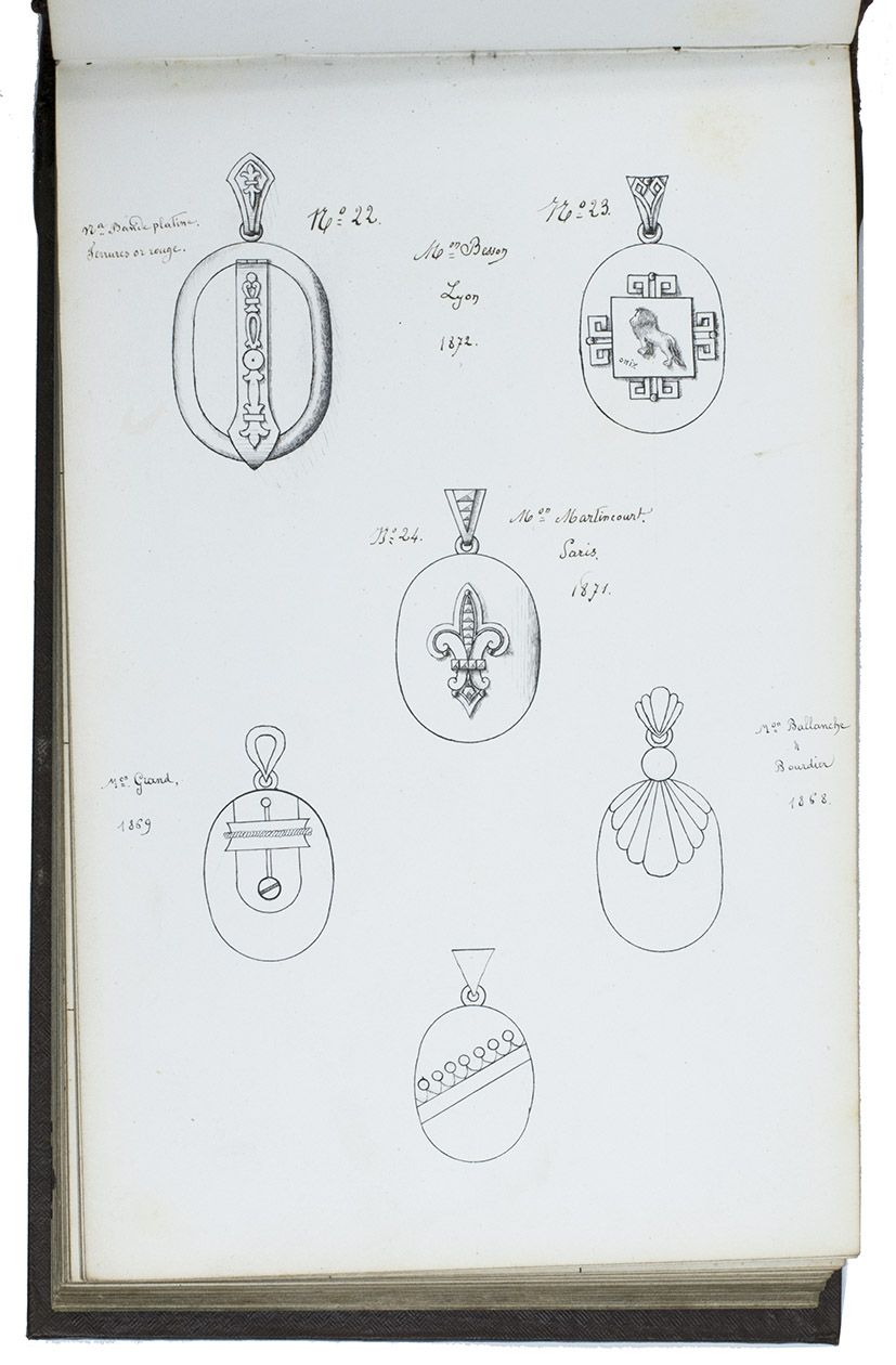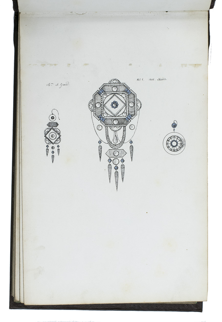 Model album for jewelry, probably from a Parisian luxury jeweler, with 101 ink drawings of jewelry models and designs. All drawings by the same anonymous hand. The first 59 drawings are numbered 1-59 and have French comments added in neat handwriting that provides the name of the jeweler that produces the jewelry pictured, the place where the jeweler is active and the date when the model first came on the market. All jewelers mentioned are from Paris, except for Besson from Lyon. These are: Grand, Martincourt, Ballanche & Bourdier, Loussel et Vacherot, Galerie Vivienne, Goliat, Magasins du Boulevard des Italiens and Magasins du Palais Royale. The dates range from 1868 to 1872. Each numbered model is accompanied by a short descriptive text giving details about the material and sometimes the popularity. The catalogue includes earrings, brooches, medallions, crosses, bracelets, hairpins, badges, clasps and a diadem, made of silver, gold and platinum, using pearls and precious stones such as rubies and onyx. The rest of the designs, without numbers or text, may be the jeweler's own designs.