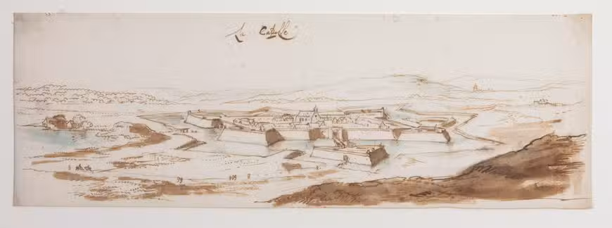 17th-century drawing giving a bird's eye view of the fortified French town La Capelle (Aisne). Probably after the similar view published in Mathaeus Merian's Topographia Galliae (1655-1661).