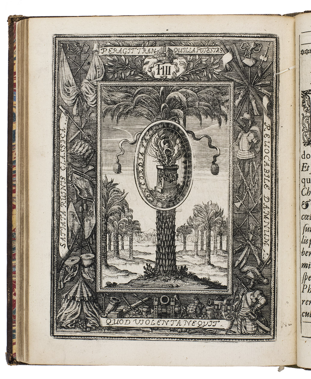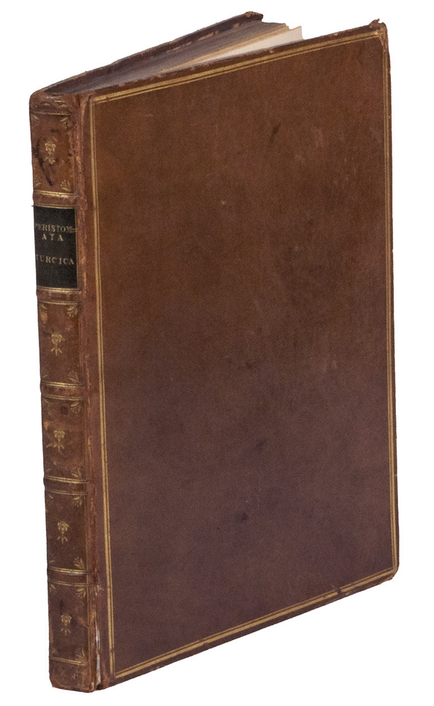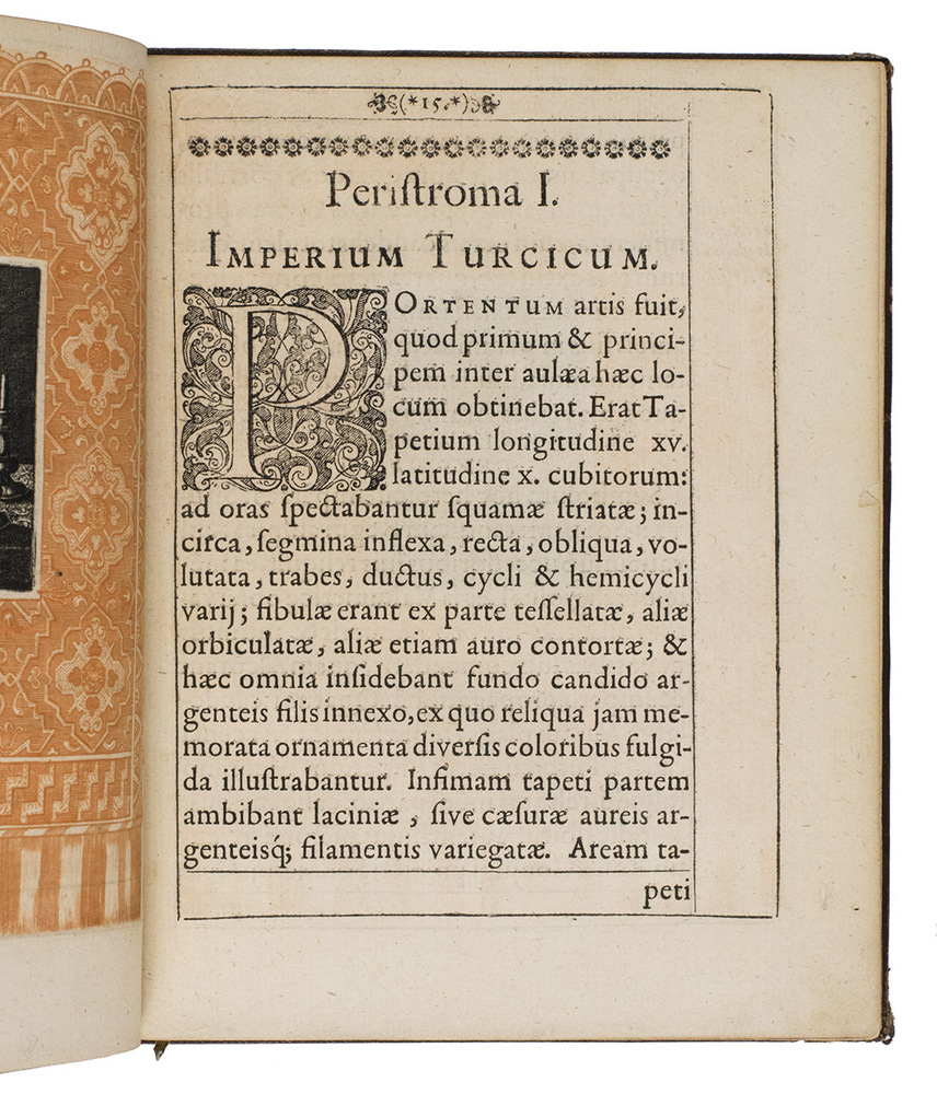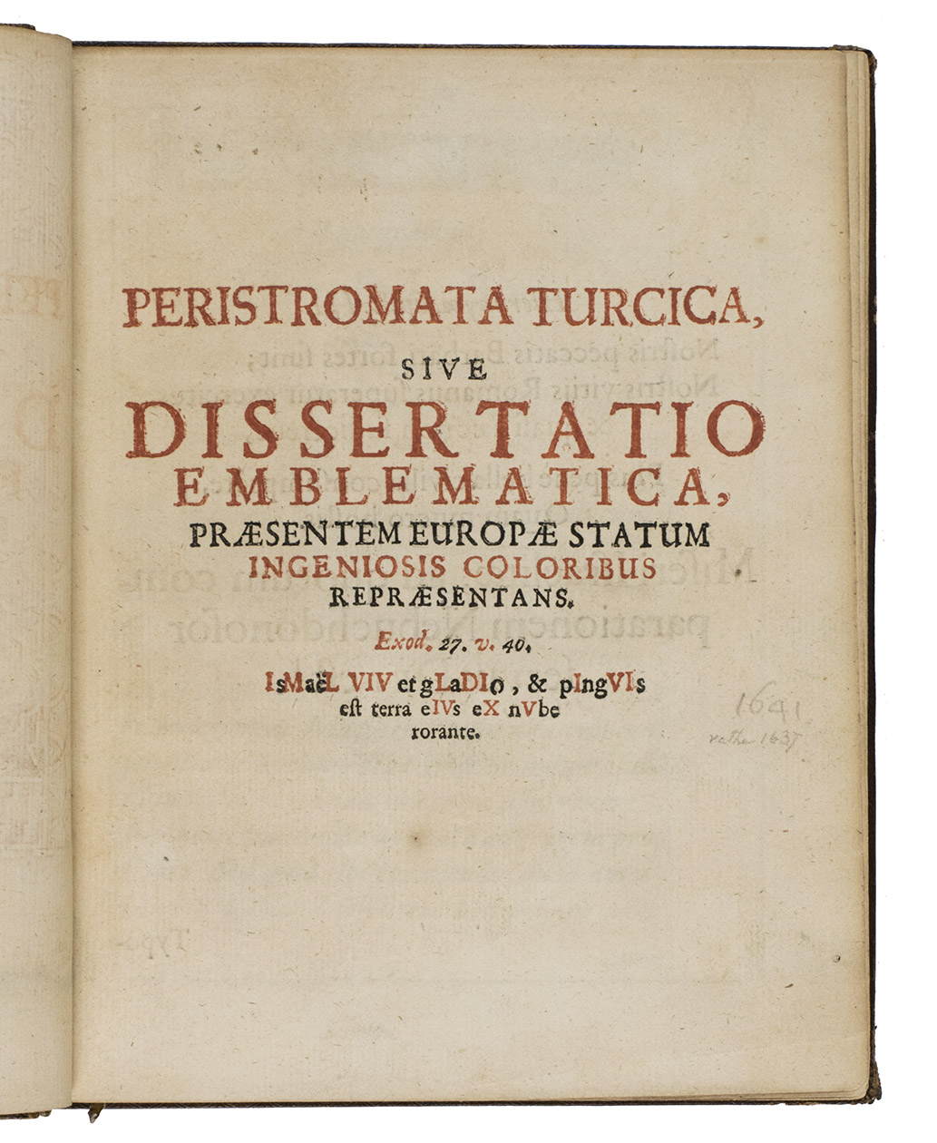 Rare first and only Latin editions (probably the first and only early editions in any language) of four closely related polemical pamphlets on European policy toward the Ottoman Empire. The publication was instigated by the prominent Nürnberg poet and jurist Georg Philipp Harsdörffer (1607-1658), who somehow got access to the French manuscripts of the pro-Richelieu Peristromata Turcica (Turkish carpets), and the anti-Richelieu Gallia deplorata, translated them into Latin, edited them for publication and added what is believed to be his own anti-French Latin rebuttal of the former, Germania deplorata. On 26 November 1641 he sent all three to the Calvinist Prince Ludwig of Anhalt-Köthen, founding president of the Fruchtbringende Gesellschaft in Weimar, who found the Peristromata Turcica shocking and dangerous, not only for its content but also because its remarkable and "seductive" graphic form. At a spring 1642 meeting of the society Ludwig initiated the writing and production of an emblematic rebuttal, the Aulaea Romana (Roman tapestries). Besides the political importance of these pamphlets as records of differing European attitudes toward the Ottoman Empire, they are remarkable graphic and typographic artefacts, early examples of colour printing and important emblemata.