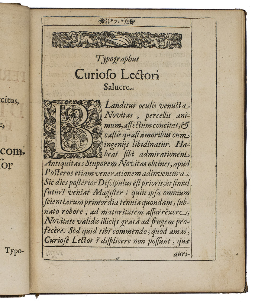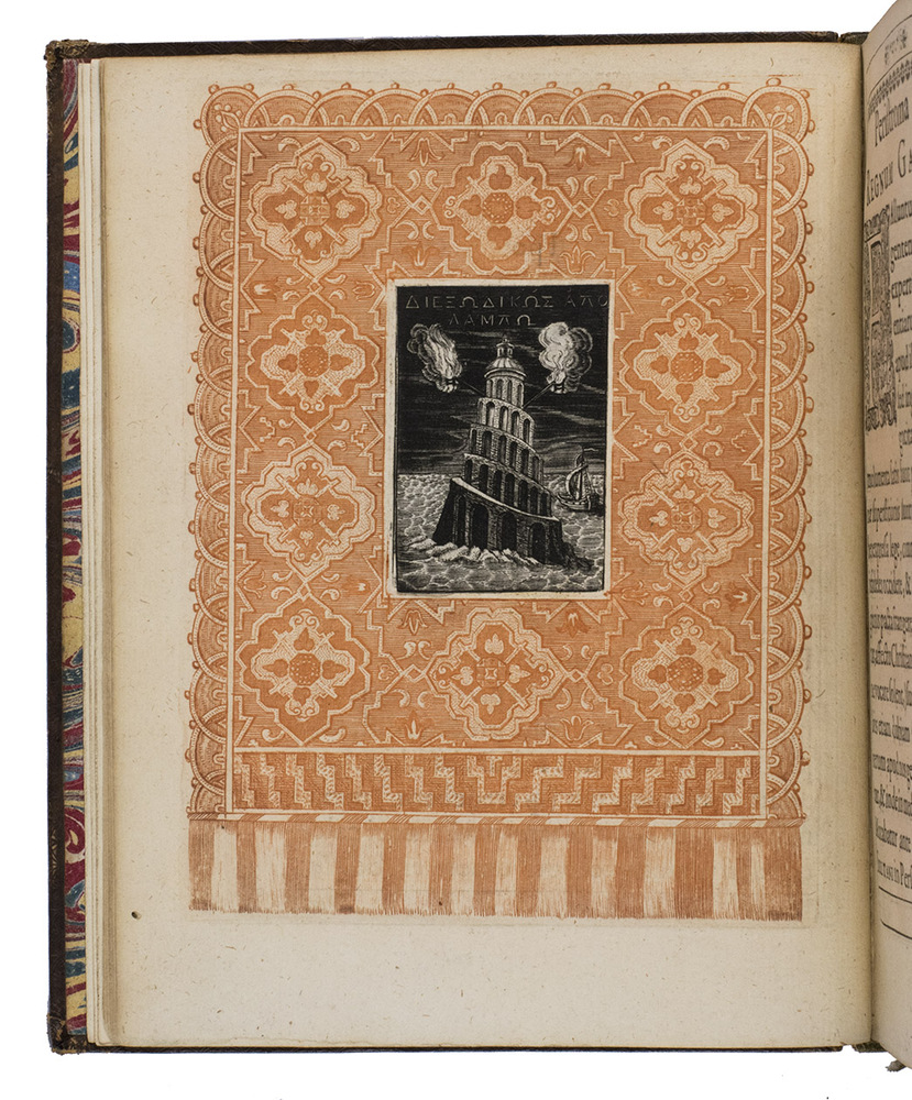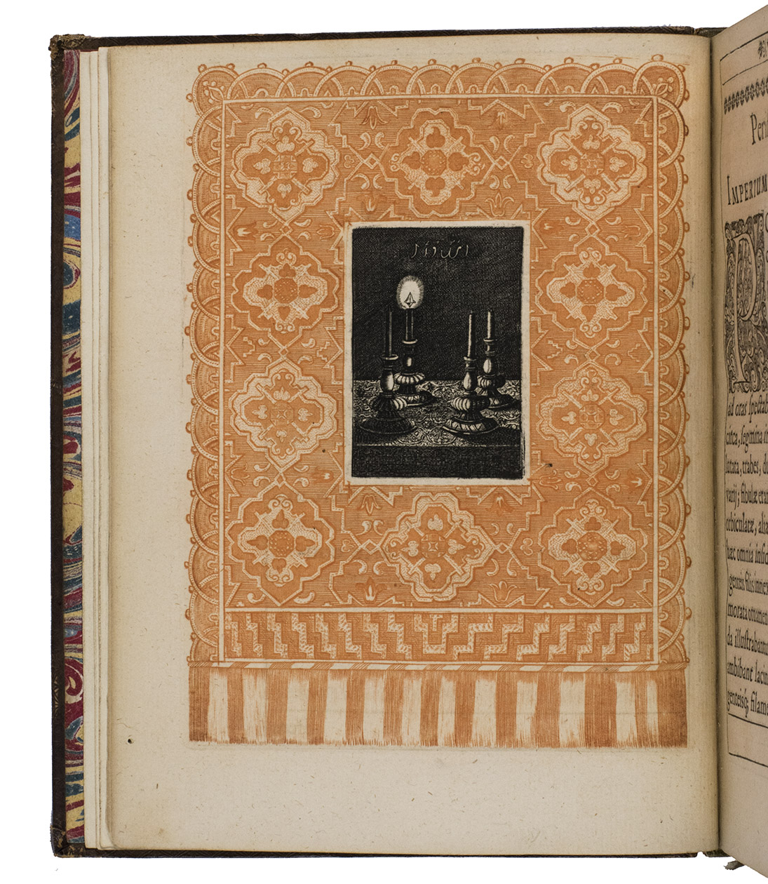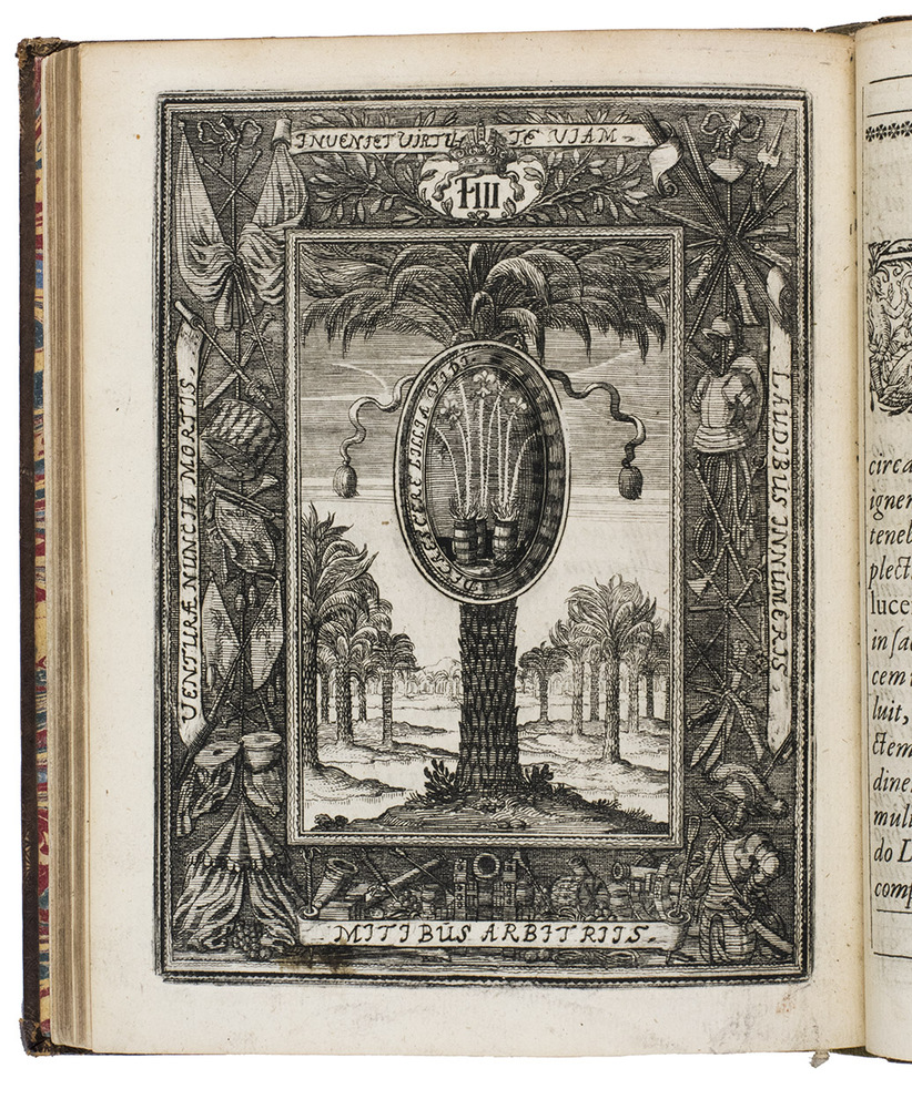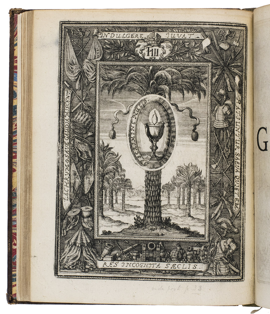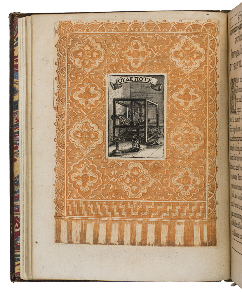 [Nürnberg, Wolfgang Endter] (ad 1 with a false colophon: Paris, Toussaint du Bray), [each title-page with a chronogram:] 1641 (ads 1-2, 4) & 1642 (ad 3). 4 editions published together in 1 volume. 4to. With 4 letterpress title-pages in red and black, each with the date in a chronogram, 2 engraved title-plates plus 12 full-page engraved emblematic illustrations, all on integral leaves, each with a small plate nested in a larger plate (7 in the Peristromata with a varying rectangular central plate in dark blue or black and the same outer plate of a Persian carpet in orange; 7 in the Gallia with a varying oval central plate and the same outer plate representing peace with the palm tree in a landscape device of the Fruchtbringende Gesellschaft and a border representing war with military attributes). Further with 5 woodcut head- and tailpieces (plus 8 repeats), 21 "woodcut" decorated initials (5 series, at least some actually metal castings made from woodcuts) plus 8 repeats, and cast vine-leaf ornaments, acorns and other fleurons. Set in roman and italic types with incidental Greek and Hebrew. Light brown calf (ca. 1820?) by Charles Murton (ca. 1795?-ca. 1860?) in London, with his stamp on the front paste-down, sewn on 5 cords, gold-tooled spine with black morocco label, gold thick-thin fillets on boards, gold-tooled board edges, blind-tooled turn-ins, curl-marbled endpapers (white, red, blue, yellow and blue-green in that order), and an orange silk ribbon marker. 46, [1], [1 blank]; [3], [1 blank], 34; 64; 51, [1 blank] pp.