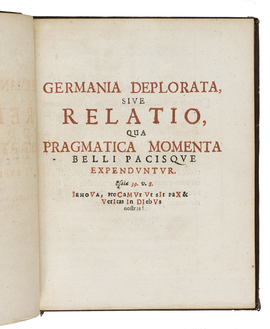 (2) [HARSDÖRFFER, Georg Philipp]. Germania deplorata, sive relatio, qua pragmatica momenta belli pacisque expenduntur.