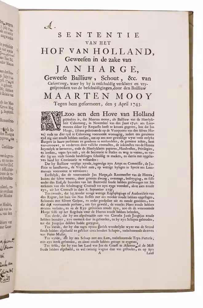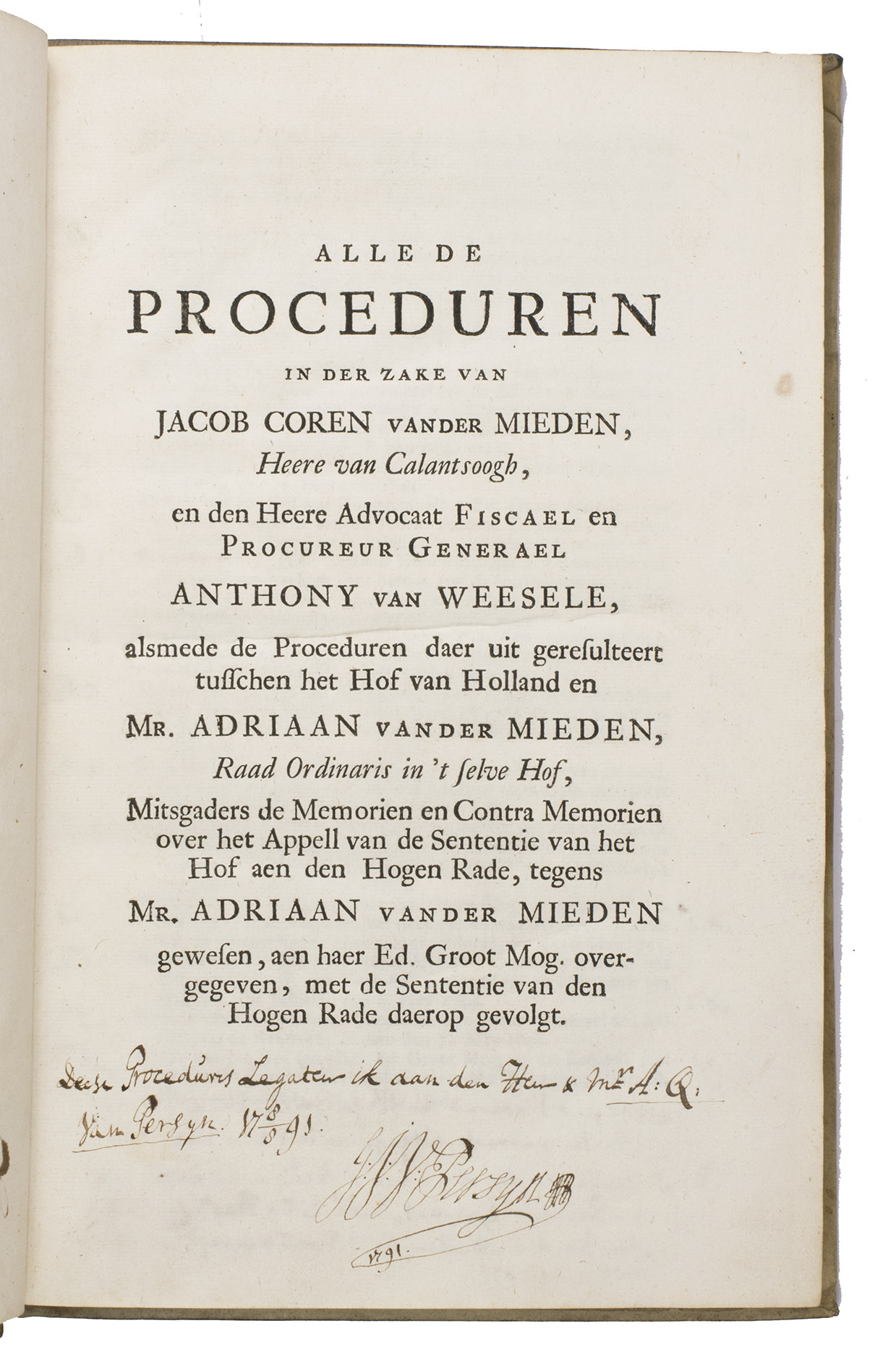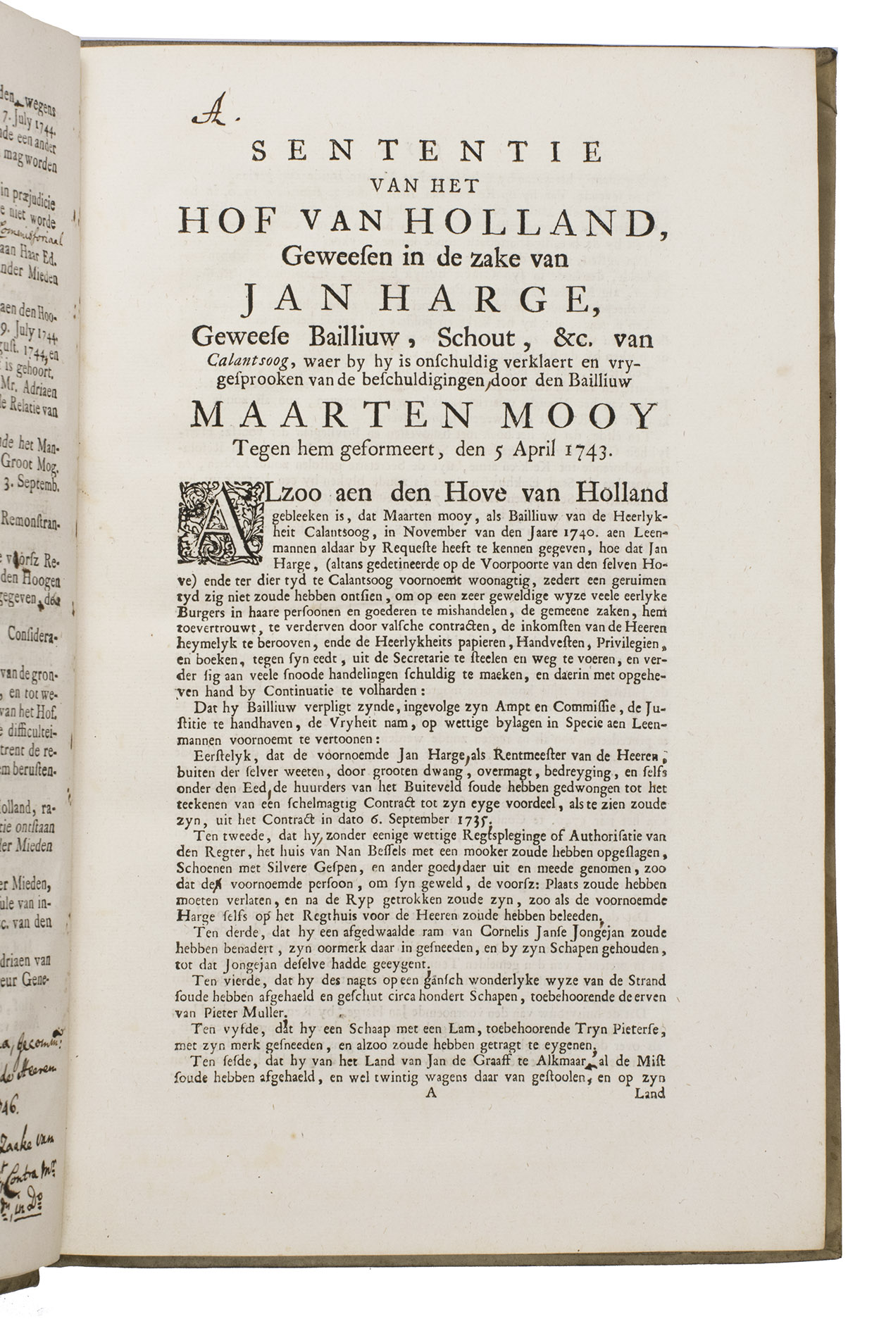 With a manuscript annotation on the title page signed by G.J. van Persijn, 1791. Govert Jan van Persijn was a lawyer (advocaat) at the Court of Holland, Antonius Quirinus van Persijn was his son. Govert Jan van Persijn also added letters to the index and occassionaly made some marginal annotations and corrections in the text. The binding is slightly dust soiled, otherwise in very good condition. J.G. Gijsberti Hodenpijl van Hodenpijl, Extracten uit de crimineele ordonnantien van Holland (gives the pamphlets individually); STCN 240322061 (3 copies); WorldCat 1144496082, 1258013052 (3 copies, also in STCN); not in De Buck; Knuttel; Tiele.