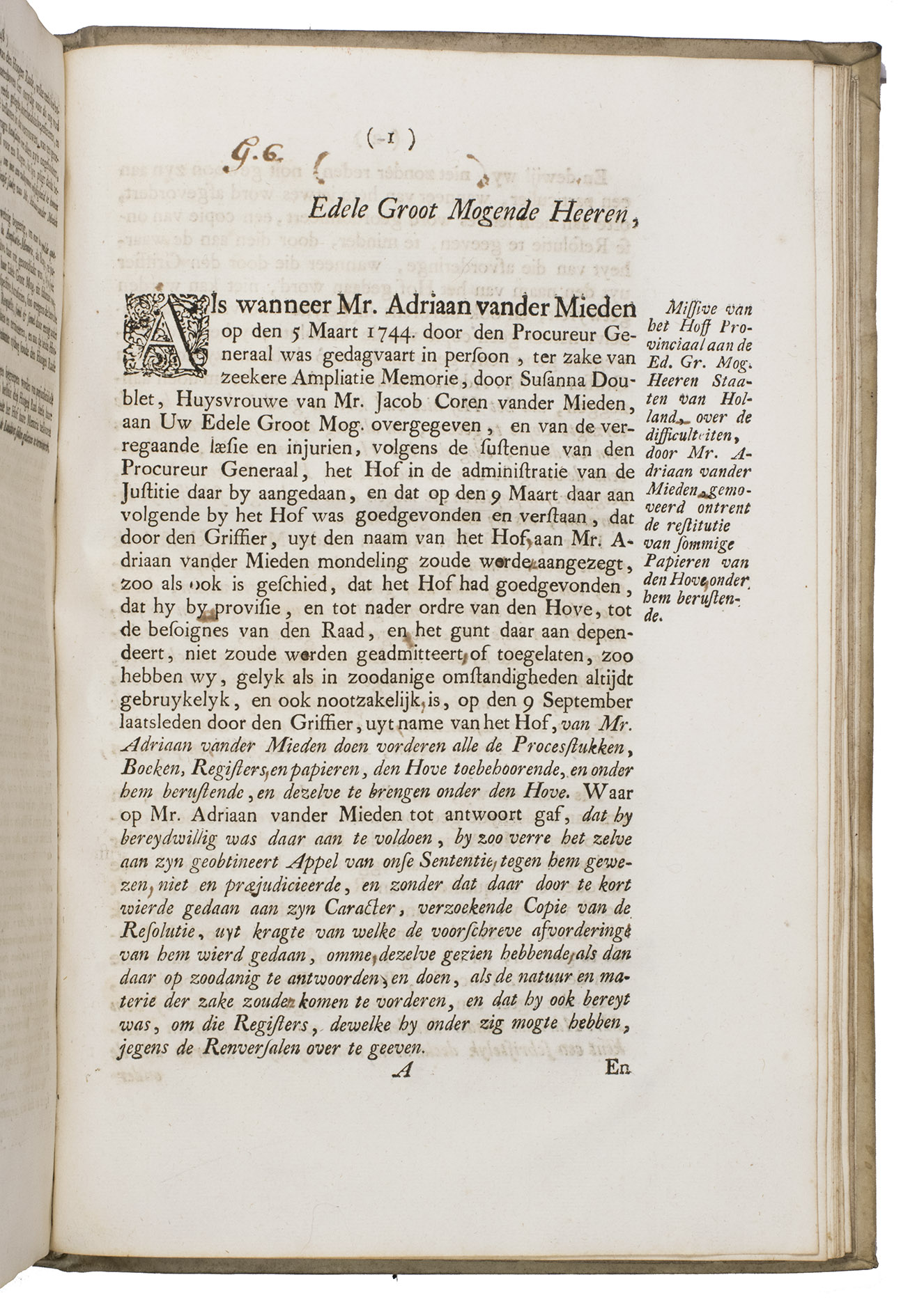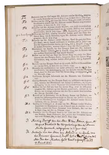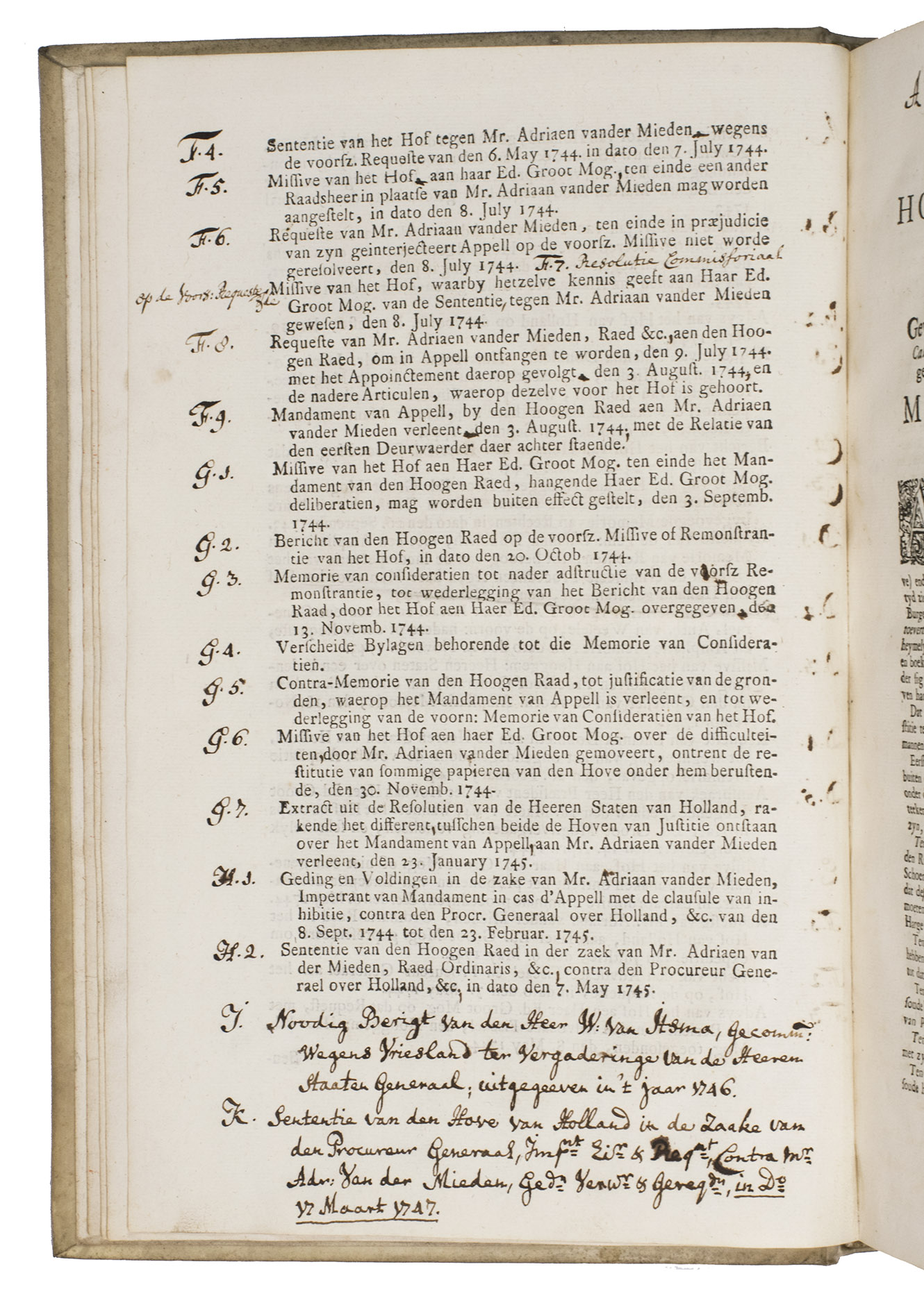 Rare collection of missives, ordinances, petitions, and extracts from resolutions concerning the conflicts surrounding and law proceedings concerning Jacob Coren van der Mieden (1698-1751). He fled his hometown of Alkmaar in fear he would be captured by the Court of Holland. Initially, the Van der Mieden family was a wealthy noble family with a good reputation. Jacob's father Aris was mayor of the city of Alkmaar, Jacob was appointed bailiff of Nieuwburgen in 1731. Here, one of his judicial officers ran a reign of terror. The people felt that bailiff Jacob was protecting his officer, which made him very unpopular. Jacob was also lord of Callantsoog, where he imprisoned the former bailiff, Jan Harge, in 1740 after Harge was being accused of abuse of office. The problem was that he did so under such bad conditions, that the wife of Harge complained to the Court of Holland, after which Harge was exonorated and the Court of Holland turned to Van der Mierde. Out of fear of being put behind bars he fled to Lent, near Nijmegen. His wife, Susanna Doubleth, appealed the court and advocated that her husband would be tried by the local court in Alkmaar instead of the Court of Holland. These request are added in this collection. The last ordinance in the collection is the conviction of his younger brother Adriaan, counselor of the Court of Holland, who was accused of co-writing the requests with Susanna, which were quite libel and defamatory, undermining the Court of Holland as the highest judiciary institution of Holland. Adriaan was suspended from the court in 1747. The fate of Jacob van der Mieden remains unclear.