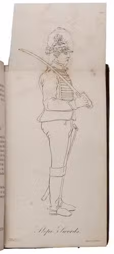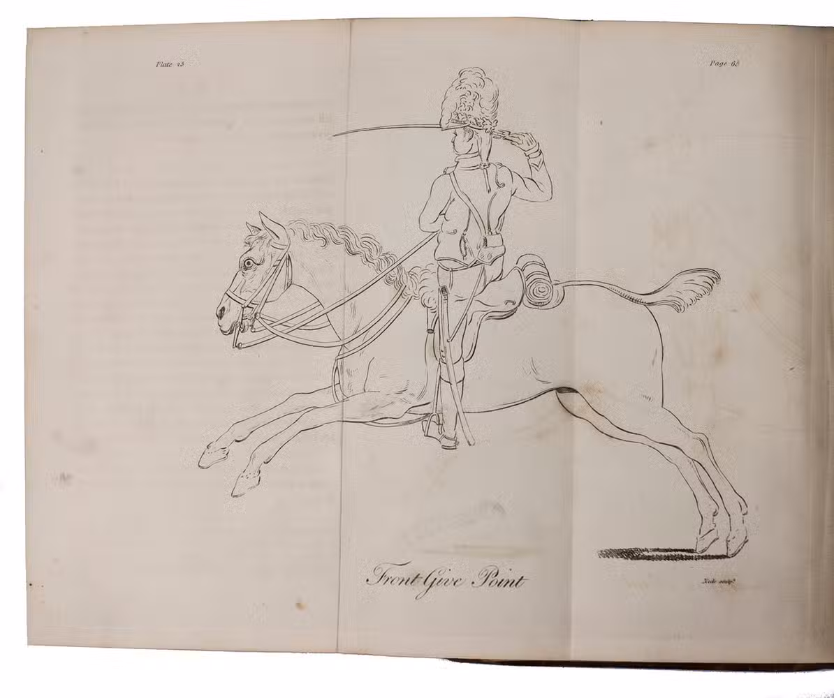 John Gaspard Le Marchant (1766-1812) was a major general of the English cavalry. After fighting in Flanders, he realised that the swordsmanship of the cavalry from other countries was far superior to his own, as the British often slashed either themselves of their horses by accident. Determined to change this, he first began to practice himself. However, he found that the sword was actually too long to be easily used on horseback, so designed a new, shorter one, based on the measurements of Andrea Ferrara, a 16th-century Venetian swordmaker. His design remained in use for 20 years. He then established the Royal Military College at High Wycombe, and the Army Staff College at Camberley, to properly train officers. With King George III's approval, he also wrote the present work, which became the first British centrally standardised sword fighting manual.