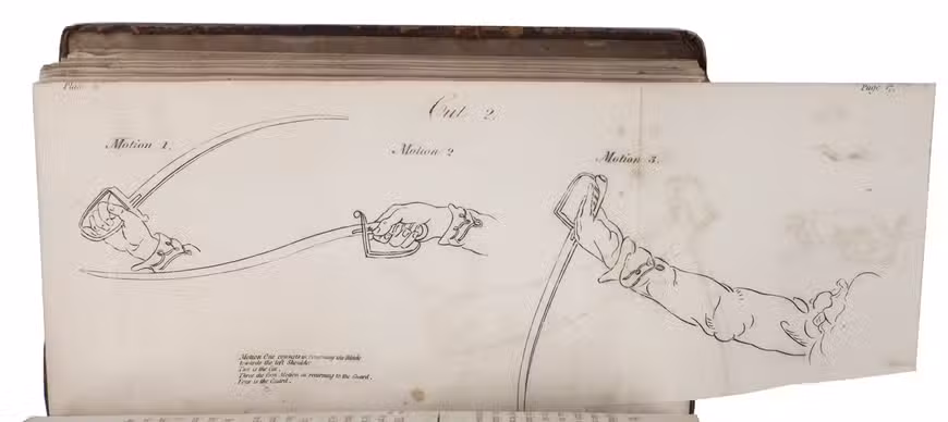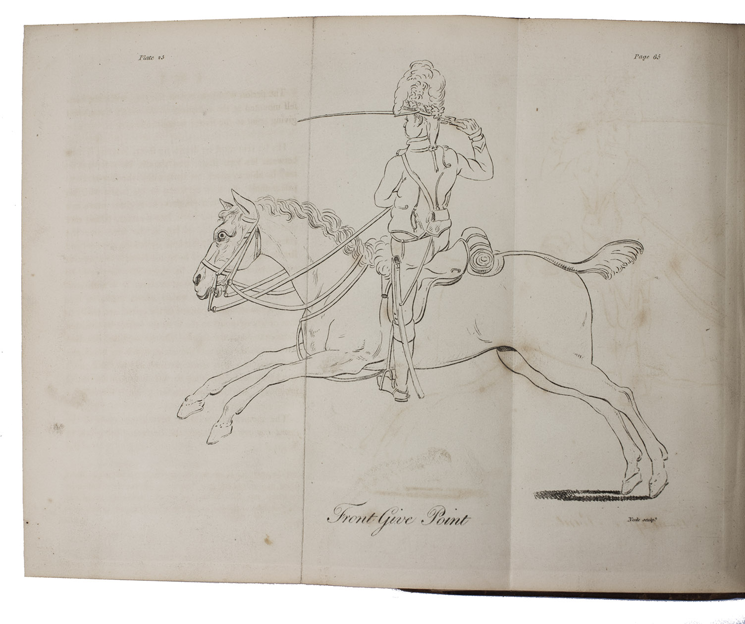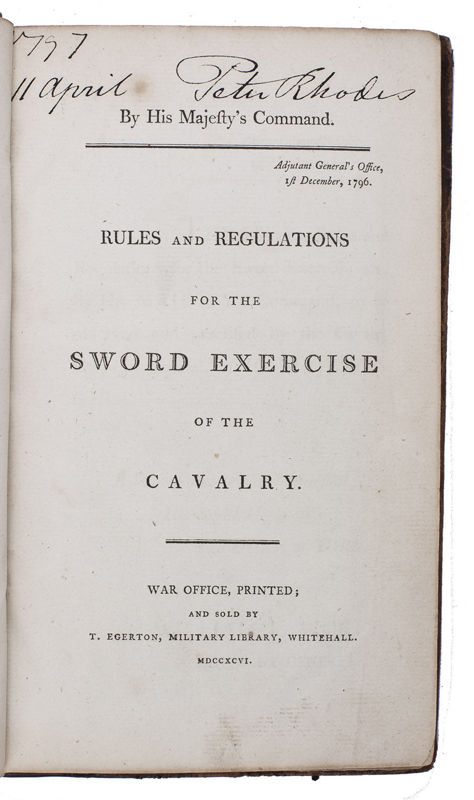 With a contemporary ownership annotation ("797, 11 April Peter Rhodes") on the title page. The work has been rebacked, with the original title label laid down, the edges and corners of the boards are scuffed, the boards have been scratched and chipped, resulting in some loss of leather on the back, which has been filled in with a dark paint. The work is slightly browned and foxed throughout, a few plates are slightly torn along the fold, the margins of some of the plates have been cut smaller to ease folding, without affecting the image, lacking the final blank. Otherwise in good condition. Pardoel 919.01 (under Fawcett, William); Thimm, p. 250; Yallop, H., "The sword exercises of the British Cavalry: 1796-1858," in: Acta periodica duellatorum, 8, (1), 2020, pp. 123-156.
