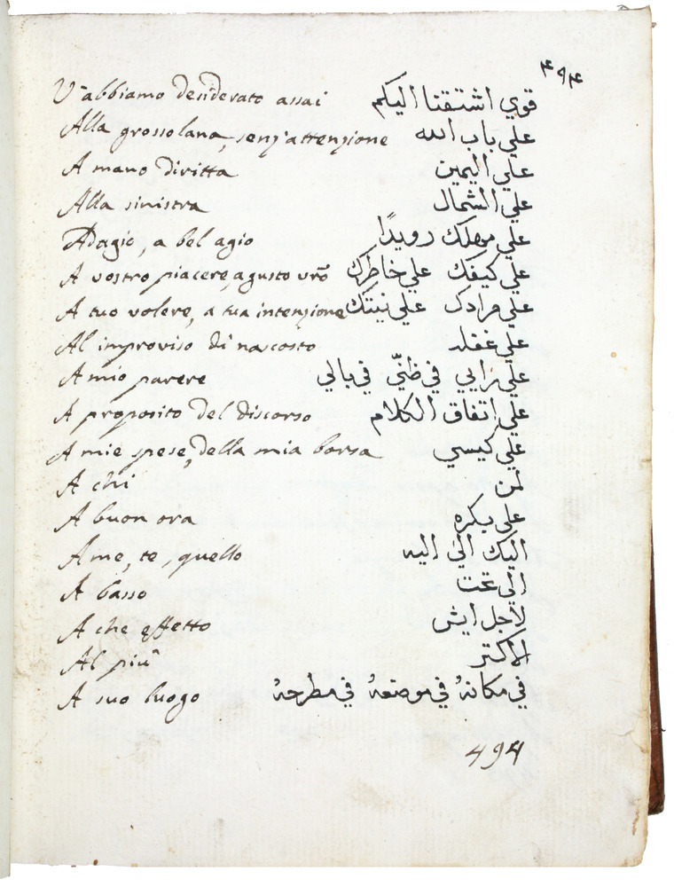 [Probably Egypt, ca. 1770]. 4to (ca. 17 x 22 cm). Arabic and Italian manuscript on paper, 19 lines per extensum, paginated throughout from right to left. Near-contemporary brown leather with a blind-stamped oriental rosette as a center piece and similar style corner pieces on both boards, a (partial) manuscript title label on the spine. 494 pp.