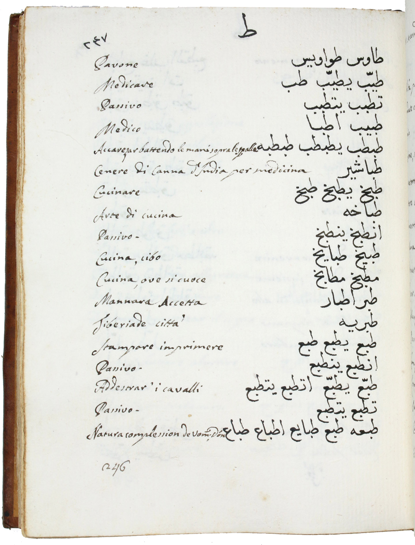 Manuscript dictionary comprising some 9,000 Arabic terms and their Italian translations. It was formerly owned by the German oriental scholar and Franciscan priest Arsenius Rehm (1738-1808), who lived in Cairo between 1769 and 1776, building a large collection of manuscripts, which he brought with him when he worked for some time at the Franciscan abbey of Frauenberg at Fulda, Hesse. After his death his collection remained at the monastery until it was purchased by the Benedictine Abbey of St Boniface (Munich) in 1852. The present volume, which had not been part of the collection proper, remained in Frauenberg, whose library was dispersed in 2021 by the Franciscan Province. "The library includes a fairly extensive Arabic dictionary of his, though not written by him. It offers only the Italian translation of the Arabic words. In the Arabic style it begins, from our perspective, at the end" (cf. Bihl).
