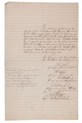 Declaration signed by five captains of five different Dutch vessels moored in the harbour of Sydney, Australia, stating that the meat on board of the bark (vessel) Willem Ernst for the provision of the crew was not rotten or badly smelling, but only needed a new salting (pickling). The pencil annotation by J. Hendriks suggests that the inspection of the meat took place in the context of the well-known "Victorian gold rush", which started in 1851. The sailors of the Willem Ernst would have complained about the meat because they wanted to find a pretext for deserting the ship in order to become gold diggers.