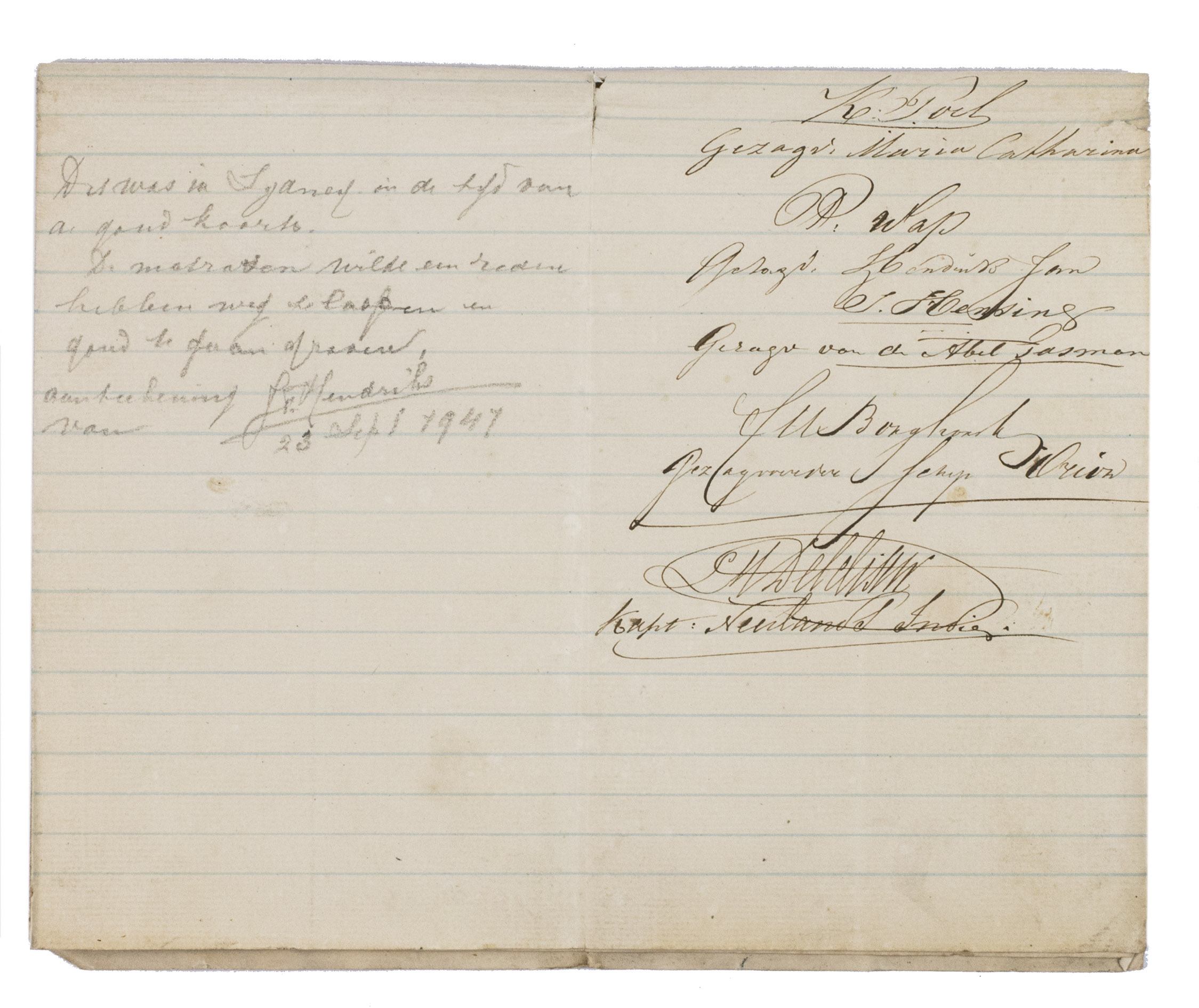 The declaration is written on the recto of the first leaf of a blue-ruled double-leaf and signed on board of the Willem Ernst in the harbour of Sydney on 24 December 1853. The five captains had inspected the meat on request of the captain of the Willem Ernst, Batholomeus Justus Doornik (1802-1867), and the butcher, Edward OHara (1811-1863), living in Sydney. The five captains were: Klaas Poel (1819-1858), captain of the Maria Catherina (built in 1852); P. Wap, captain of the Hendrik Jan; J. Henting, captain of the Abel Tasman; Cornelis Marinus Borghorst (1811-?), from 1848-1859 captain of the Orion; and L. M. Delcliseur, captain of the Neerlands Indië.