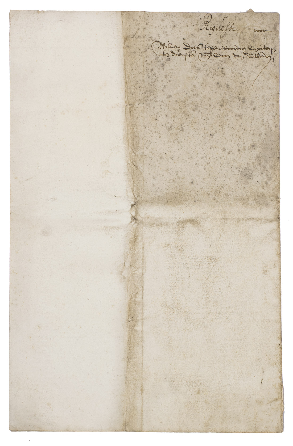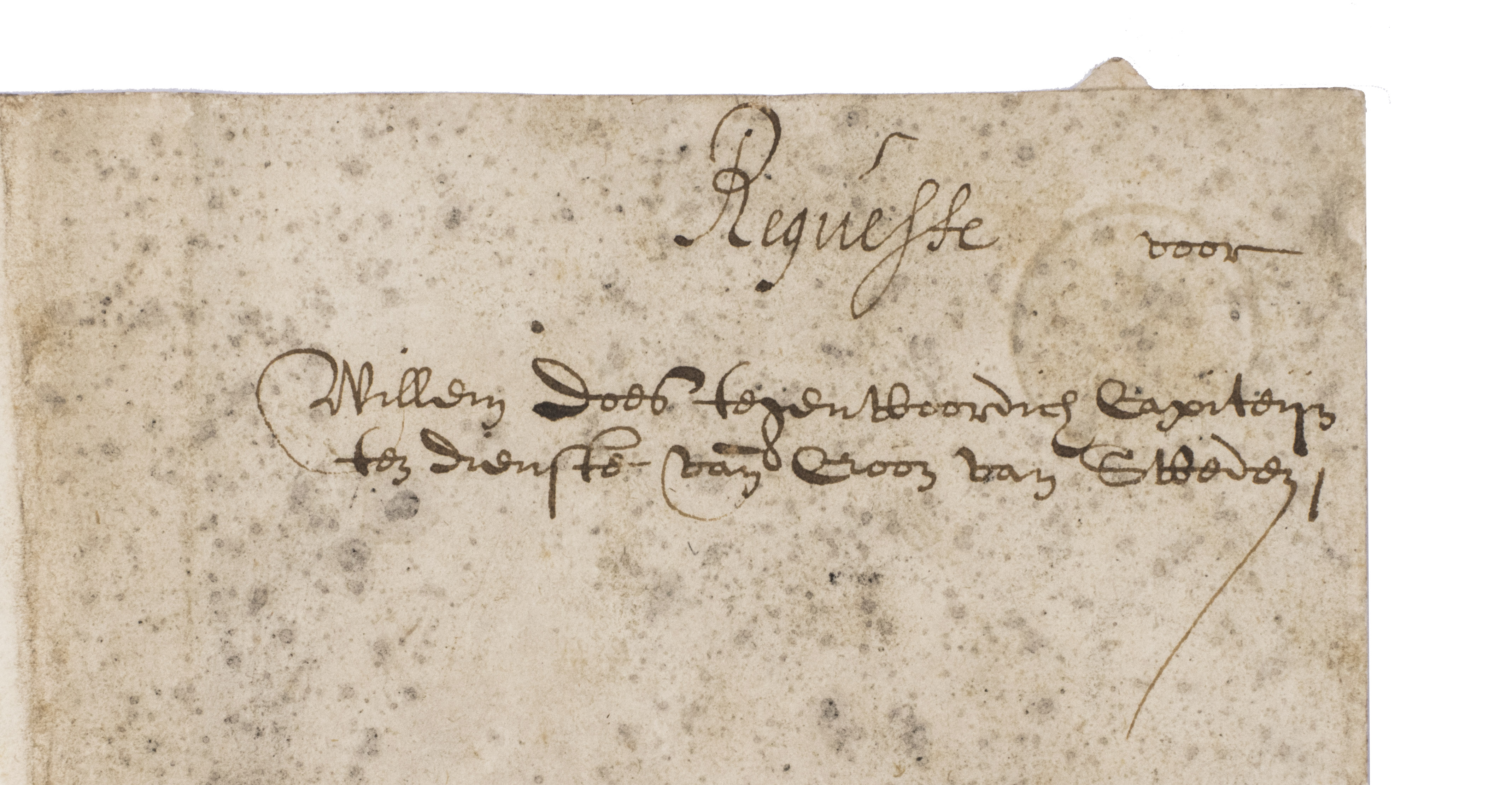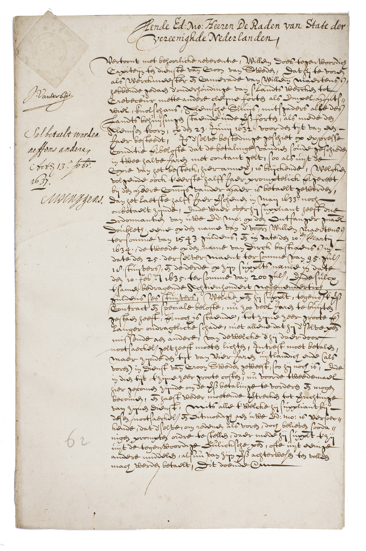 Manuscript document concerning the unpaid wages of Willem Does (and Willem Maertens?) by the goverment of the Dutch Republic for their work on certain fortifications and related buildings. At two-thirds of the text, the total sum owed to Does (and Maertens) is underlined: "t'samen bedragende sestienhondert negen en dertich guldens ses stuijvers" (1639 guilders and 6 stuivers). Willem Does repeatedly mentions that they are owed the money and that he had applied for payment a few times before without success. The fact that they had not received the money for their work meant that he still owed money to others which he could not yet pay but was costing him extra due to interest that was charged and that that he had to return to The Hague specifically for the collection of the money which took great effort since he was now in the employ of the Swedish crown.