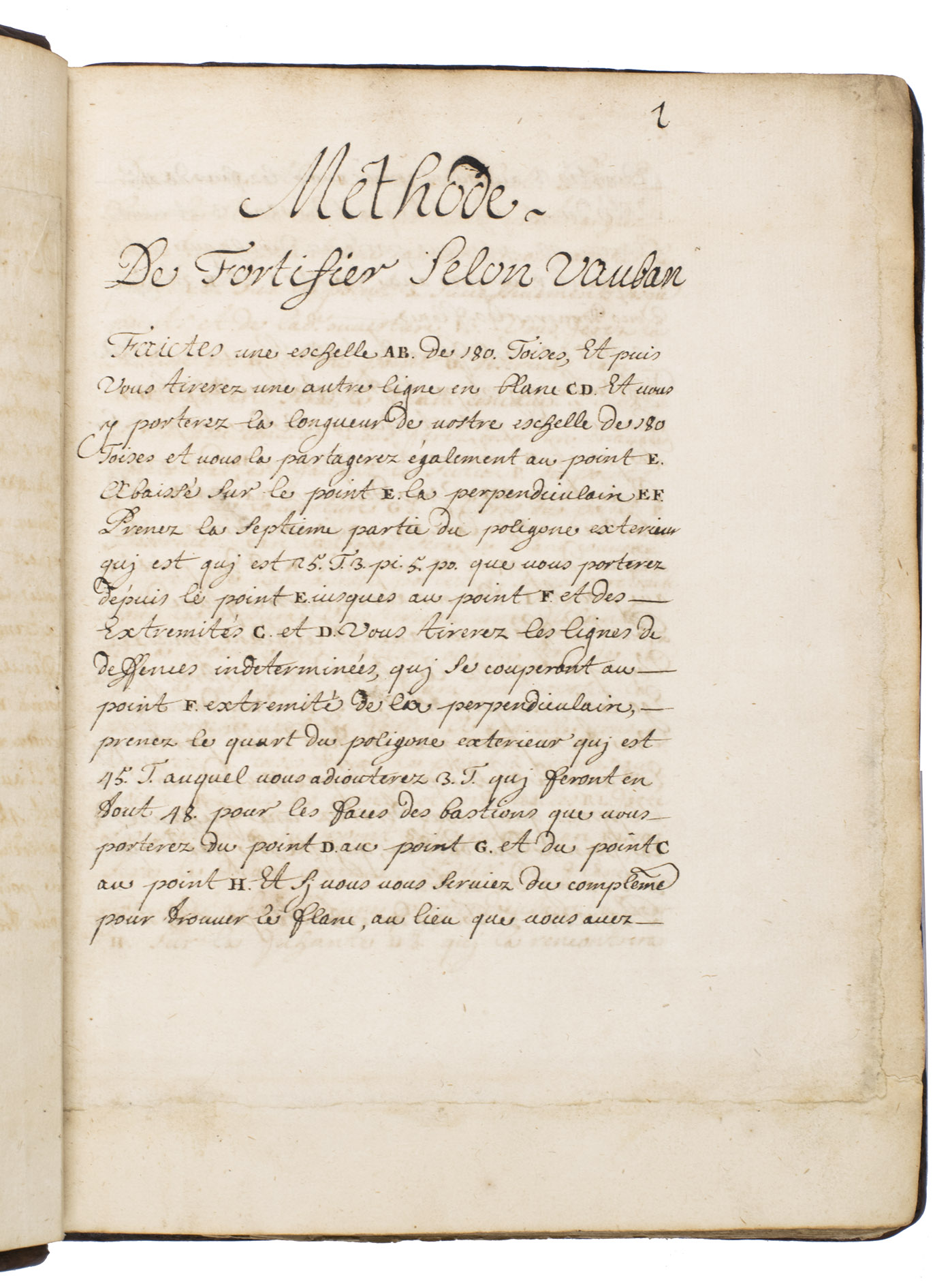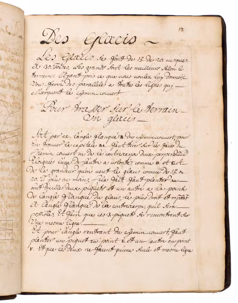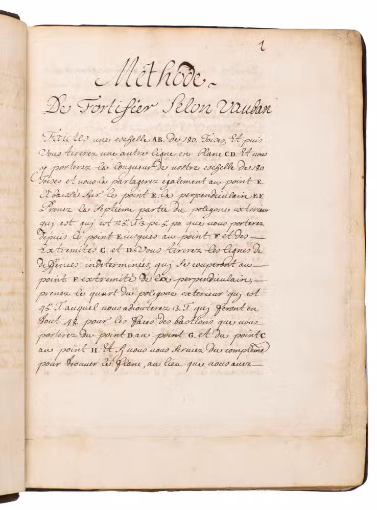 The text notes in several places that it is based on the work of Sébastien Le Prestre de Vauban (1633-1707), so it was almost certainly written after he began to publish his work on fortification in 1673, and probably no earlier than the 1680s, when he fully developed his methods and published more detailed works on fortification. Although written in French it seems likely to come from northern Germany.