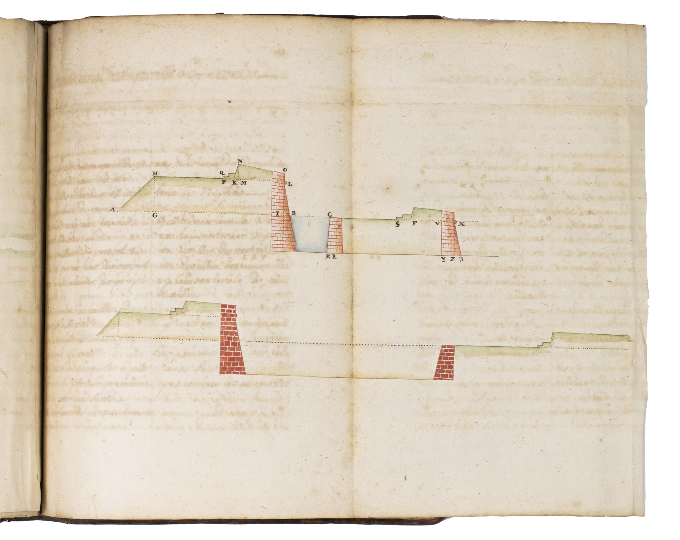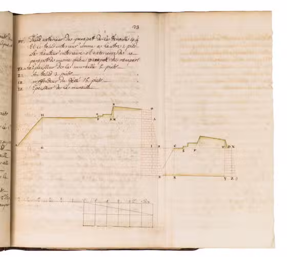 An extensive manuscript manual on fortification in French, discussing the design, construction and defence of a wide variety of regular and irregular fortifications, gates, bridges, etc., and with chapters on attacking fortifications, mines and other subjects. It is extensively illustrated, including many full-page or folding fortification plans, with one folding fortification plan and one folding cross-section of fortifications in colour.