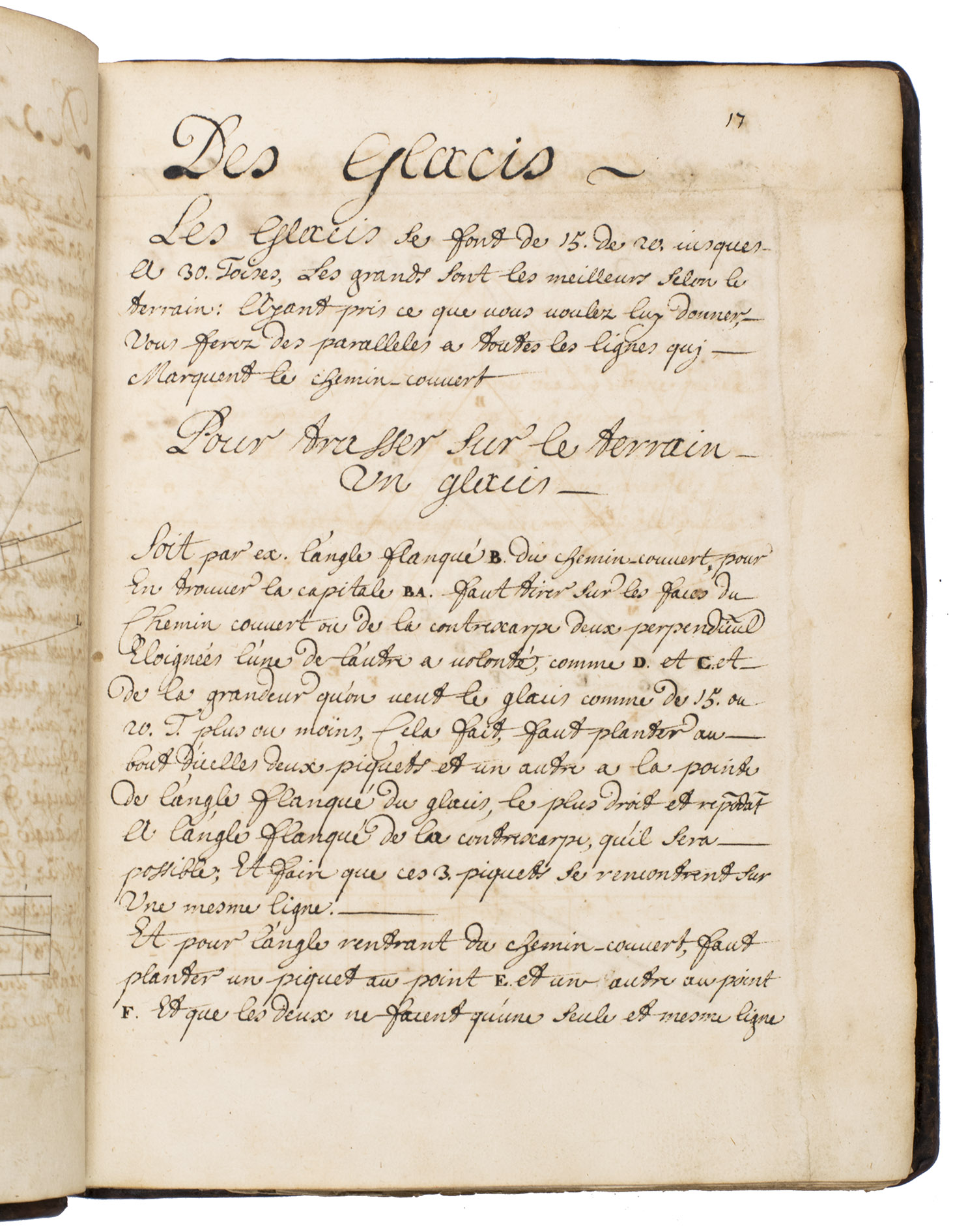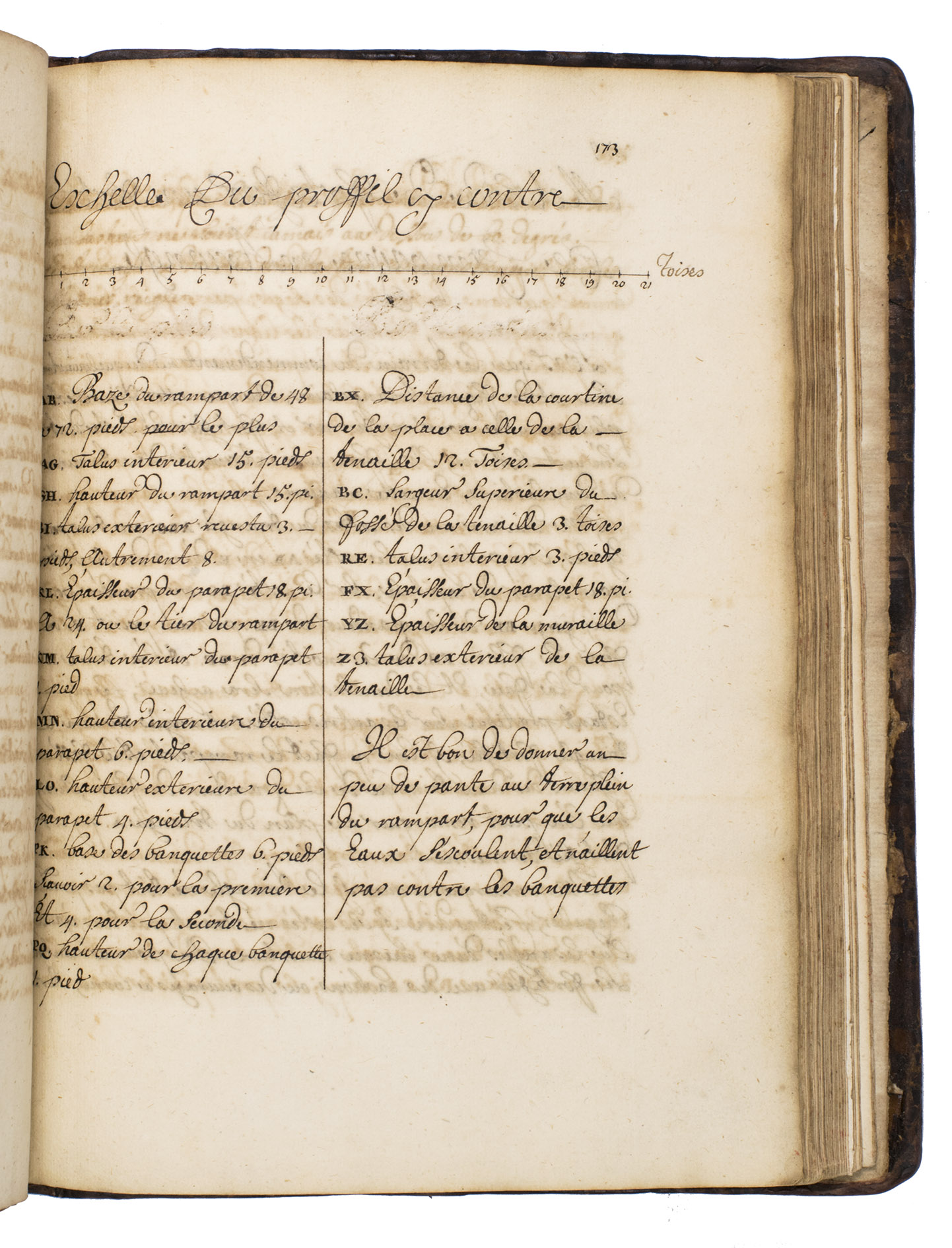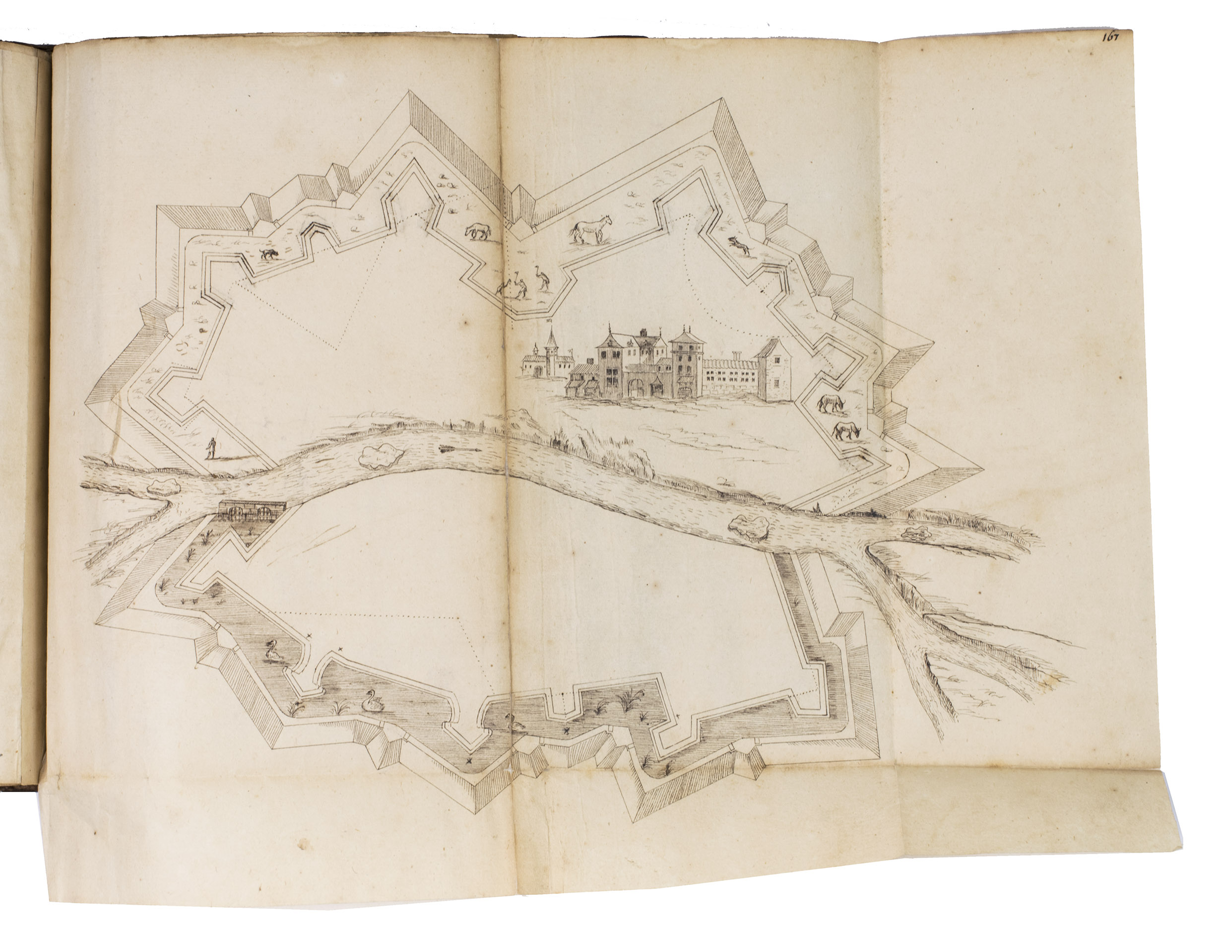 [Northern Germany?, ca. 1685/1700?]. 4to & small folio (23 x 18 cm). Manuscript in French, written in black ink on paper in an easily readable cursive hand, with the title in a pen and ink decorated cartouche, about 45 pen and ink drawings (14 full-page and 8 larger folding, 2 of the folding ones in red and black ink with coloured washes, one of the colour folding leaves 36 x 27 cm), mostly showing fortification plans. Contemporary or near-contemporary calf, gold-tooled spine. [1], [3 blank], 164 pp., ll. 165-171, [172], pp. 173-197, 197 [bis], 198-289, [24 blank, partly numbered].