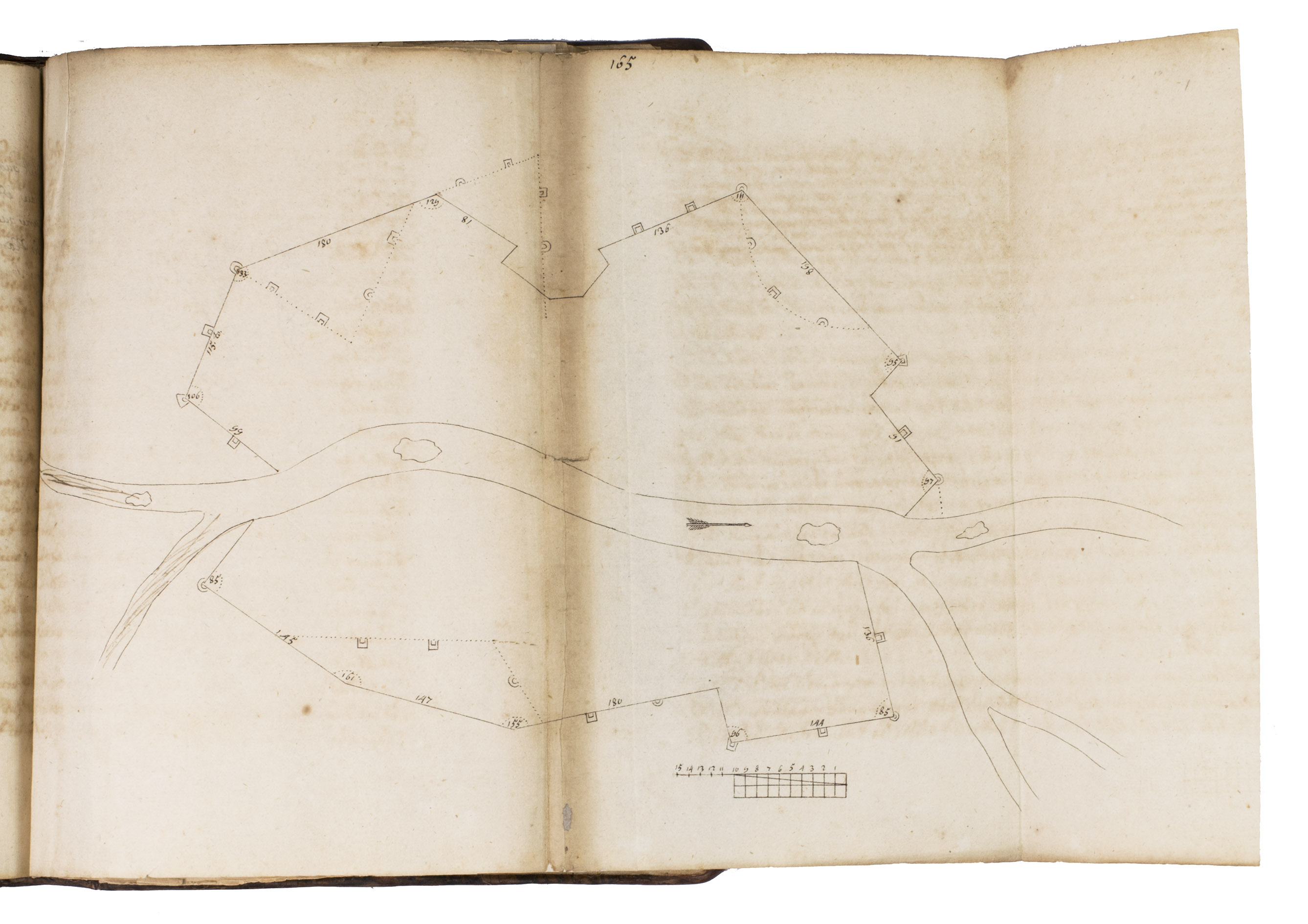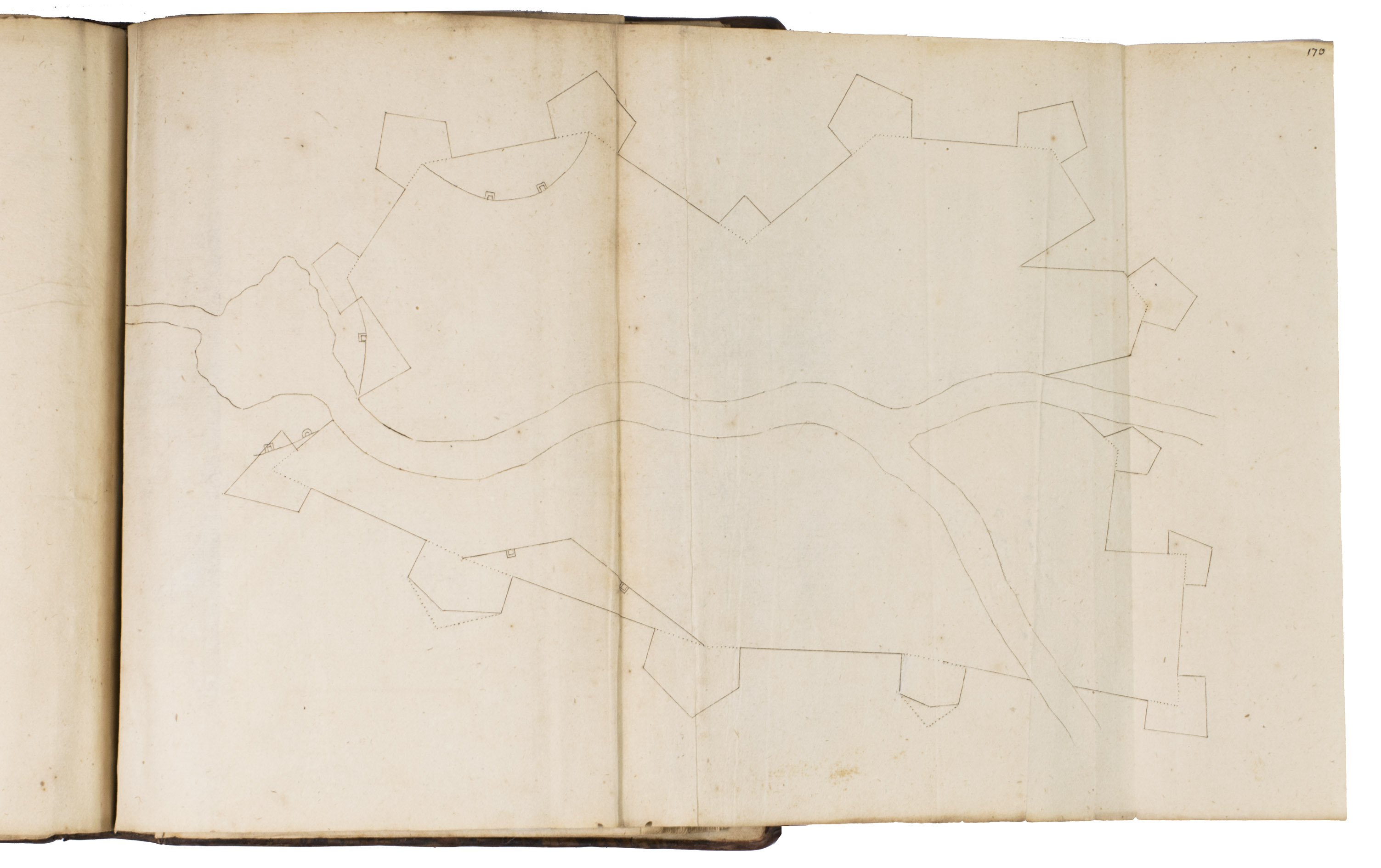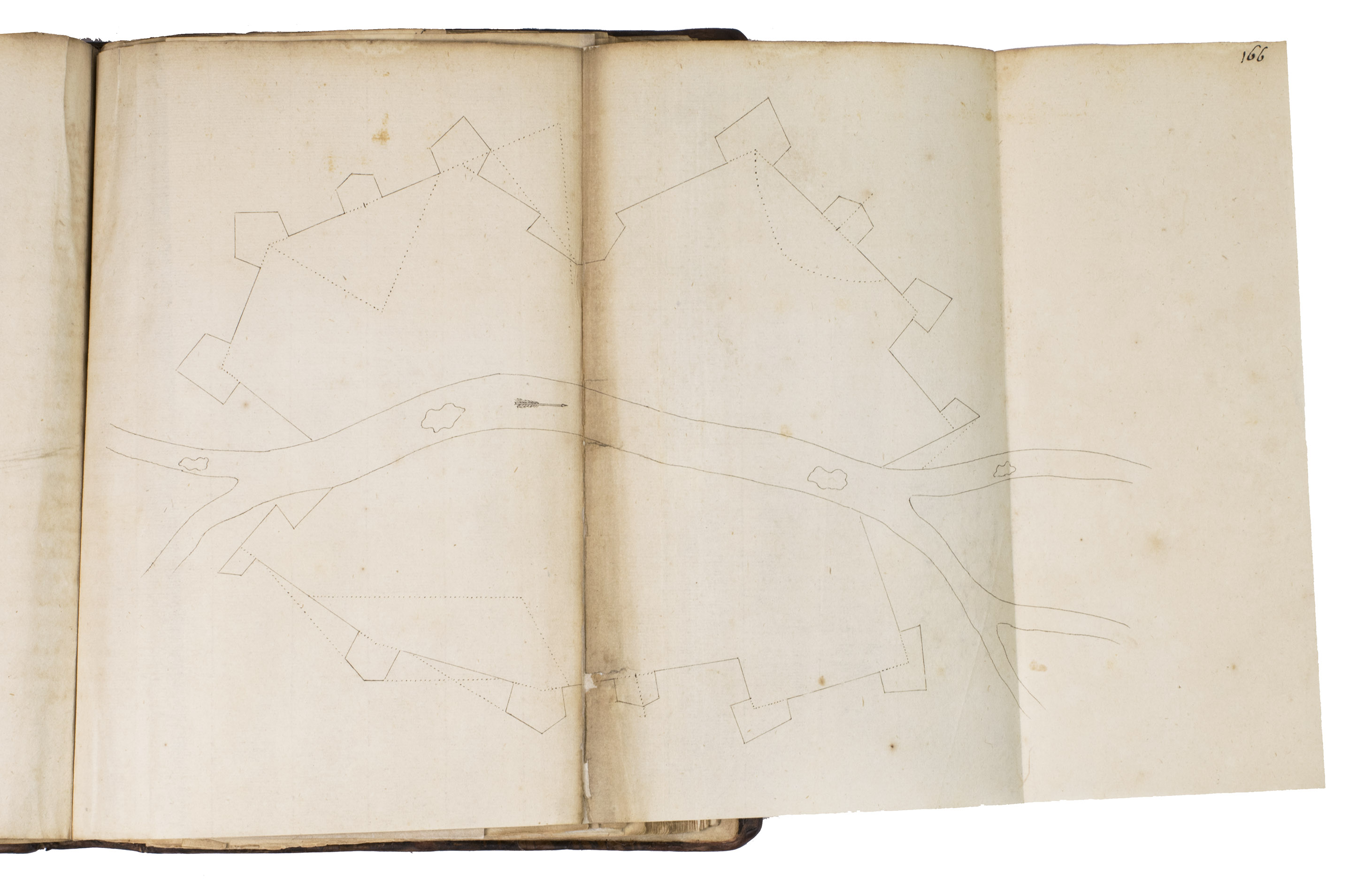 [Northern Germany?, ca. 1685/1700?]. 4to & small folio (23 x 18 cm). Manuscript in French, written in black ink on paper in an easily readable cursive hand, with the title in a pen and ink decorated cartouche, about 45 pen and ink drawings (14 full-page and 8 larger folding, 2 of the folding ones in red and black ink with coloured washes, one of the colour folding leaves 36 x 27 cm), mostly showing fortification plans. Contemporary or near-contemporary calf, gold-tooled spine. [1], [3 blank], 164 pp., ll. 165-171, [172], pp. 173-197, 197 [bis], 198-289, [24 blank, partly numbered].