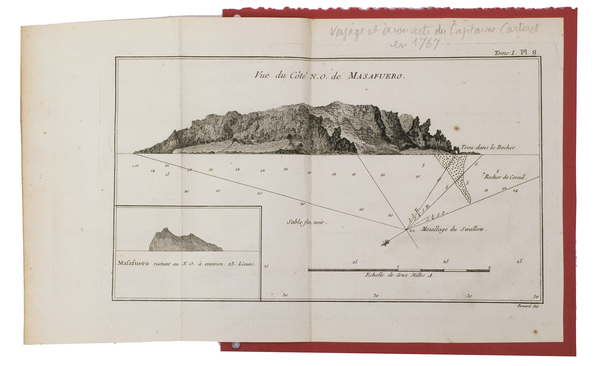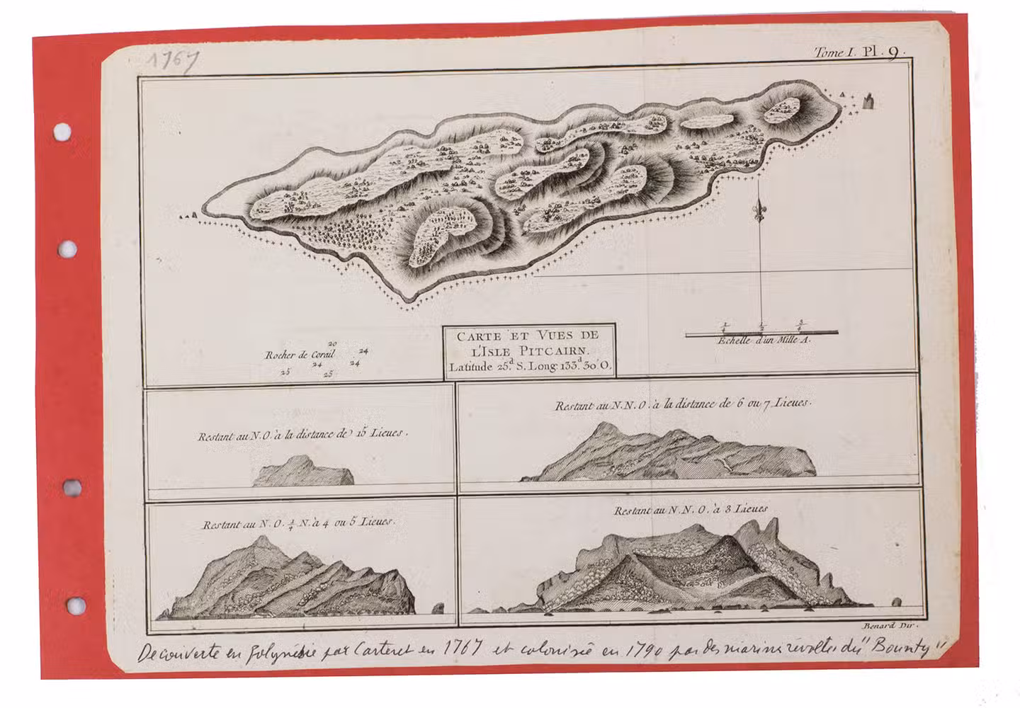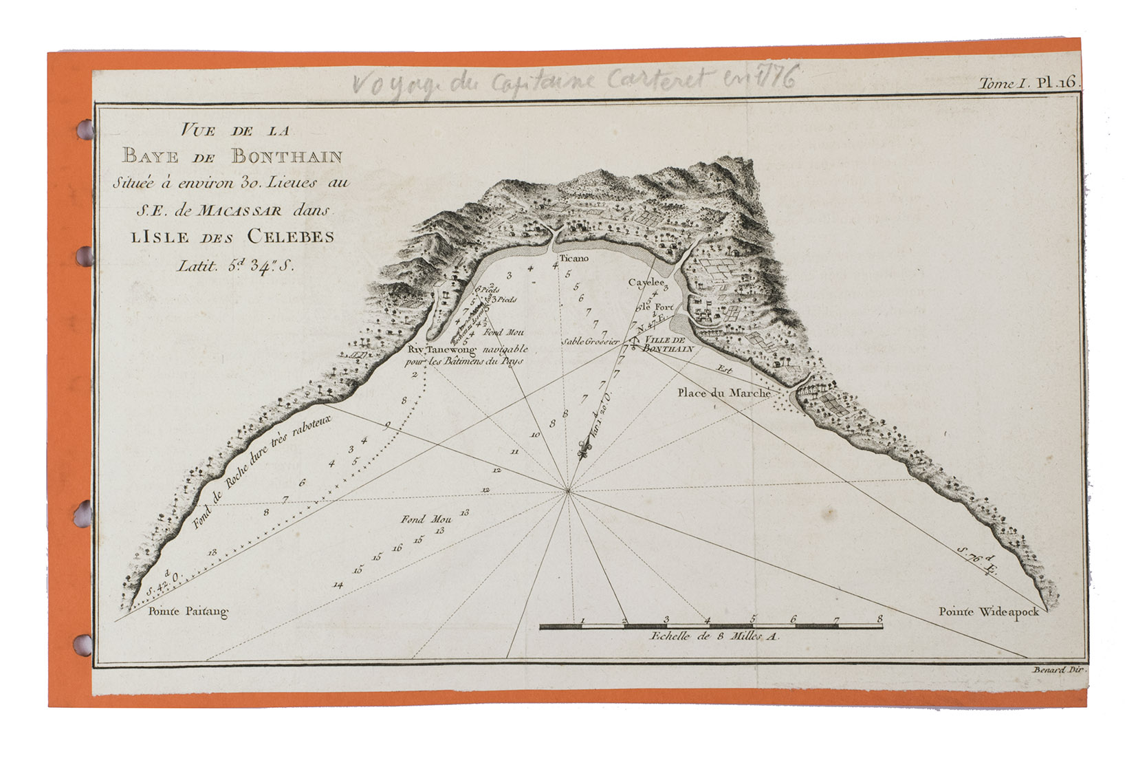 The logbook comes with six printed maps, partly illustrating the journey of the captain, pasted on contemporary cardboard. They depict the Bay of Sulavesi with the city of Bantang, Pitcairn, the coast of New Guinea, the coast of Queensland, the Santa Cruz Islands in the present-day Solomon Islands and Alejandro Selkirk Island. The plates stem from the French translation of James Hawkesworths An Account of the Voyages (Hawkesworth, Relation des voyages entrepris par ordre de sa Majesté Britannique, actuellement regnante; pour faire des découvertes dans l'hemisphère meridional, Paris 1774).