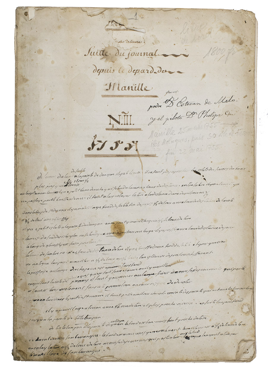 This wonderful logbook details the journey of a French captain from Manila to the Maluku Islands in todays Indonesia. The journey took place during the months of March to May of 1755. The captain of the ship recounted with great detail the events of every day of the journey, with detailed daily accounts of the weather, winds, manoeuvres of the ship, its departures, anchorages, and precise coordinates at every point of the journey. The captain furthermore had a keen eye for the geographical and nautical details along the journey. He recounted the exact locations of for example sandbanks and bays, where ships and their crews can take provisions and fresh water. The accounts are detailed and captivating: "After our boats were back on board, we set sail [...] in the afternoon to moor under the old Portuguese fort on the Solor island [Indonesia], the winds for the tide were fresh at 1:34 a.m. [...] sand and gravel, and then I went back to mooring. The pavilion of the fort [...] the village is under the said fort at 3 cables from us [...]". The captain goes on to describe the geographical features of the islands as well as other places en route with great detail. Curiously, we find inscriptions in Spanish and the names of one don Phelipe Qui, who describes himself as "el piloto" and one Padre Don Estevan de Melo. The latter might be identical with Don Estevan Roxas y Melo, a native of Lima, Peru and secretary to the Archbishop of Manila, Rodriguez, since 1736. Roxas y Melo was part of the 1751 reconstruction of the Cathedral of Manila, working under the auspice of the Italian architect Juan de Uguccioni.