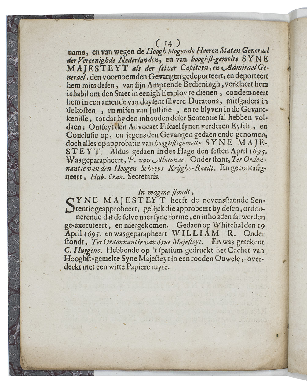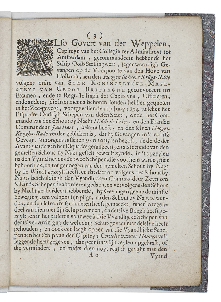First and only edition of this pamphlet, discussing the condemnation of 4 Dutch captains for their cowardly conduct in the Battle of Texel on 29 June 1694 against the French privateer Jan Baert (1650-1702). They are Govert van der Weppelen, Simon Holthuysen, Anthony van der Lith and Cornelis van der Hoeven. All four were removed from their functions and sentenced to a thousand silver ducatons fine, including imprisonment until they payed this fine. All four charges and sentences are described in this pamphlet.