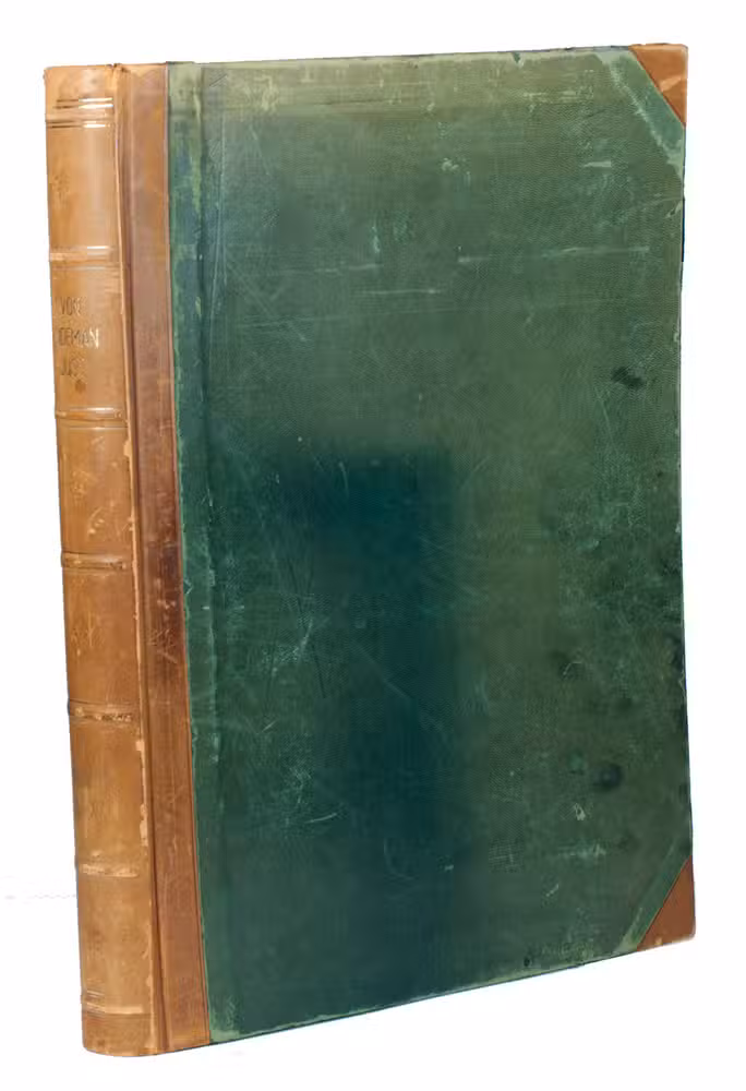[Austria or Saxony?, ca. 1870?]. Large folio album (39 x 30.5 cm). With 84 large watercolour drawings (28 x 16 cm to 25.5 x 36 cm) on wove paper, with captions in German and/or French, mounted on the (ca. 1962) album leaves, and with the coat of arms of Von Lindeman(n) of Sachsen-Anhalt (in coloured gouaches plus gold) mounted on the first page. Early 20th-century(?) half tanned sheepskin. [44] album ll.