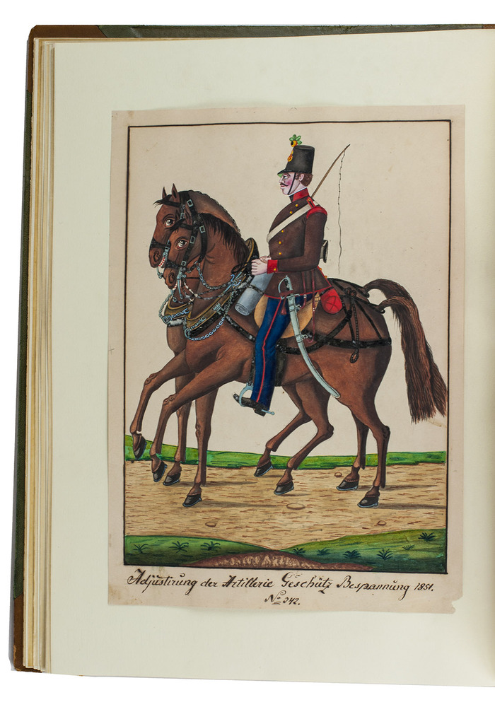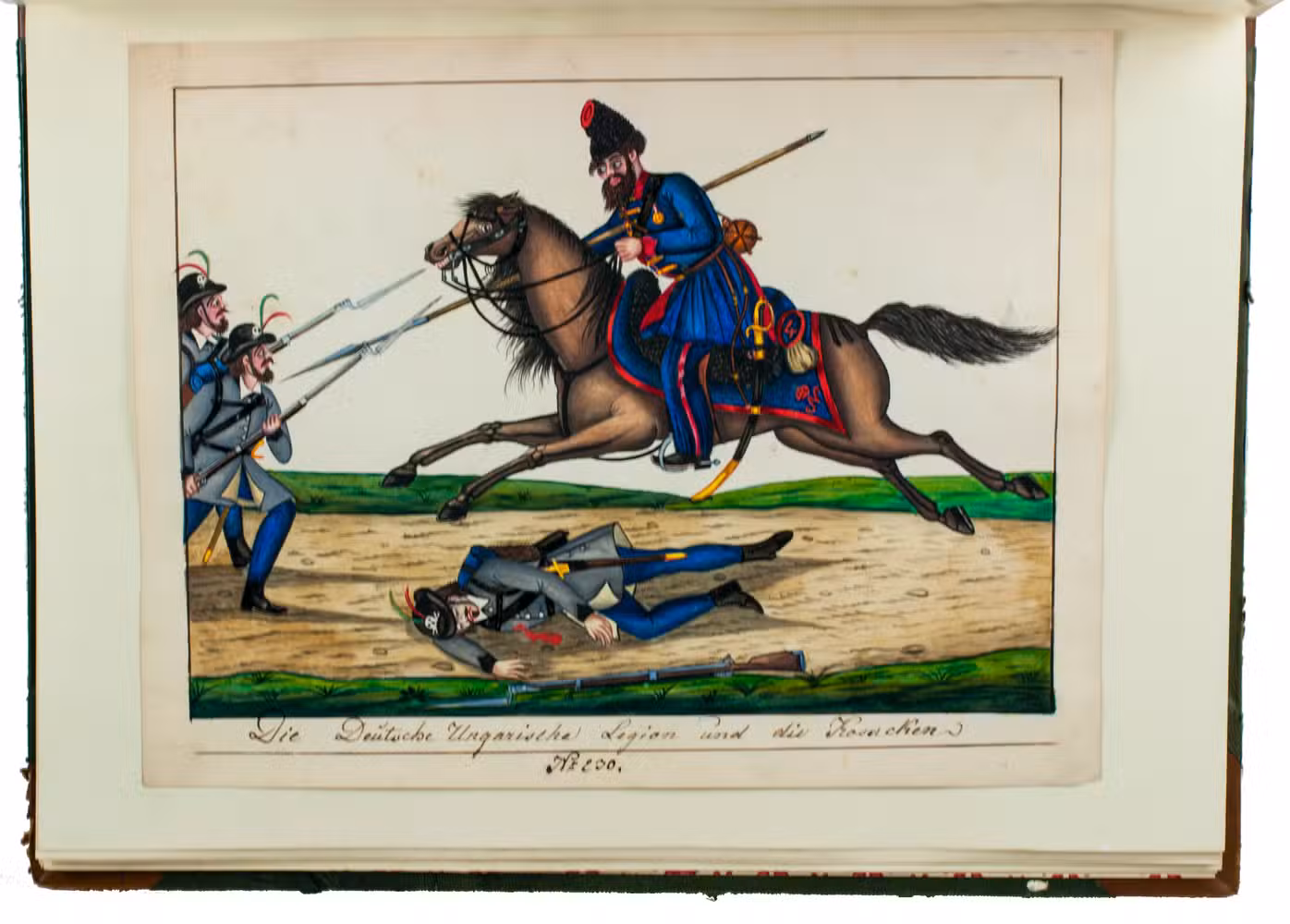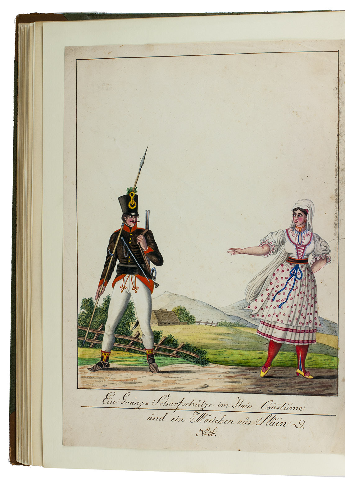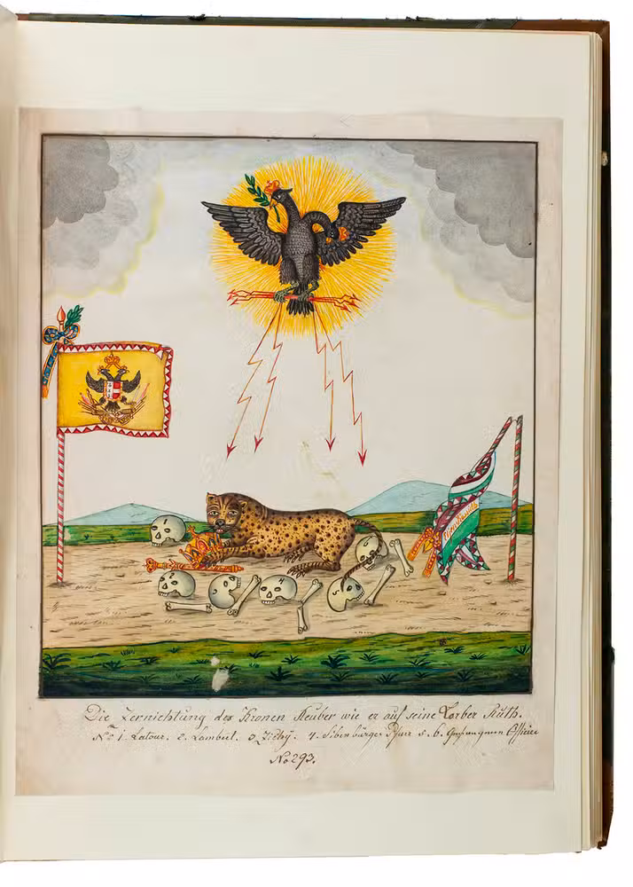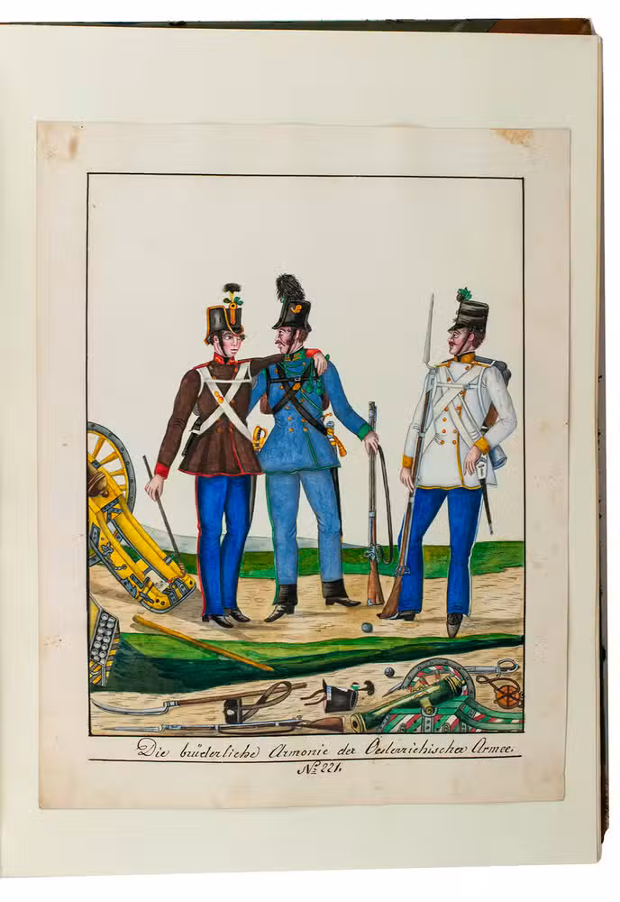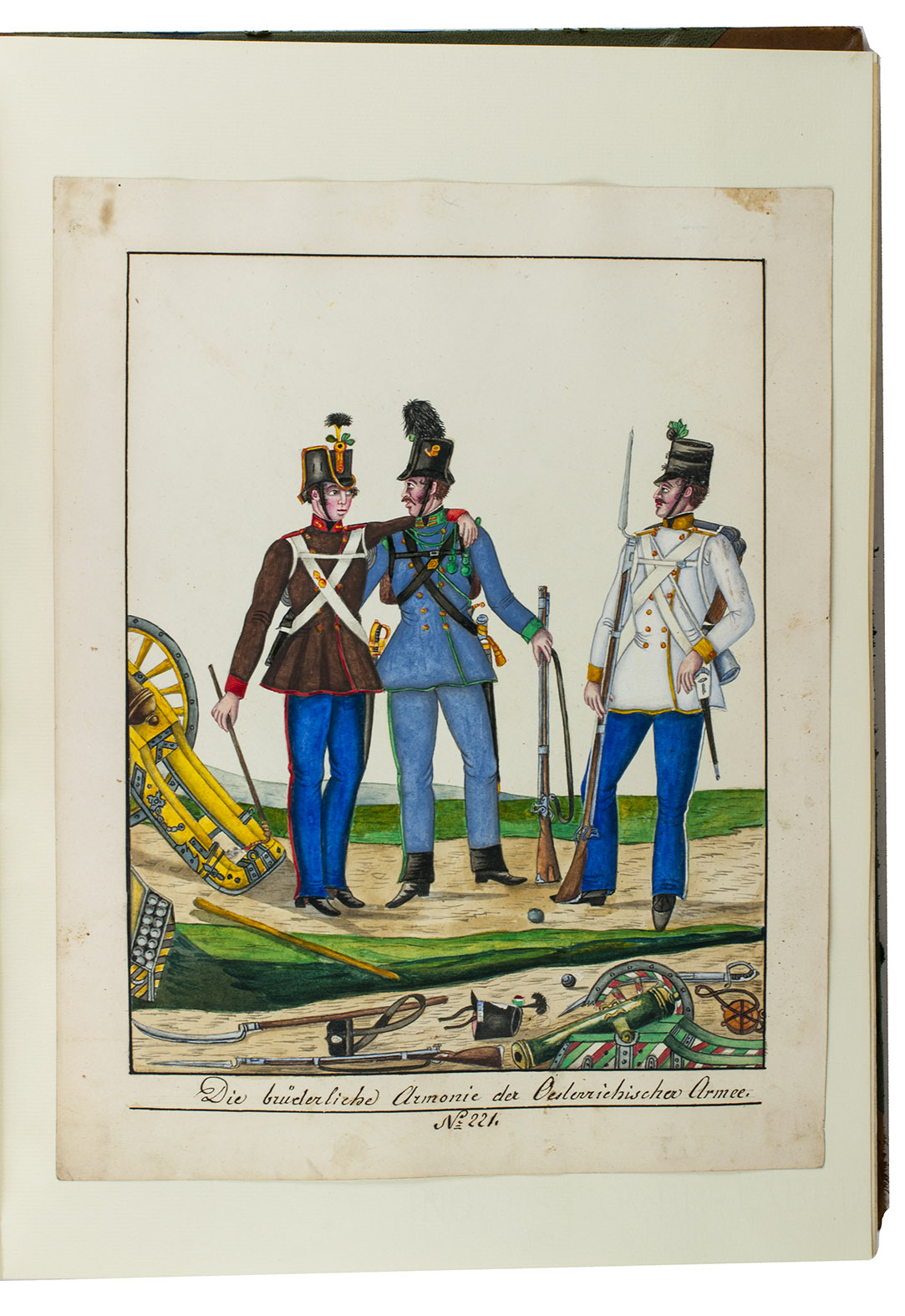 An extraordinary set of original watercolour drawings, apparently unpublished, celebrating the creation of the Austro-Hungarian Empire through the military events that led up to it and the uniforms of the various nations and regiments involved. Except for one drawing concerning 1631, the events depicted are dated from 1757 to 1852. Officers and others in uniform from every corner of the Empire are shown: Prussians, Hungarians, Austrians, Poles, Czechs, Croats, Dalmatians, Transylvanians, Serbians, Bosnians and many more, with a few examples of local militias and of foreign army regiments from France, the Ottoman Empire, Russia and the British Isles (including kilted Scottish Grenadiers at Waterloo). A few appear in Islamic dress, including turbans. Some show portraits of leading figures, including Frederick the Great (1712-1786), King of Prussia and Mohammed Said Pasja (1822-1863) wali (governor) of Egypt. The uniforms are depicted in great detail, with vivid and bright colours, and some show the changes in uniforms at two or three different dates in a short span of years. The present set of 84 was no doubt part of a collection of at least 536. They may have been prepared for a publication that remained unrealised.