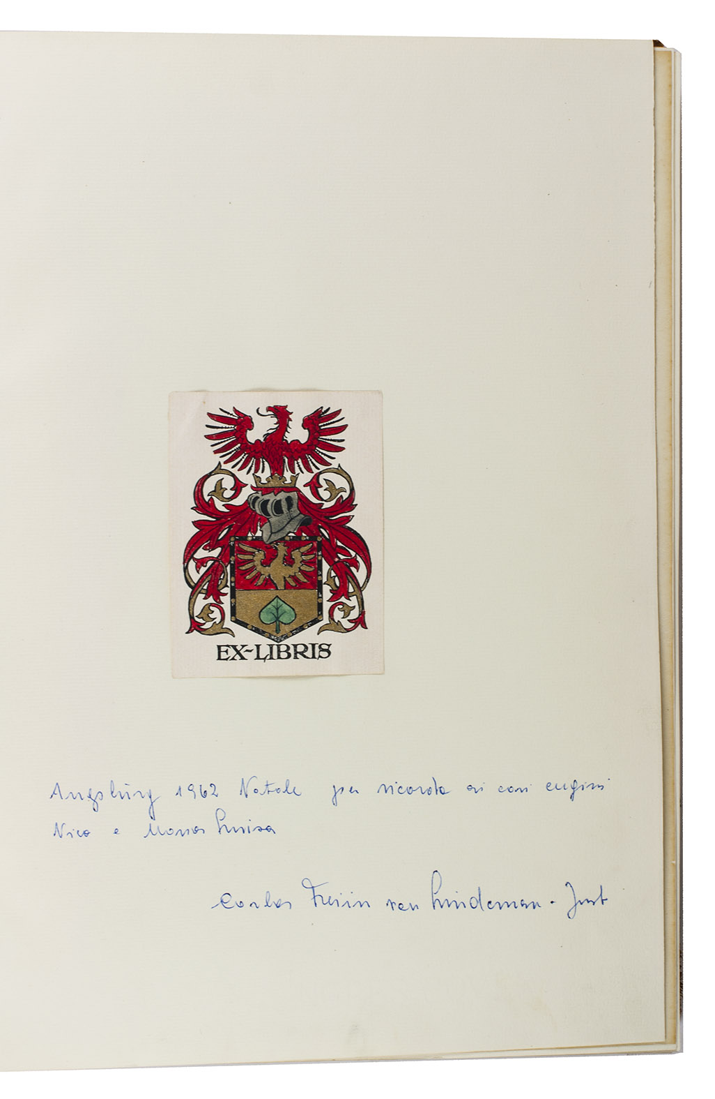 The arms on the first page belong to the Von Lindeman(n) family of Sachsen-Anhalt, the binding has the name "Von Linden Just" on the spine and the first page bears a presentation inscription, below the arms, from the Freiin von Lindeman-Just, dated from Augsburg, 1962, to a relative in Italy.