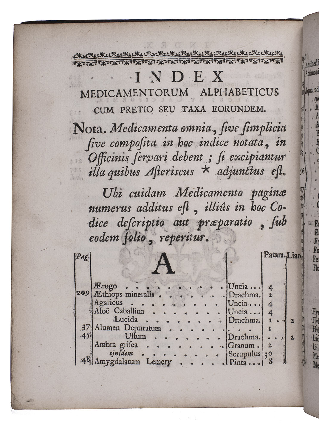 Rare first and only edition of the Mons pharmacopoeia. Although the Vienna pharmacopoeia had been officially designated as the standard for the Austrian Netherlands, the city of Mons published its own pharmacopoeia in 1755, making it the last city in the Low Countries to create a new pharmacopoeia.