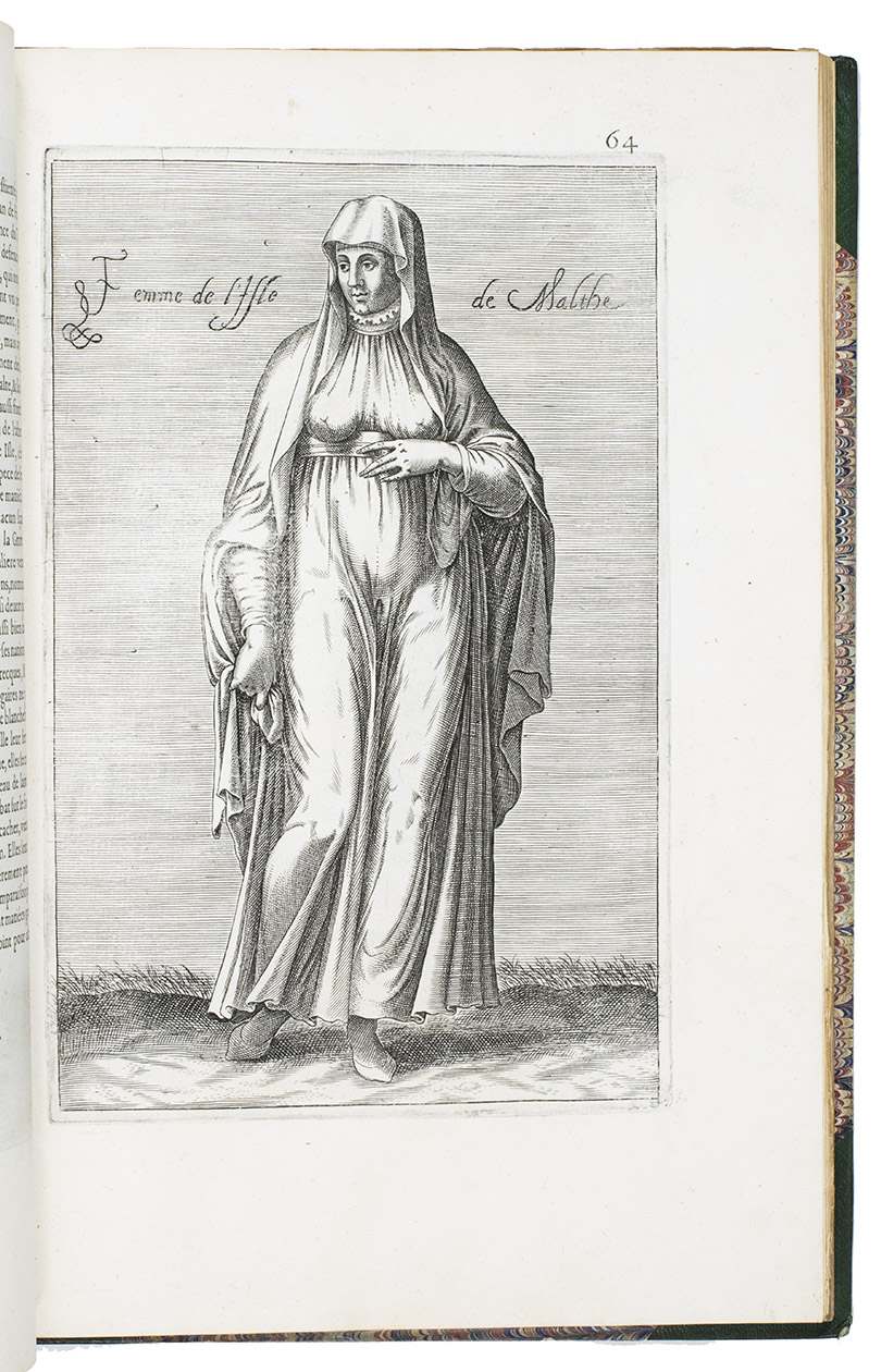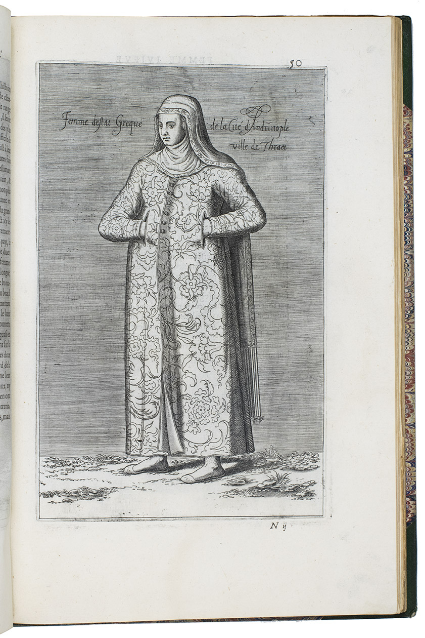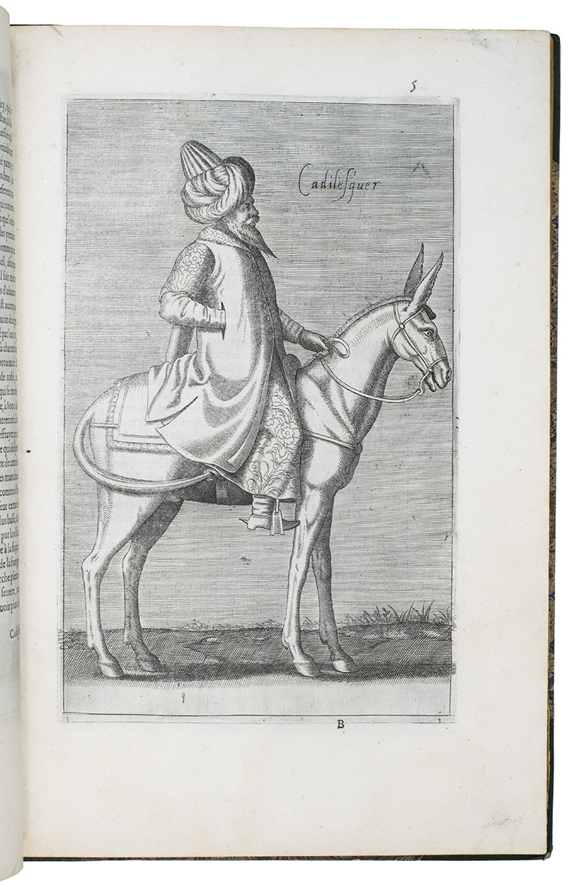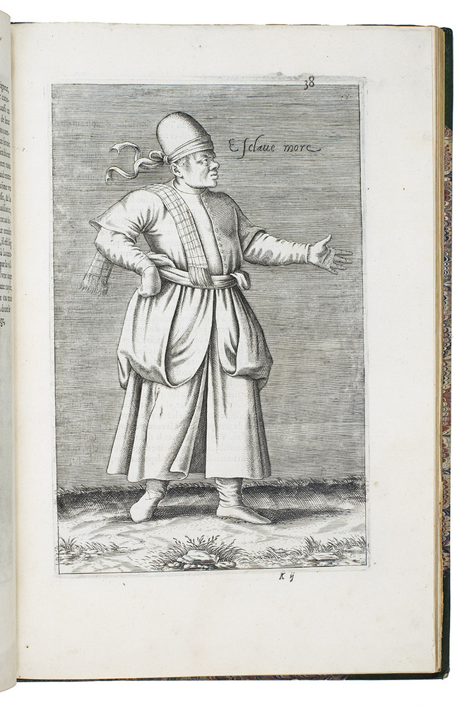 [Paris, widow of Abel L'Angelier, 1620]. 2 parts in 1 volume. Folio. With 79 engraved plates, including 62 costume plates (ca. 27.5 x 17.5 cm) after Nicolas Nicolay. With an additional loosely inserted engraving of a "Marchant Juif". All the plates have explanatory texts on the versos of the preceding plates. 19th-century green half morocco. "64" [=65] ll., 65-114, [3], [1 blank] pp.