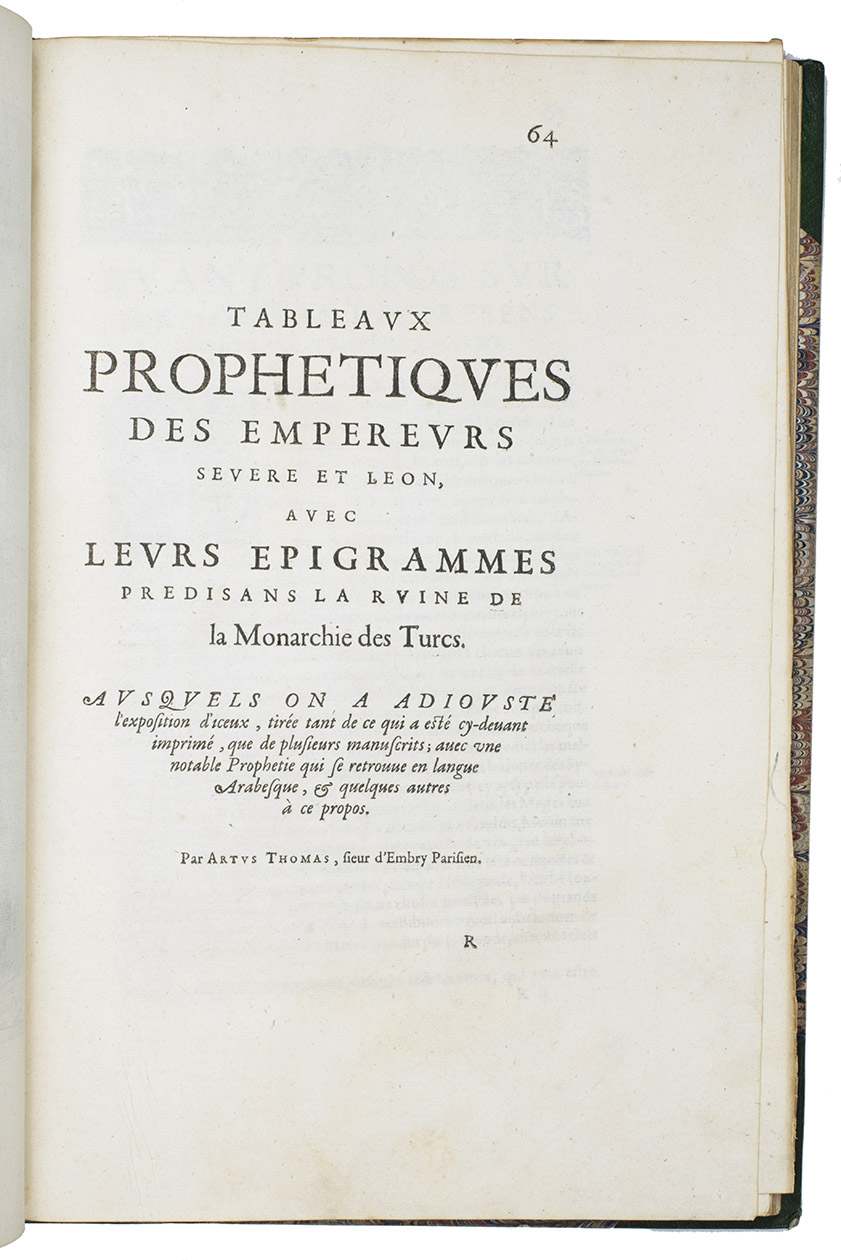 Including: THOMAS, Artus. Tableaux prophetiques des empereur severe et leon, avec leurs epigrammes predisans la ruine de la monarchie des Turcs.