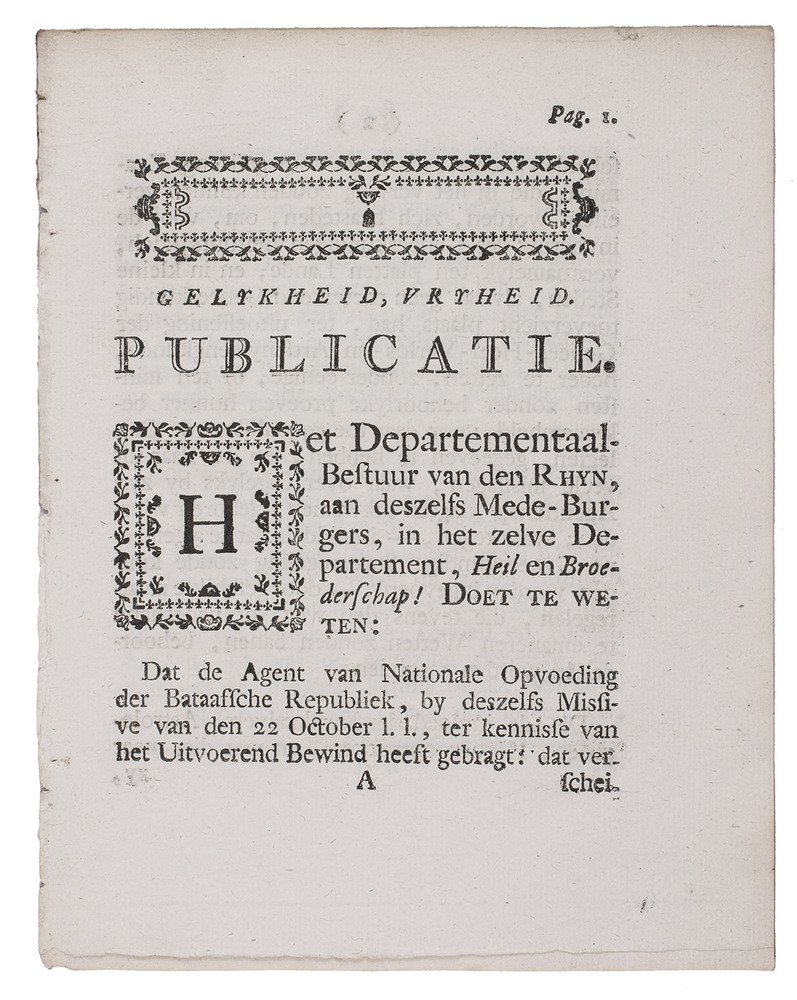 Gelykheid, vryheid. Publicatie. Het departementaal bestuur van den Rhyn ... doet te weten: ... dat verscheiden lieden, uit vreze voor gestrenge examina, ... zich haasteden, om, vóór de invoerings des geneeskundigen bestuurs, zich, voornamelyk ten platten lande, en in kleine steden, alwaar geen toereikend geneeskundig toeverzicht plaats had, ter uitoeffening der genees- heel- verlos- en artsenymengkunde, neder te zetten ...