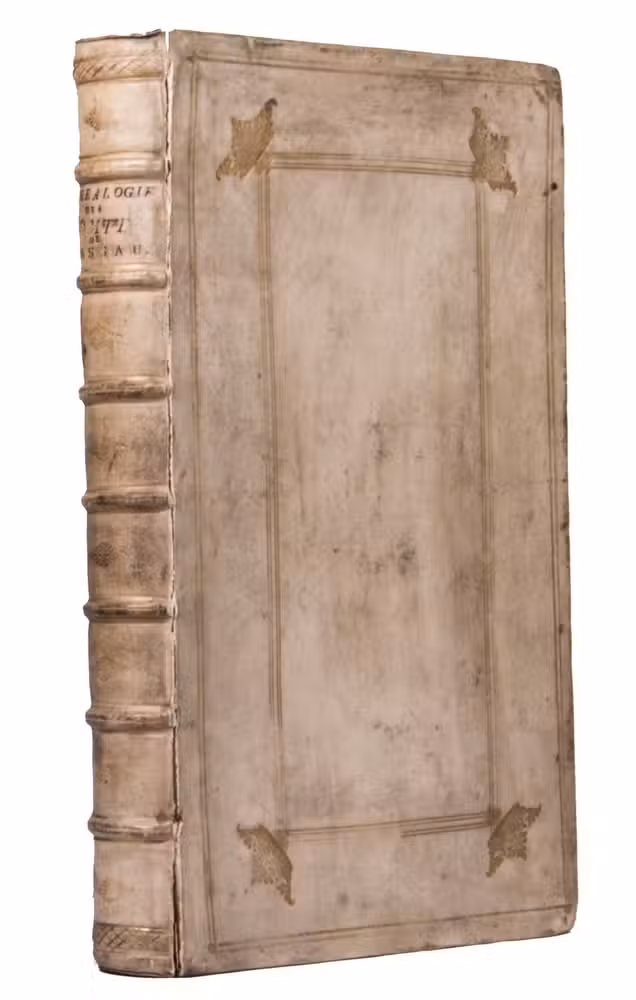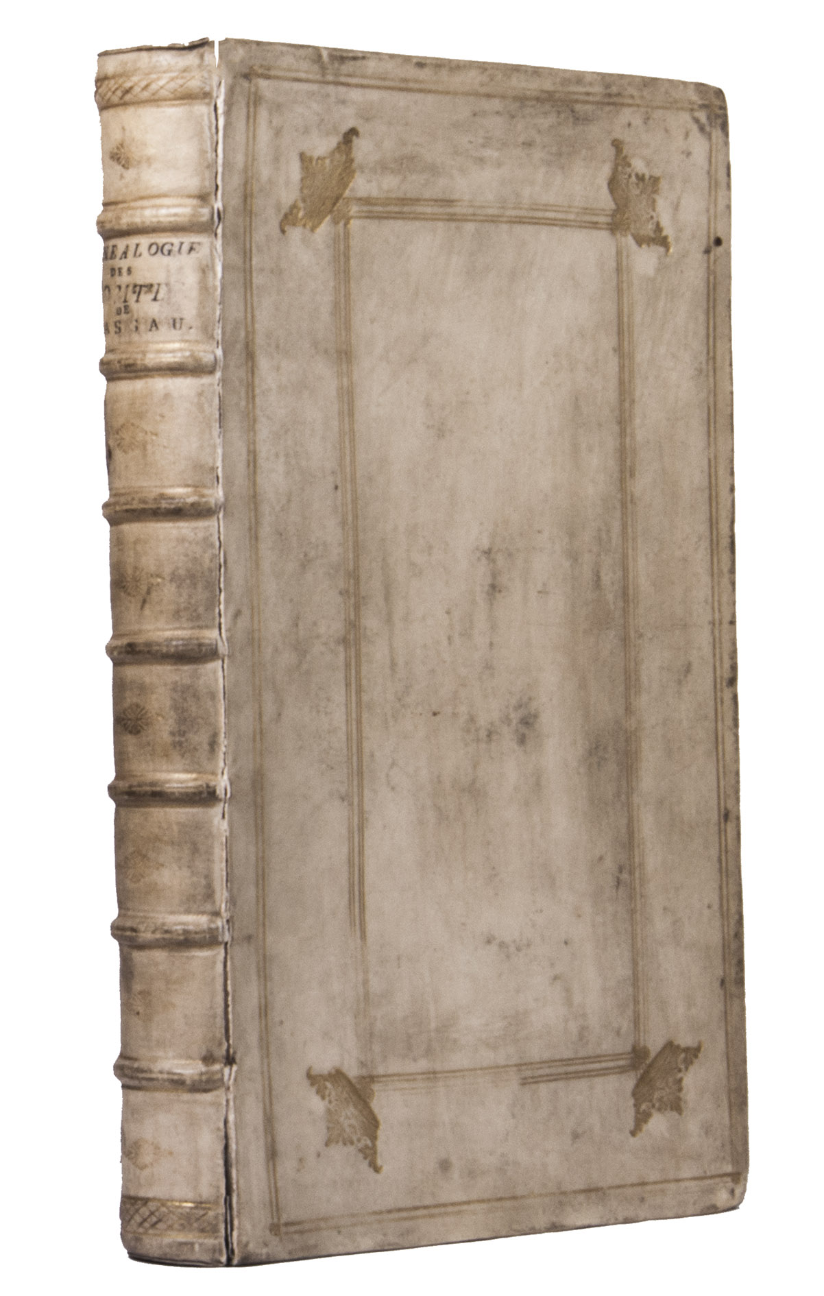 The vellum is somewhat soiled, the front hinge is weakened, but the structural integrity of the binding is still intact. The work is somewhat browned throughout, without the often lacking 7 genealogical folding plates. Otherwise in good condition. Haitsma Mulier/ Van der Lem 362c; Muller, Nederlandse historieplaten 977, note ("many of the editons of this important work are very rare"); Van Someren I, 1162; STCN 850320720 (6 copies, of which only 1 also with the Orlers title-page); cf. Fontaine Verwey, H. de la, Bookbindings by Albert Magnus, III (for the stamps).