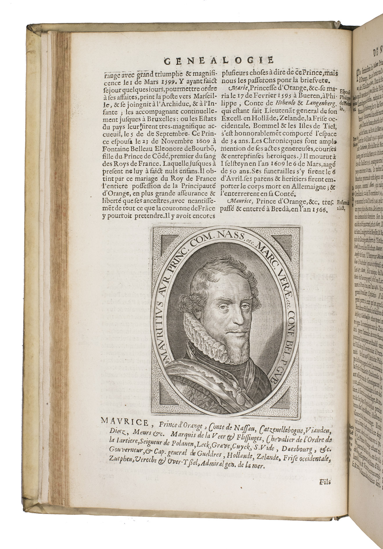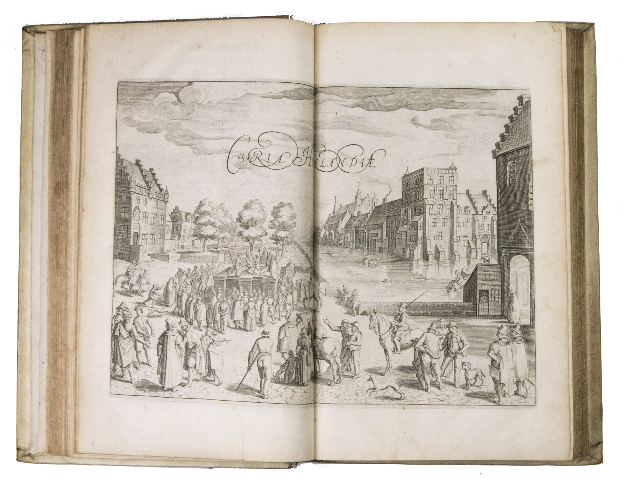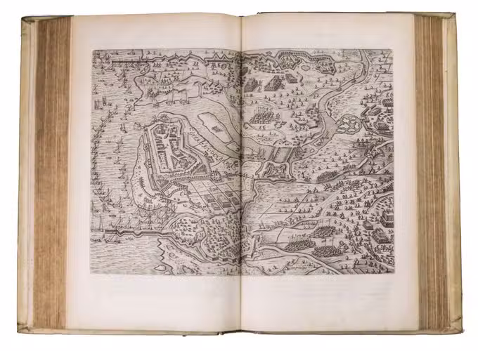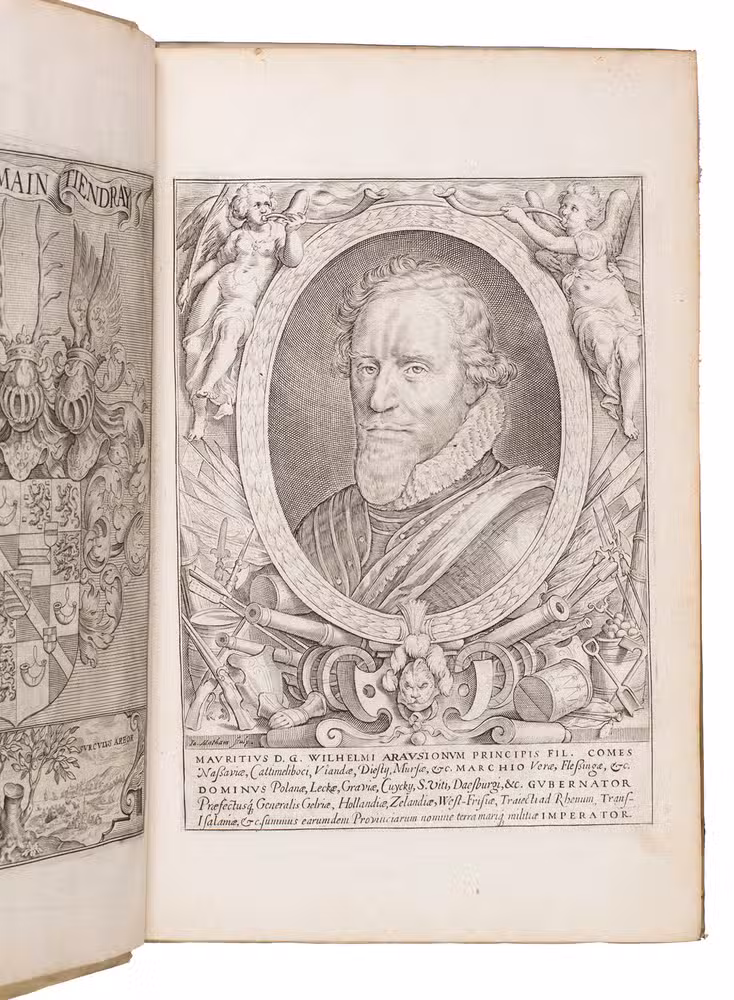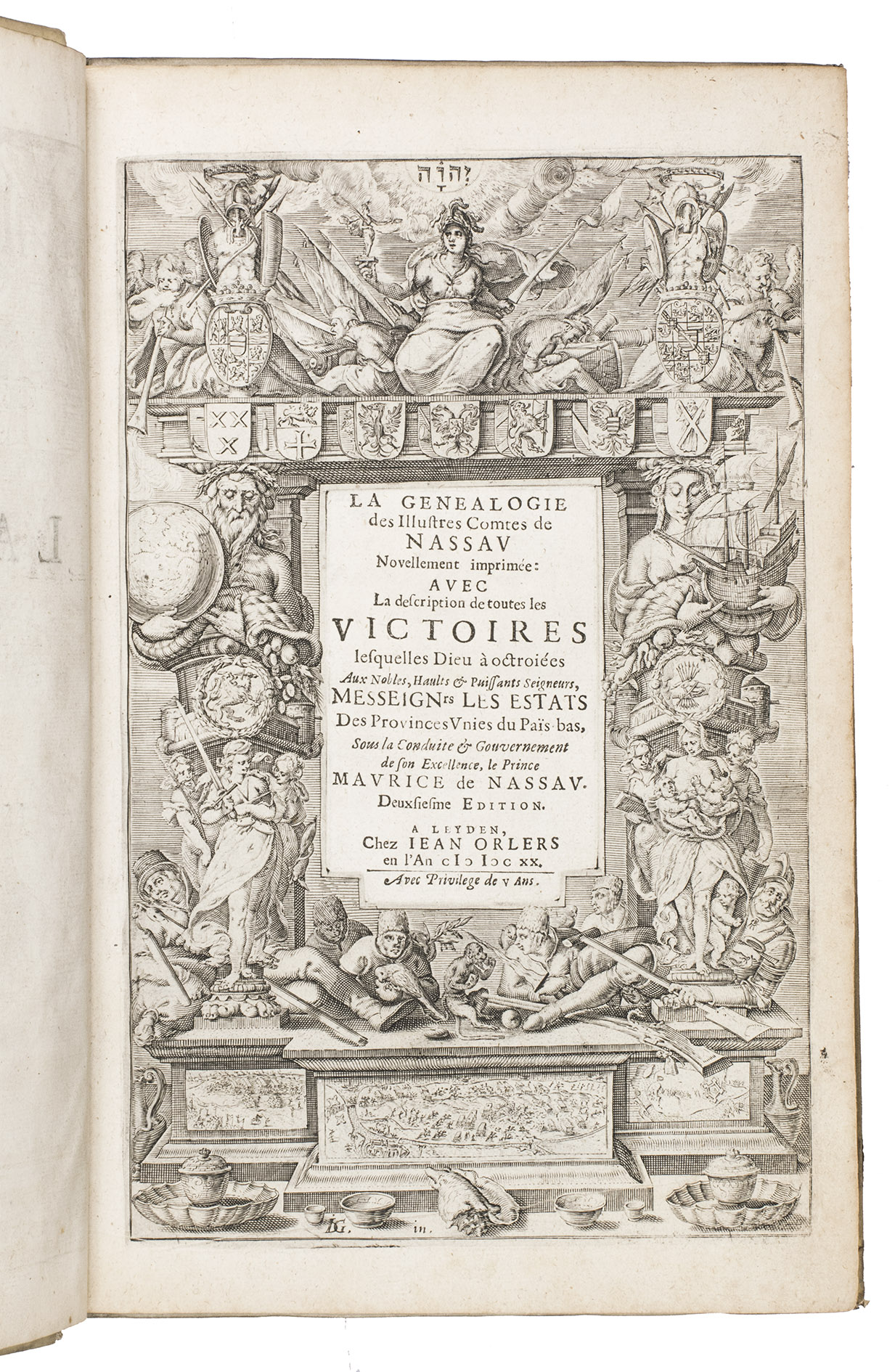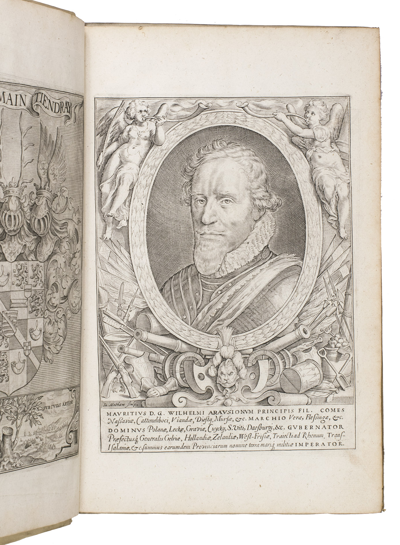 Leiden, Jan Orlers, 1620 (colophon: Amsterdam, Jan Jansz. [= Johannes Janssonius I], 1624). Folio. With an engraved title by Jacques de Gheyn II, a full-page coat of arms of Prince Maurice, a full-page engraved portrait of Maurice, 13 half-page engraved portraits of counts and princes of the Nassau family, 2 double-page engraved maps of the Netherlands and Brabant, and 41 engraved plans and bird's-eye views of cities and battles (39 double-page, 2 folding). Contemporary gold-tooled vellum. [78], 305, [2] pp.