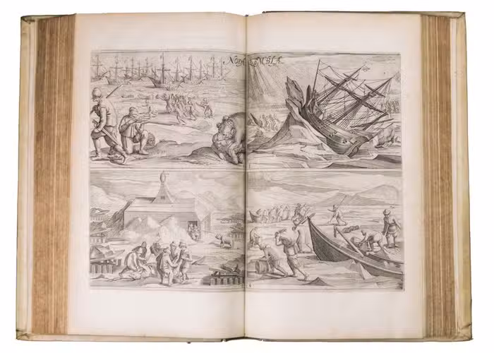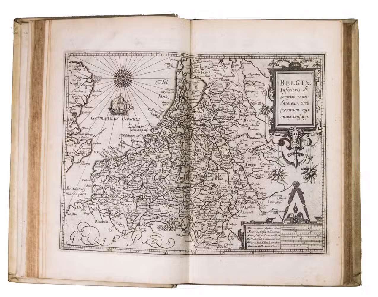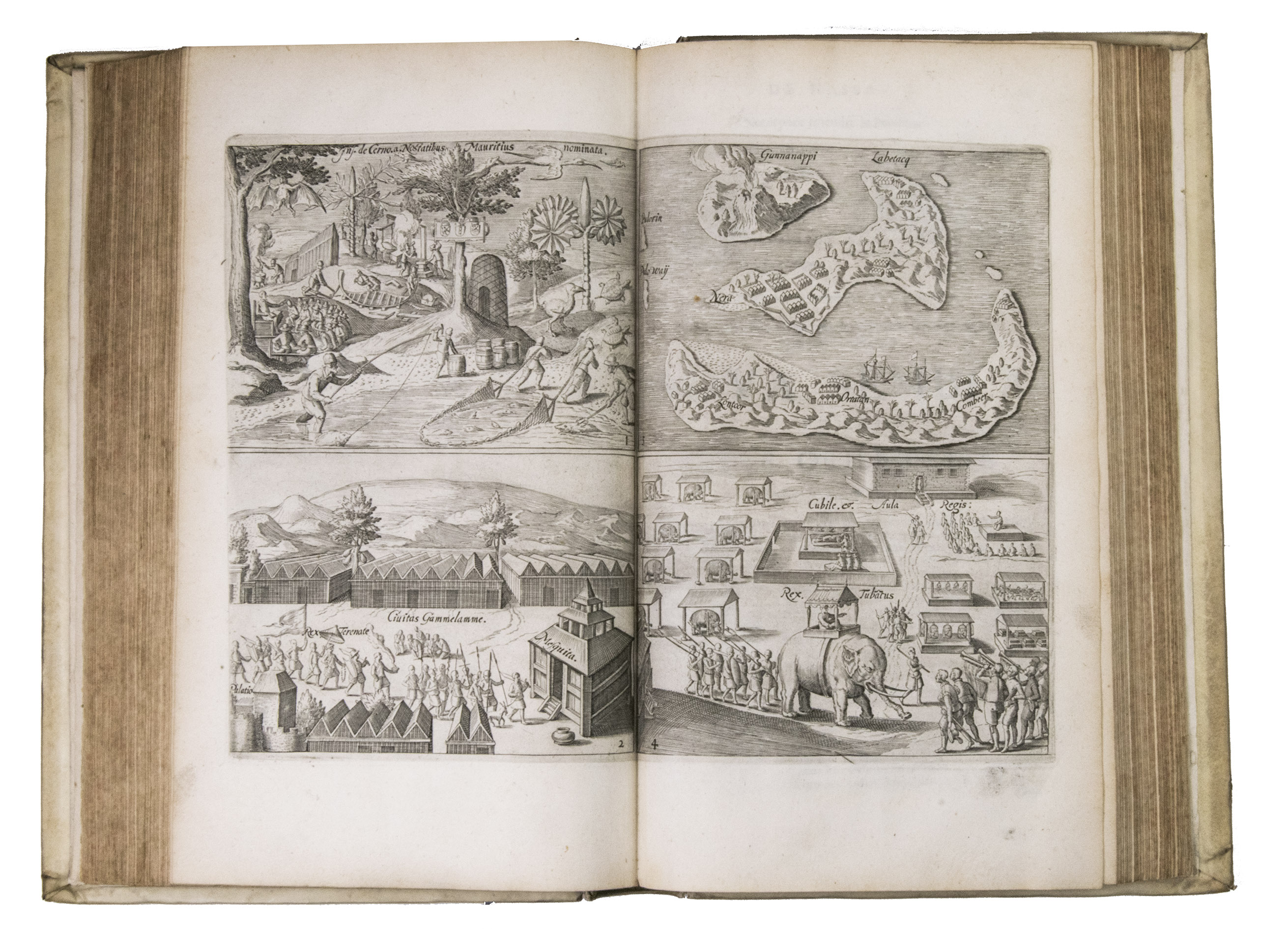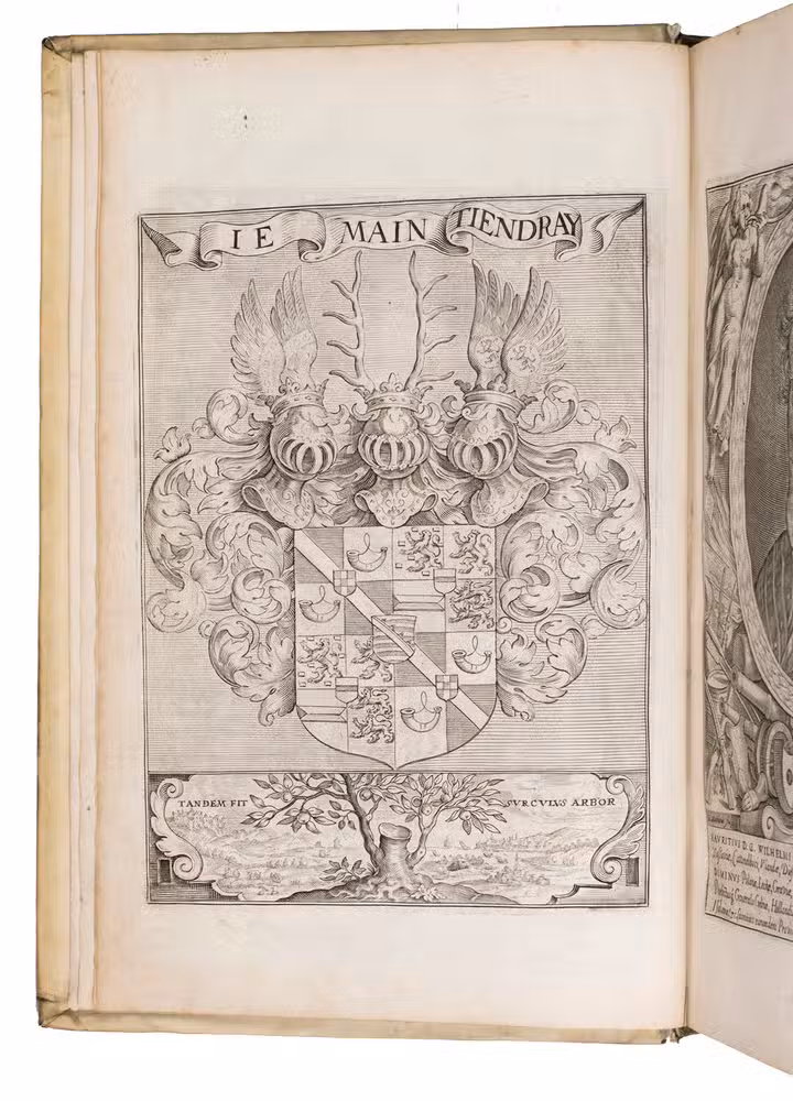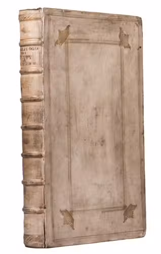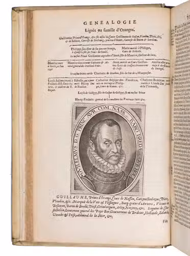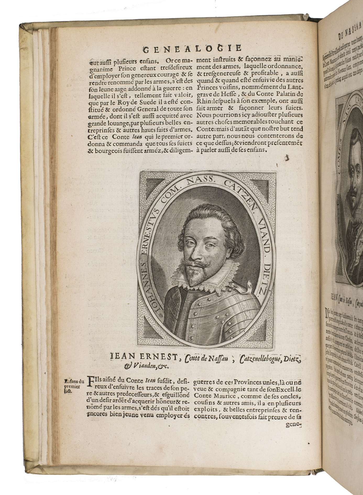 Leiden, Jan Orlers, 1620 (colophon: Amsterdam, Jan Jansz. [= Johannes Janssonius I], 1624). Folio. With an engraved title by Jacques de Gheyn II, a full-page coat of arms of Prince Maurice, a full-page engraved portrait of Maurice, 13 half-page engraved portraits of counts and princes of the Nassau family, 2 double-page engraved maps of the Netherlands and Brabant, and 41 engraved plans and bird's-eye views of cities and battles (39 double-page, 2 folding). Contemporary gold-tooled vellum. [78], 305, [2] pp.