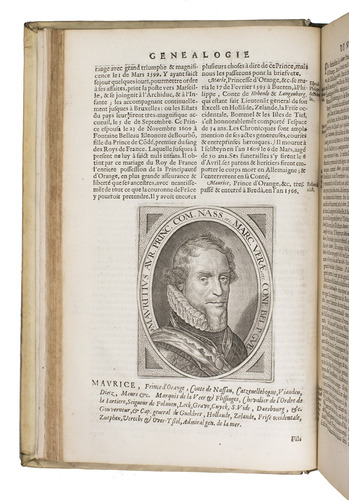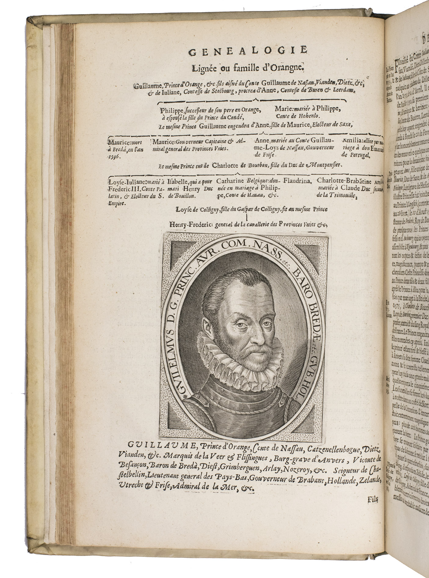 The author, Jan Jansz. Orlers (1570-1646) was a nephew and pupil of the well-known secretary of the city of Leiden, Jan van Hout. He worked as a printer of books in Leyden between 1596 and ca. 1618. The original Dutch edition of his description of the victories of Stadholder Maurice (until 1609) was published in 1610, with enlarged reprints in 1619 and 1651, under the title Nassauschen Laurencrans; beschrijvinghe ende af-beeldinge van alle de victorien. A Latin translation appeared in 1616; a German translation in 1612, 1617, 1618; an English translation in 1613; the first French translation in 1612, and the second in 1615. The present edition is the third in French, but is rarer than the second edition. The French editions have an added extensive genealogy of the house of Orange with 13 half-page engraved portraits of members of this house, beginning with the Emperor Adolf of Nassau.