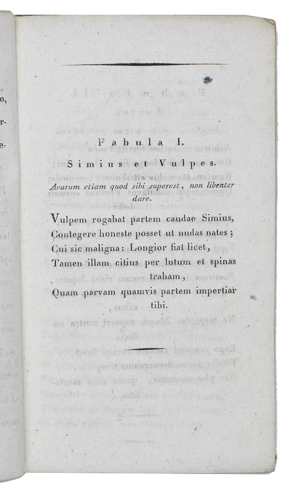The fables were edited already in 1809 by G.A. Cassitto and in 1811 by Cataldo Jannello. In 1812 there were even three editions: Paris, Renouard and one in Jena. Our edition is probably after the Jena-edition, which was considered to be not very accurate. Besides, many scholars raised doubts about the authorship of Phaedrus. Nevertheless it still remains an interesting collection of fables.