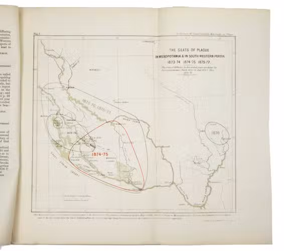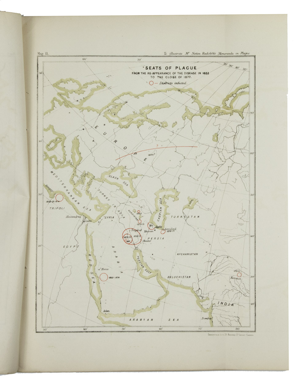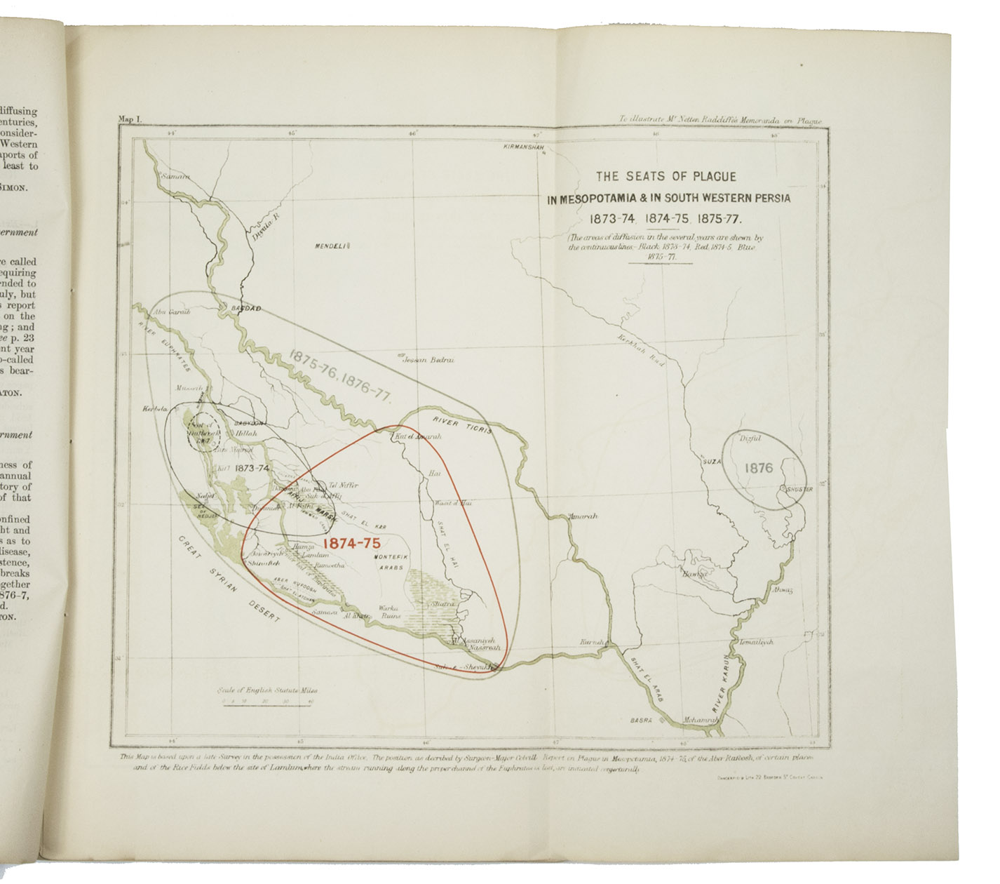 London, George Edward Eyre & William Spottiswoode, 1879. Folio. With two folding lithographed maps, one centered on the Middle East and the other detailing the seats of the plague in Mesopotamia and south-west Persia.Original publishers blue printed paper wrappers. [2], 76 pp.