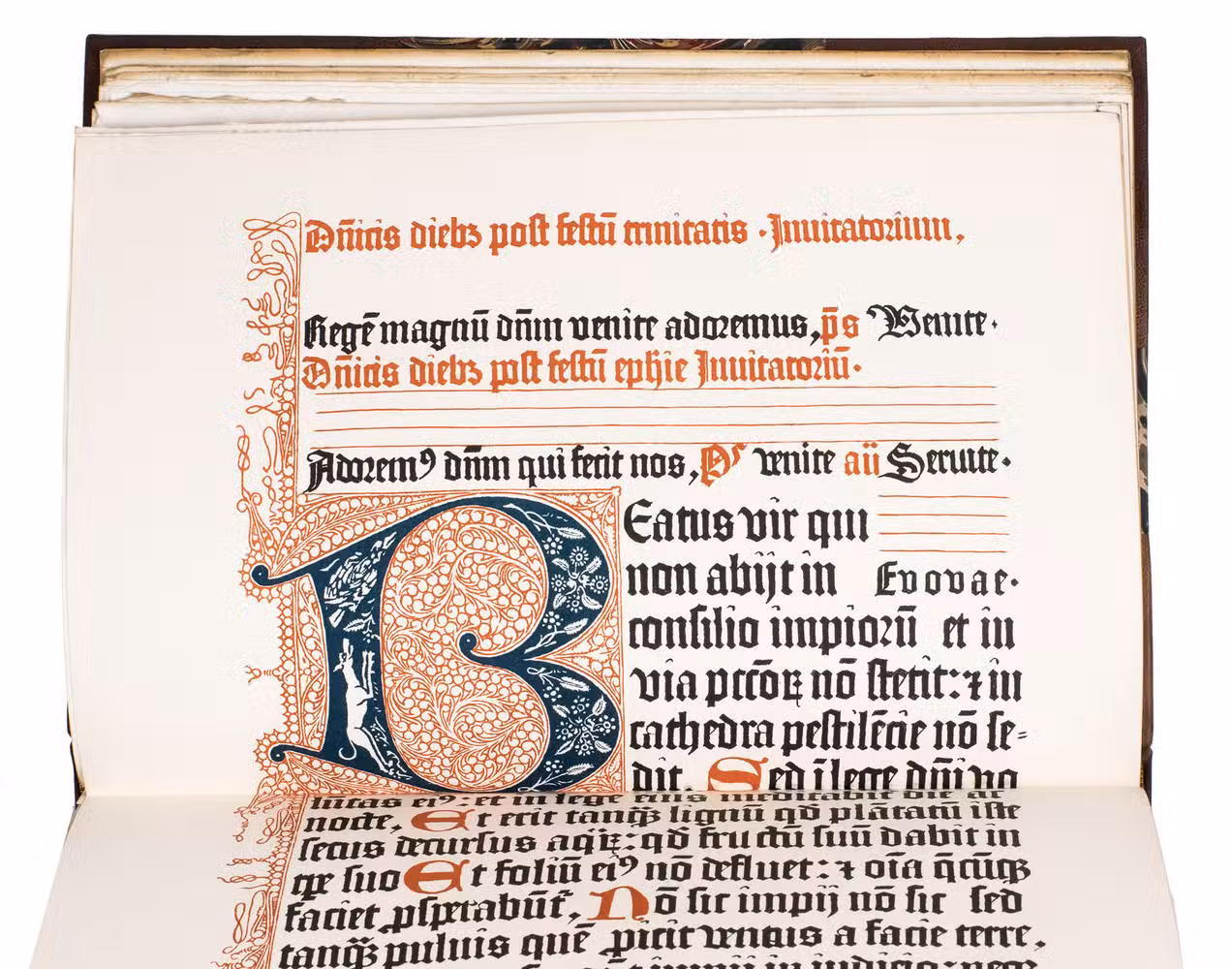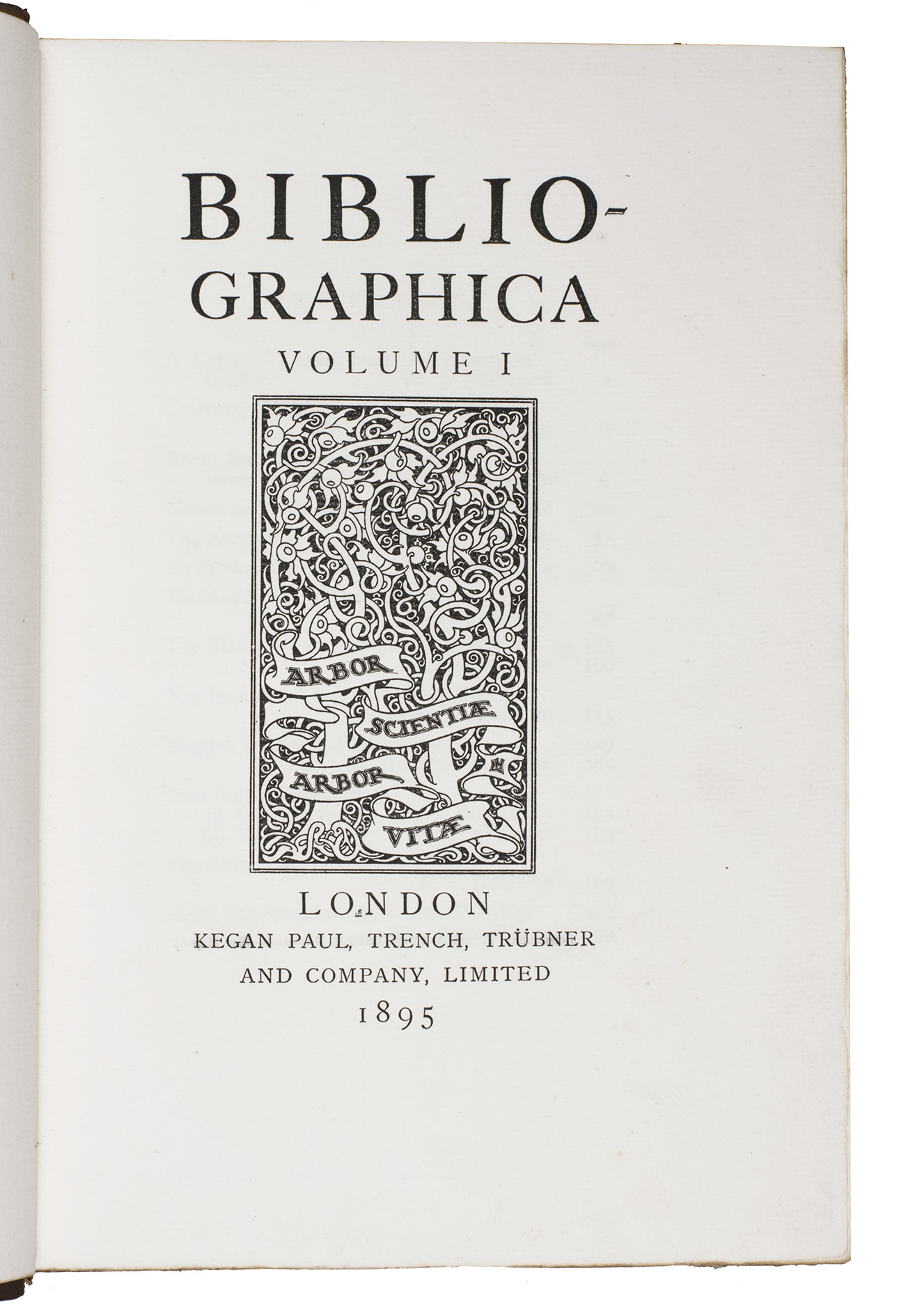 Rare complete set of a richly illustrated periodical on the history, design, and production of books. Published between 1895 and 1897, it was issued in 12 quarterly parts and subsequently collected into three volumes. It contains numerous large illustrations, including reproductions of illuminated manuscripts, early printed books, fine bindings, and typographic specimens. The work is a compilation of essays on topics such as English book sales, Japanese illustrated books, early music printing, English illuminated manuscripts, and Robinson Crusoe and its illustrators. The contributors include notable figures within the world of book history and design, such as William Morris, H. Oskar Sommer, Austin Dobson, W. Y. Fletcher, Cyril Davenport, and many others.