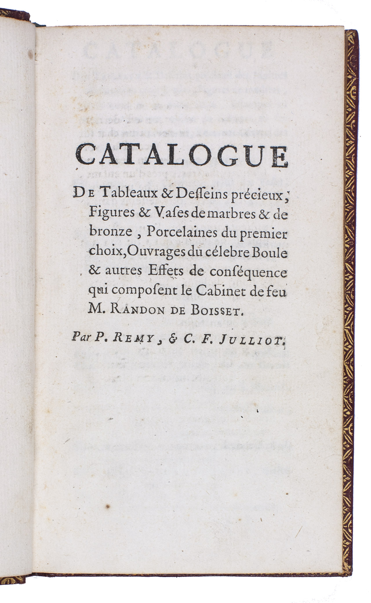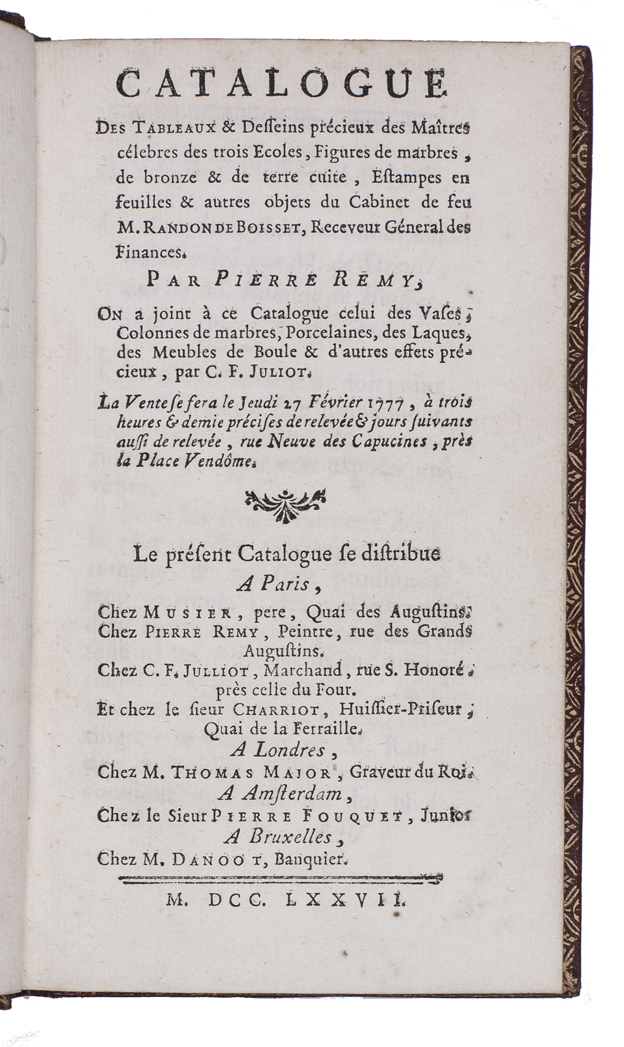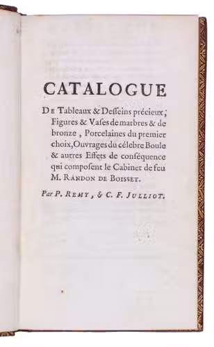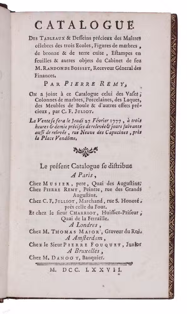 Catalogue des tableaux & desseins précieux des maîtres célebres des trois écoles, figures marbres, de bronze & de terre cuite, estampes en feuilles & autres objets du cabinet de feu M. Randon de Boisset, receveur géneral des finances. ... On a joint à ce catalogue celui des vases, colonnes de marbres, porcelaines, des laques, des meubles de boule & d'autres effets précieux, par C.F. Julliot. La vente se fera le jeudi 27 février 1777 ... Vêndome.