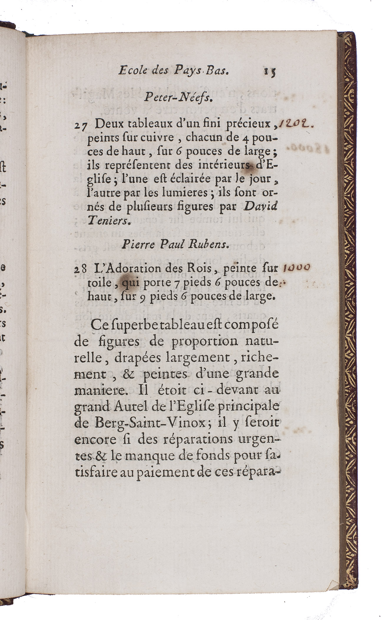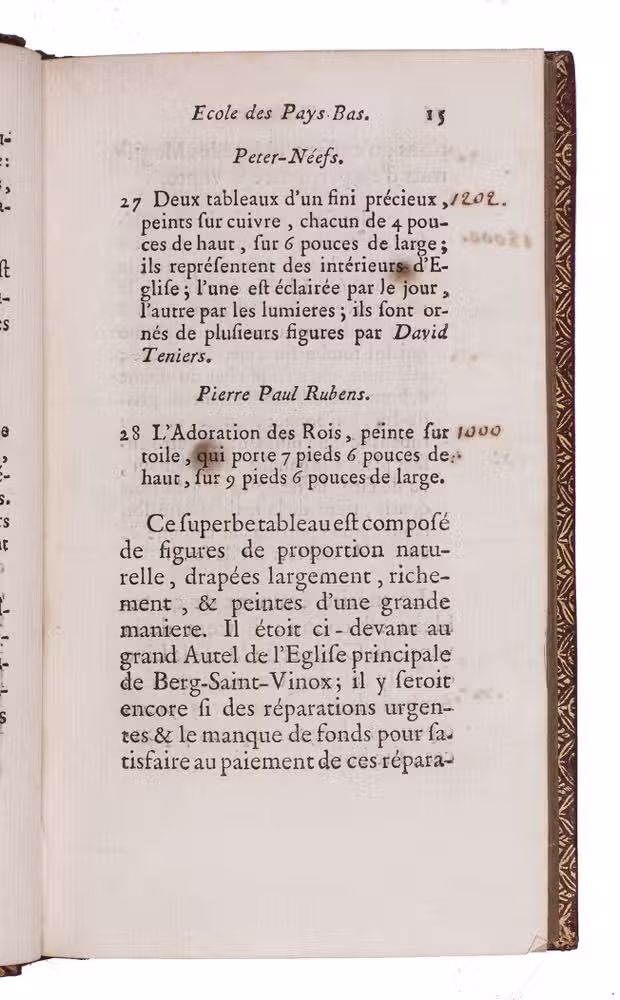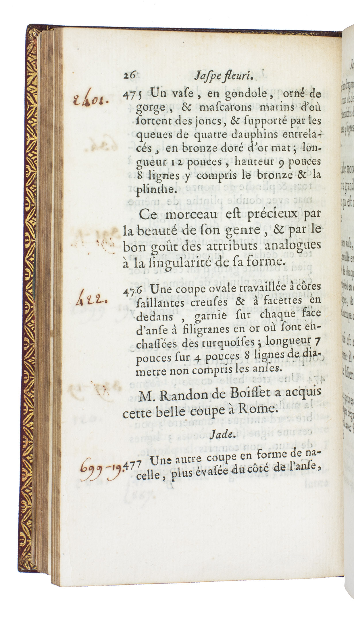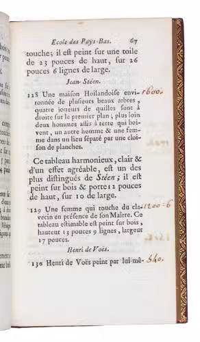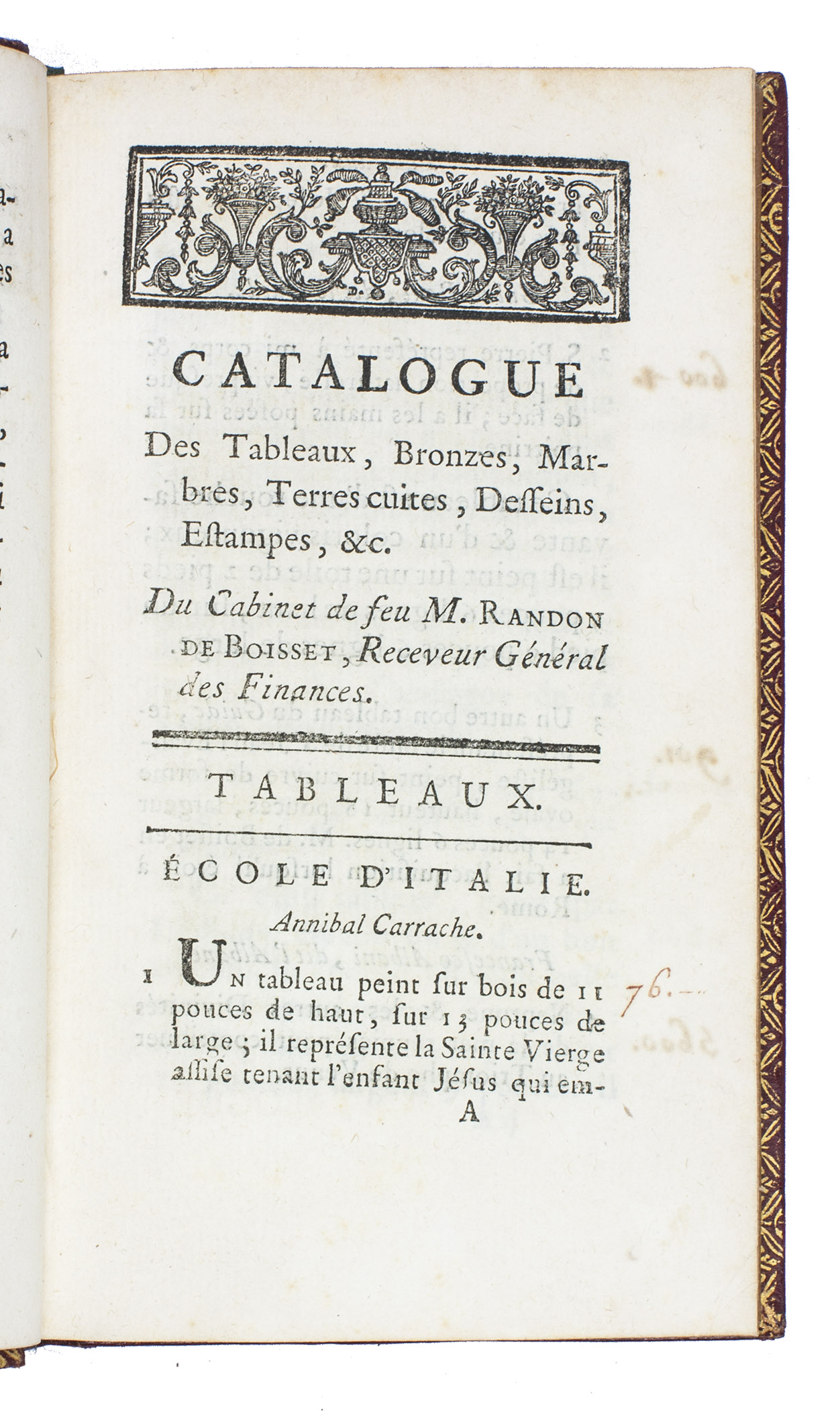 First and only edition of the auction catalogue of one of the most celebrated collections of the 18th century, the art collection of Pierre Louis Paul Randon de Boisset (1708-1776), a high financial official of the French government. The collection contained paintings from the Italian school (Carraci, Reni etc.), Dutch school (Rubens, Bril, Jordaens, Van Goyen, Rembrandt etc.), French School (Poussin, Watteau etc.), marble and bronze sculptures, drawings and prints, a large collection of vases and other objects made of precious stones, Japanese lacquer, precious stones, furniture, porcelain etc.