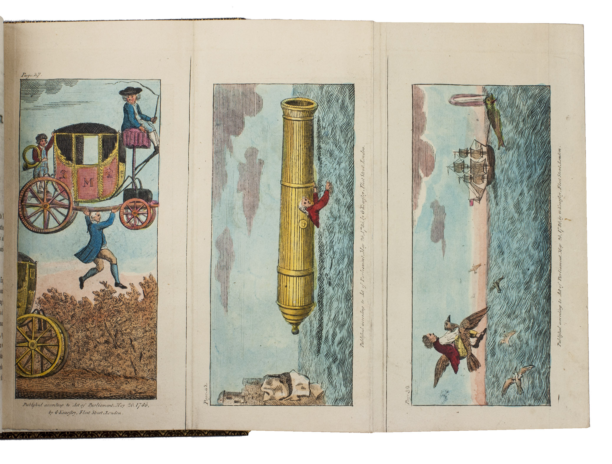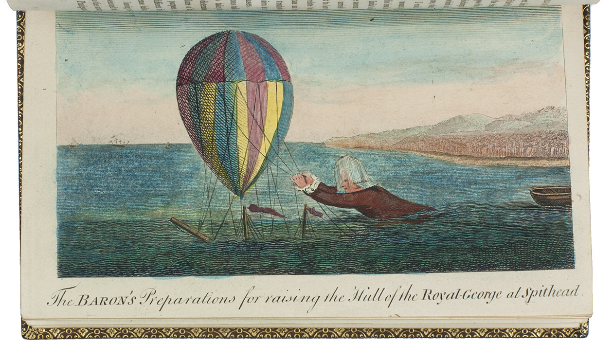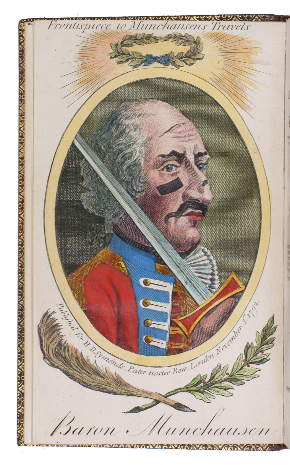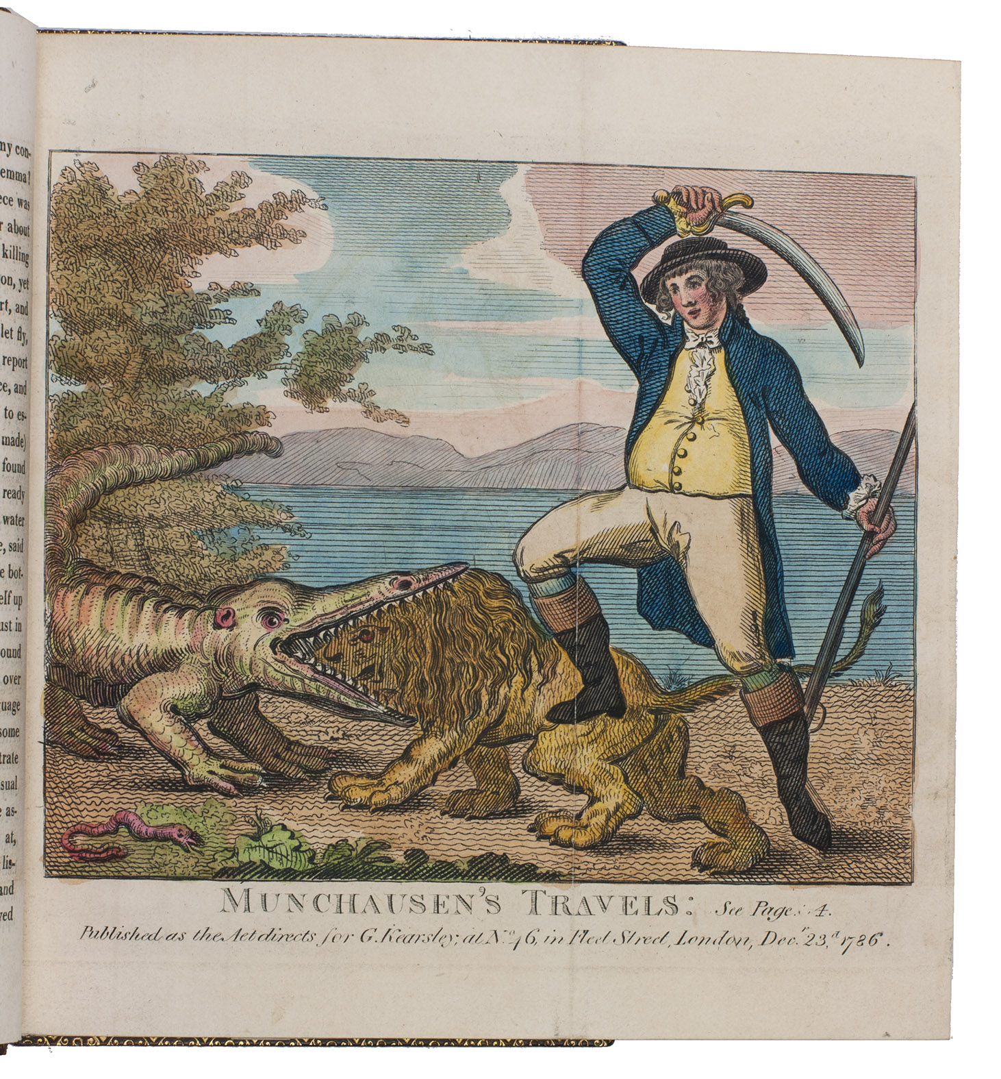 London, R.S. Kirby, 1819. 2 parts in 1 volume. 12mo. With a hand-coloured portrait of Baron Munchhausen as a frontispiece, and 27 hand-coloured engraved plates, including 8 folding. Contemporary gold-tooled calf, with a red morocco title label lettered in gold on the spine, gold-tooled board edges and turn-ins, marbled endpapers, bound by Wallis (stamp on verso of first flyleaf). Kept in a marbled paper (and brown calf fore edge) slip case. XII, 179, [1] pp.