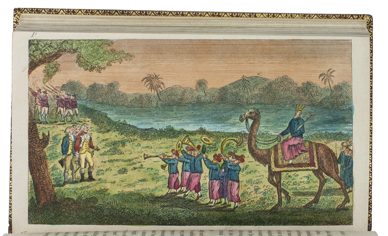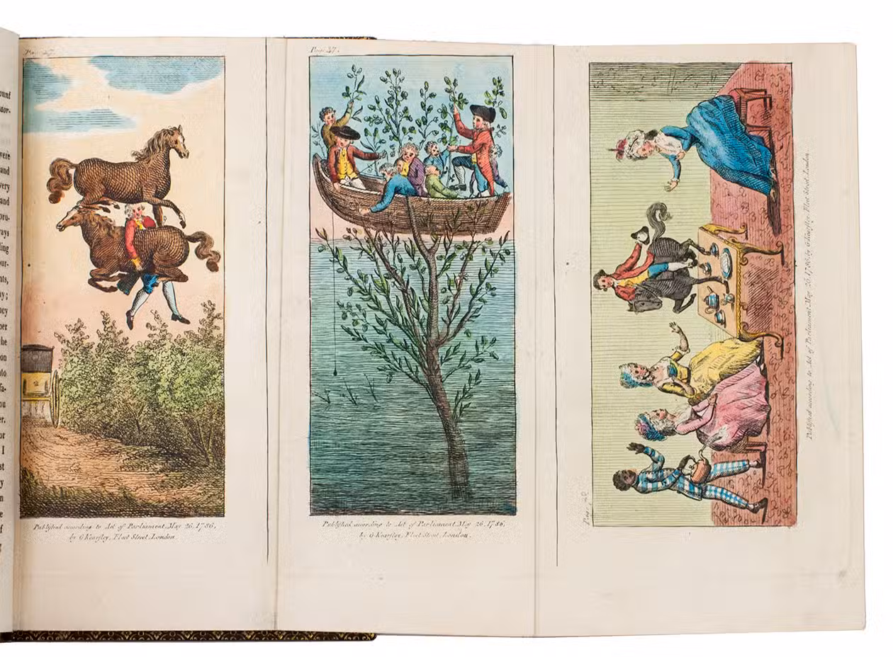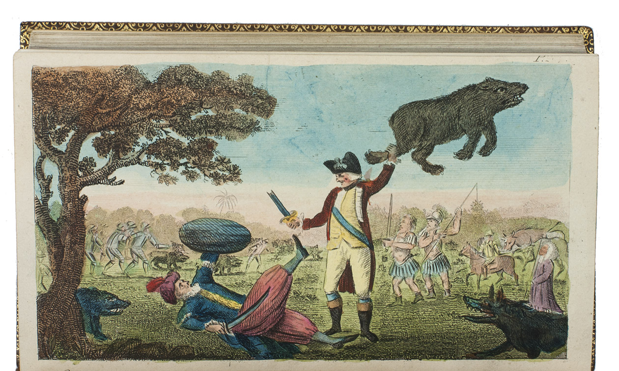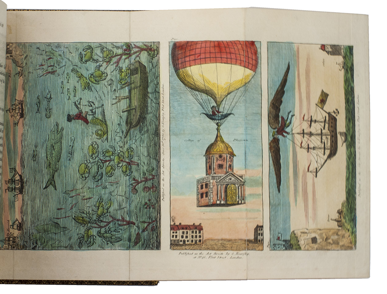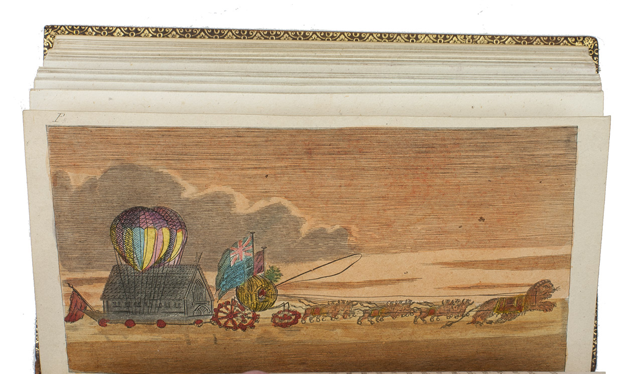 London, R.S. Kirby, 1819. 2 parts in 1 volume. 12mo. With a hand-coloured portrait of Baron Munchhausen as a frontispiece, and 27 hand-coloured engraved plates, including 8 folding. Contemporary gold-tooled calf, with a red morocco title label lettered in gold on the spine, gold-tooled board edges and turn-ins, marbled endpapers, bound by Wallis (stamp on verso of first flyleaf). Kept in a marbled paper (and brown calf fore edge) slip case. XII, 179, [1] pp.