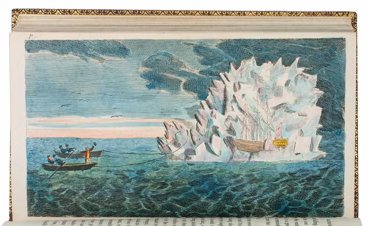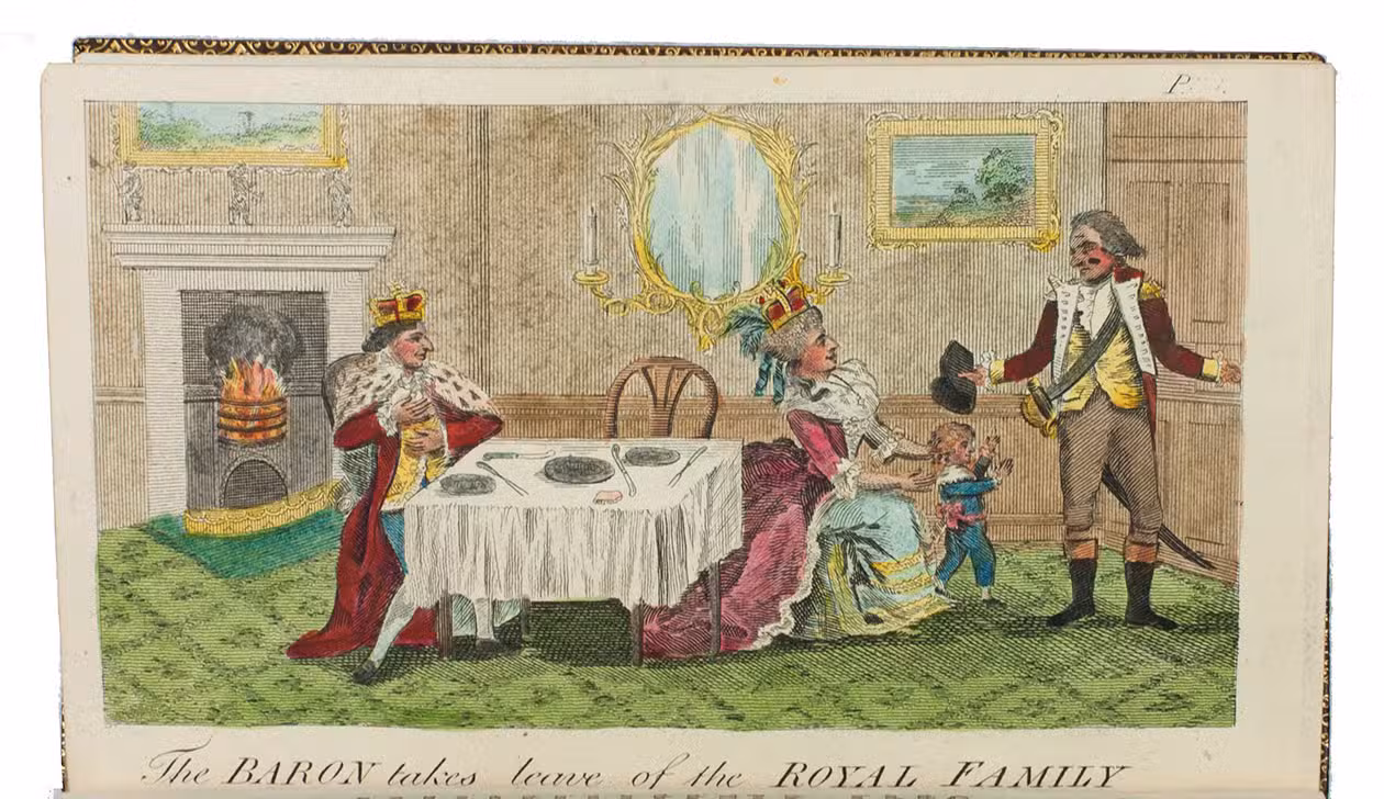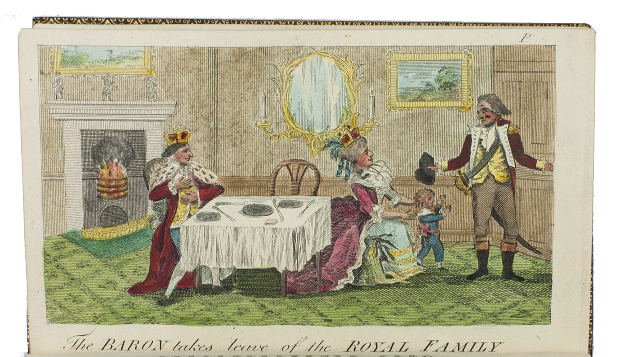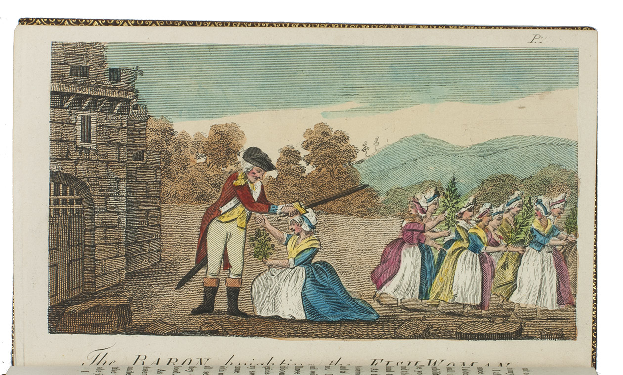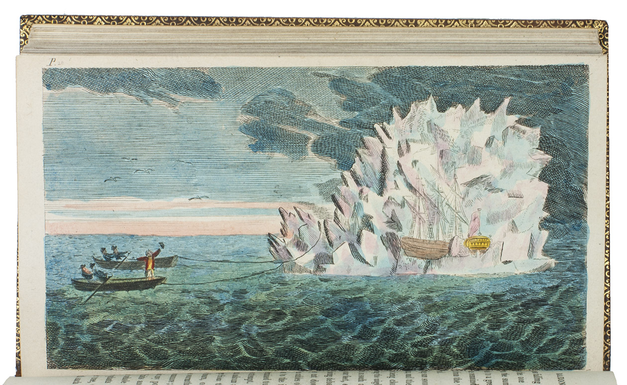 London, R.S. Kirby, 1819. 2 parts in 1 volume. 12mo. With a hand-coloured portrait of Baron Munchhausen as a frontispiece, and 27 hand-coloured engraved plates, including 8 folding. Contemporary gold-tooled calf, with a red morocco title label lettered in gold on the spine, gold-tooled board edges and turn-ins, marbled endpapers, bound by Wallis (stamp on verso of first flyleaf). Kept in a marbled paper (and brown calf fore edge) slip case. XII, 179, [1] pp.
