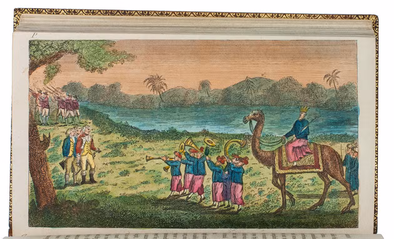 The preposterous stories rapidly grew, and Raspe himself even had nothing to do anymore with the "sequel" that was added as a second volume in 1792. It was dedicated to the famous Africa explorer, James Bruce of Kinnaird, whose extensive account of his travels had first been published in 1790. In the present edition, Raspe's own work on Munchausen occupies the first part, 96 pages, illustrated with a portrait, dated 1792, and 8 folding plates. The rest of the book contains the "sequel" with Munchausen's adventures in Africa, illustrated with 19 full-page engravings. The book is complete as published notwithstanding the promise on the title of 40 copperplates, which is counting the various scenes shown on the plates, and including the portrait.