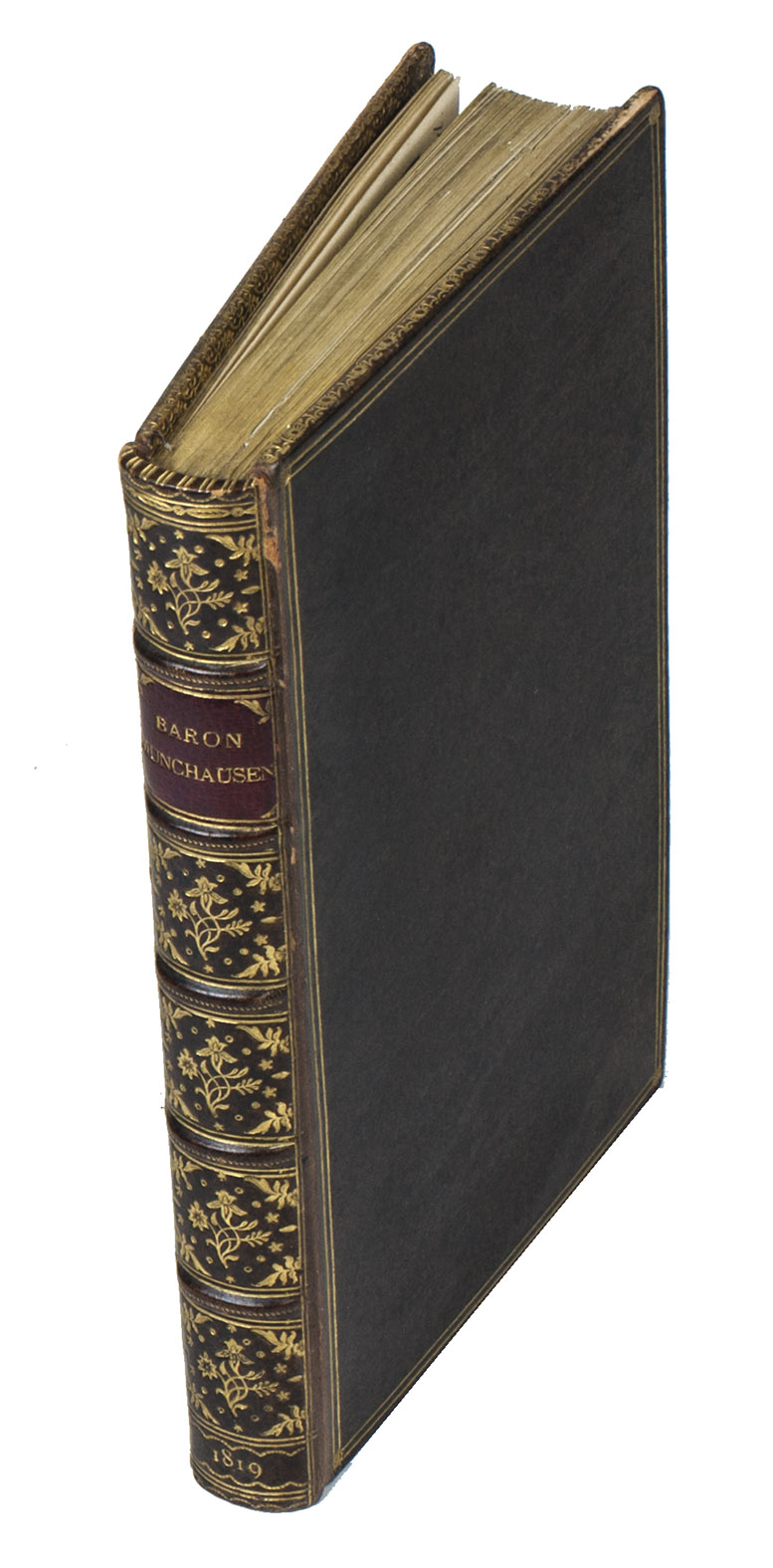 Beautifully bound later English edition of The surprising adventures of Baron Munchausen by Rudolf Erich Raspe (1736-1794), first published in Oxford in 1786. Raspe was a German librarian, writer, and scientist, and is best known for his present collection of tall tales, which was originally a satirical work with political aims. The work contains stories about the fictional character "Baron Munchausen", which is based on Karl Friedrich Hieronymus baron von Münchhausen (1720-1797), a German nobleman who served in the Russian army against the Ottomans. He is known for telling tall tales about his adventures, which were then used as a source for fantastical folktales and literary fiction.