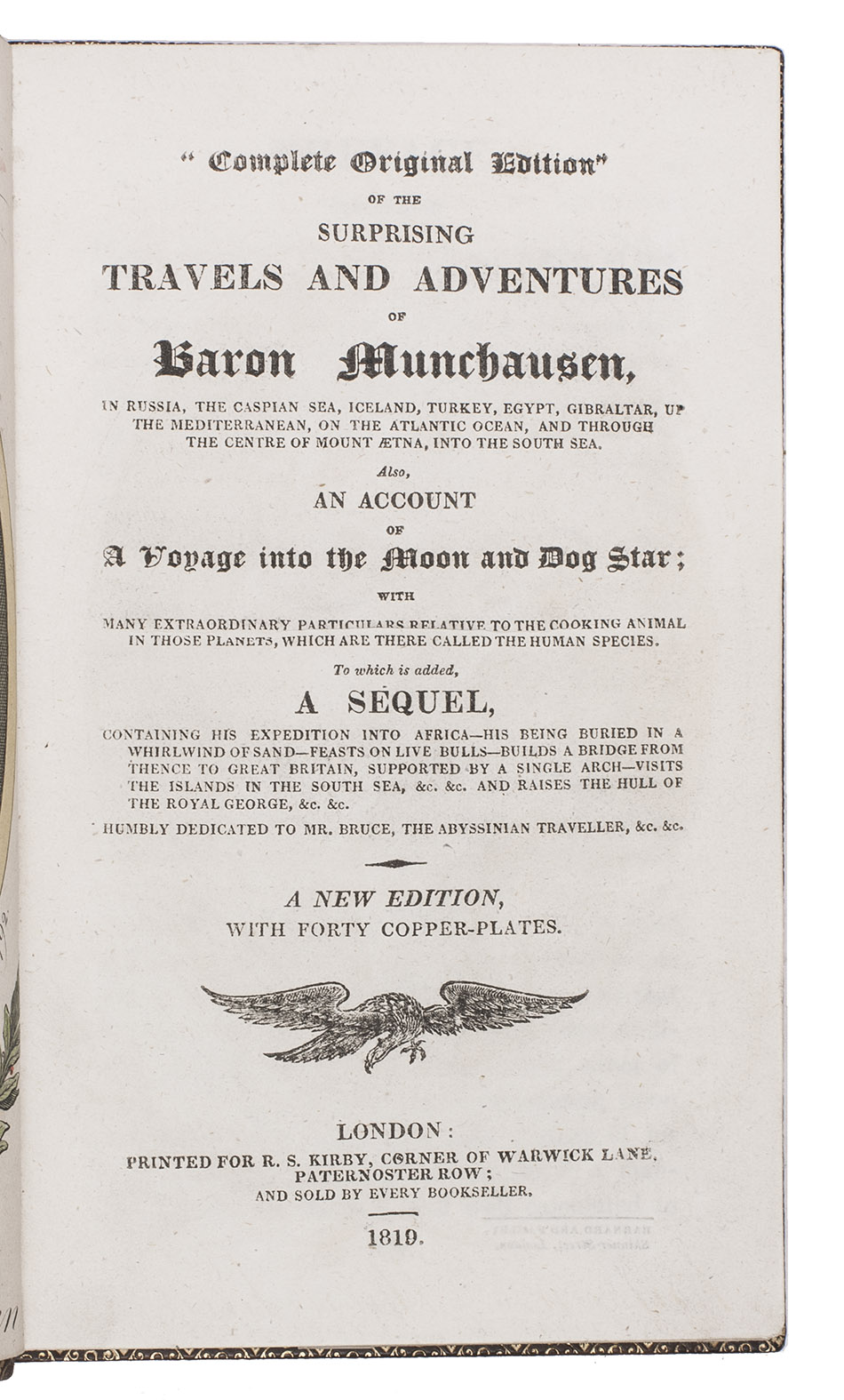 "Complete Original Edition" of the surprising travels and adventures of Baron Munchausen, in Russia, the Caspian Sea, Iceland, Turkey, Egypt, Gibraltar, up the Mediterranean, on the Atlantic Ocean, and through the centre of Mount Aetna, into the South Sea. Also, an account of a voyage into the Moon and Dog Star ... A sequel, containing his expedition into Africa... humbly dedicated to Mr. Bruce.