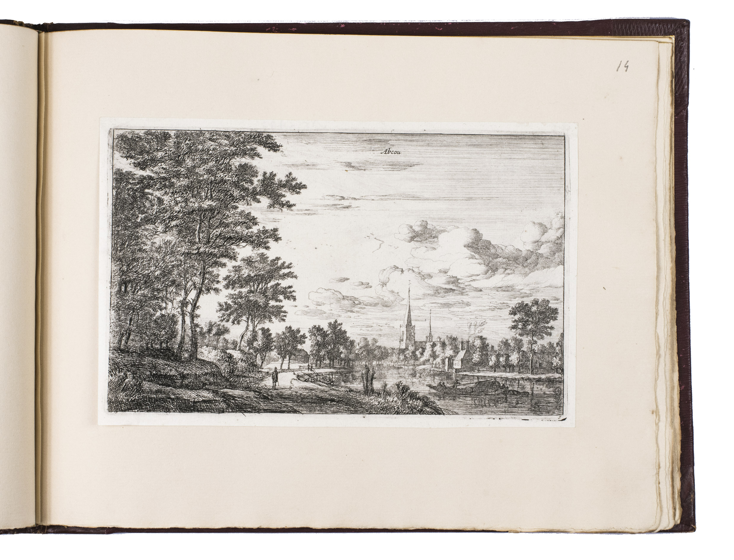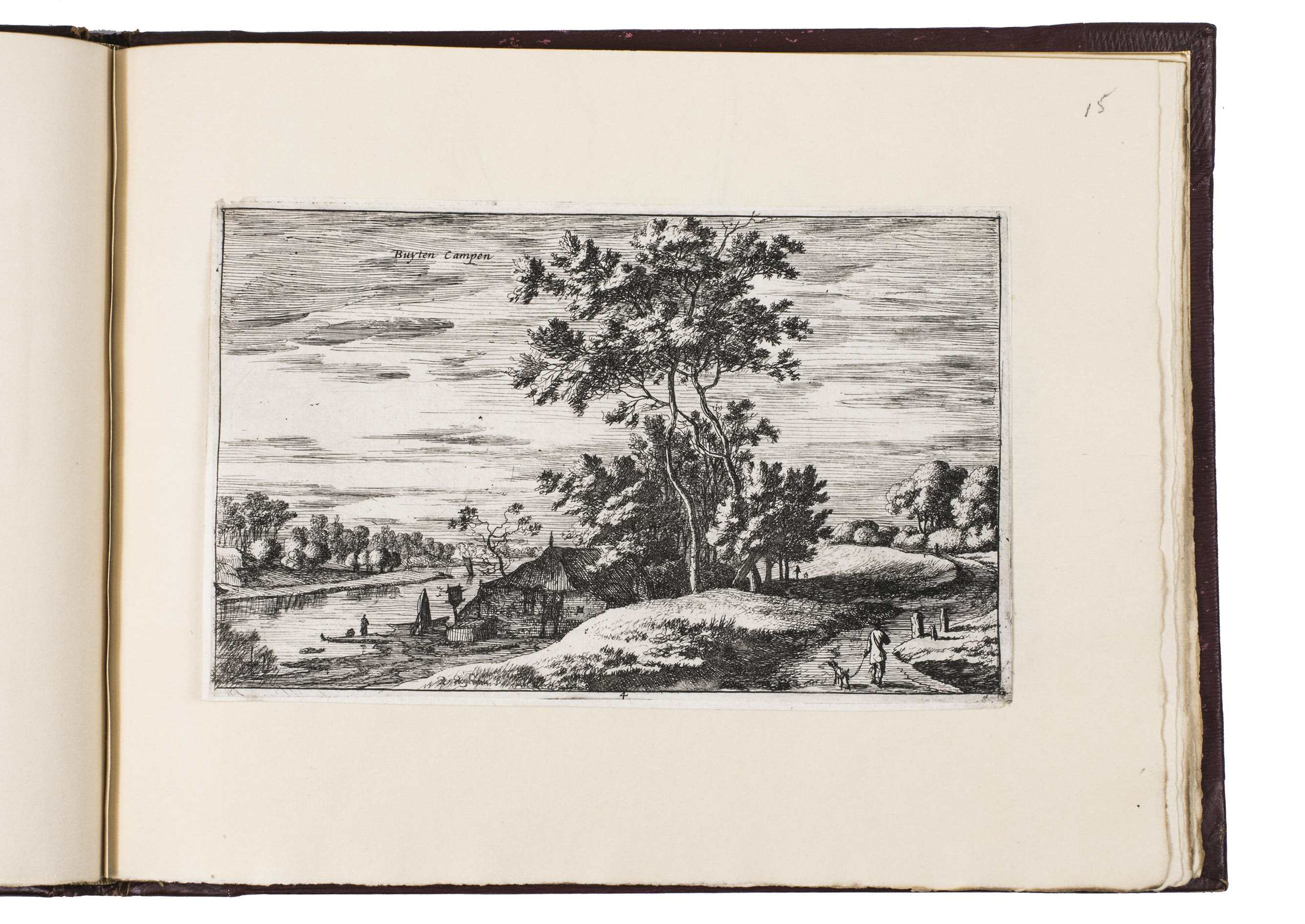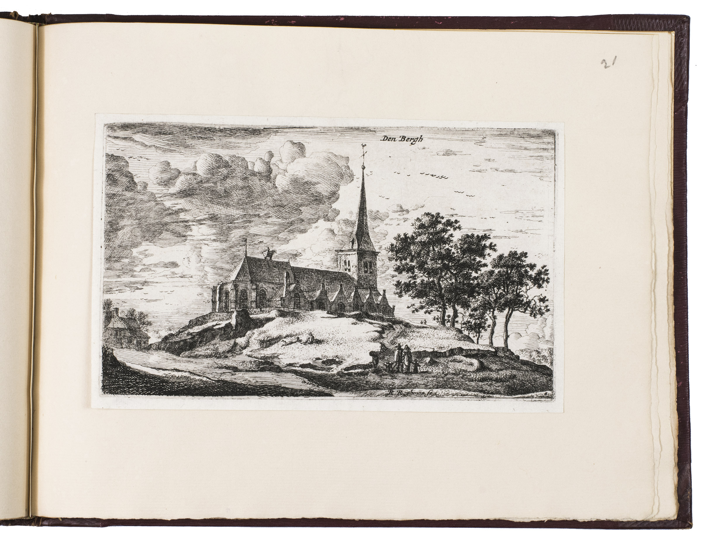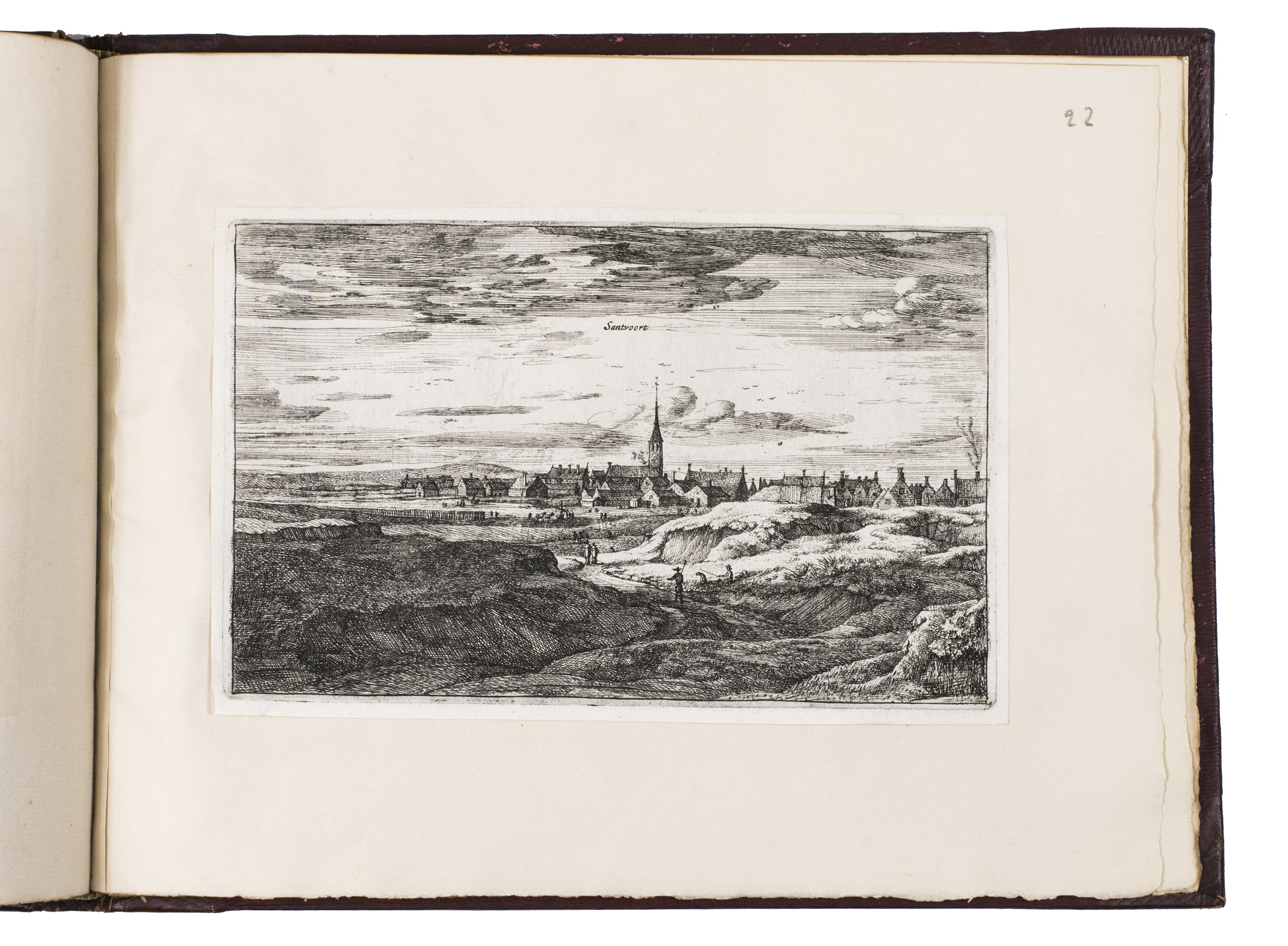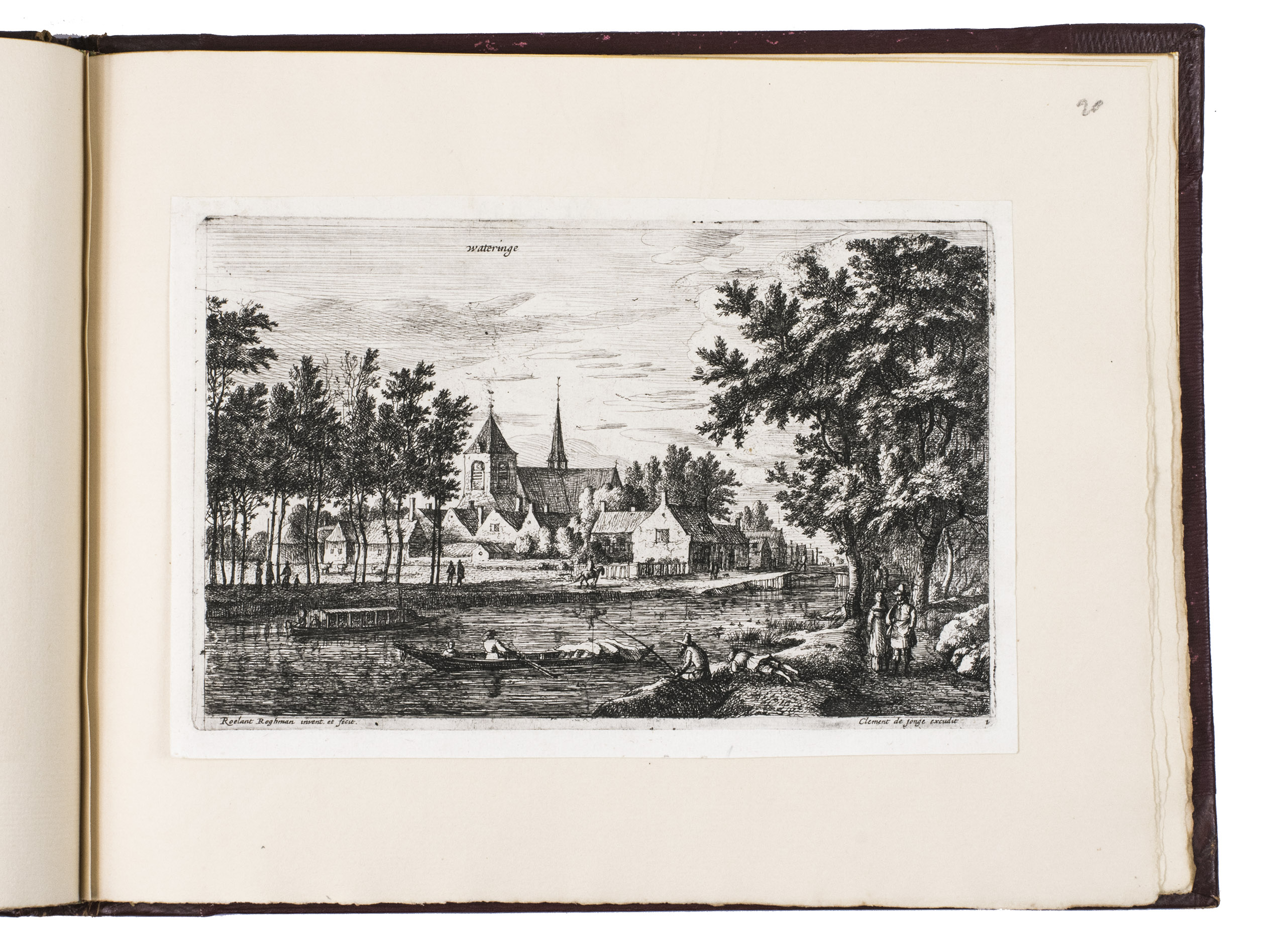 With inserted manuscript collations by the famous Dutch antiquarian Max Elte, mentioning this set is a duplicate of the copy of The Albertina Museum in Vienna, and a photograph of a Dutch landscape painting. The boards and spine have been rubbed, the edges and corners of the boards are slightly scuffed, the boards are warped. The leaves of the album are lightly browned, but the etchings themselves are in good condition, with most in strong impressions. Hollstein, Roghman, XX, 1-24; Laurentius, Clement de Jonghe, p. 137, nrs. 335-7, p. 104.