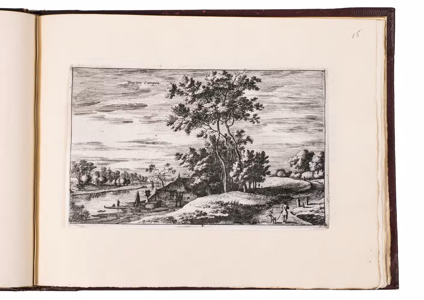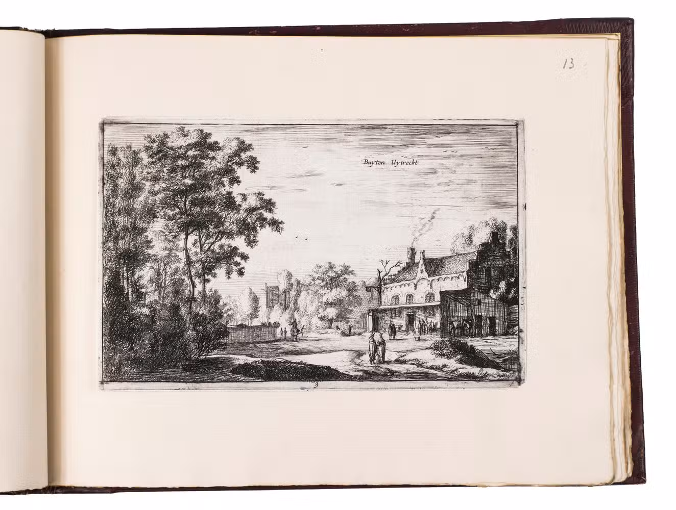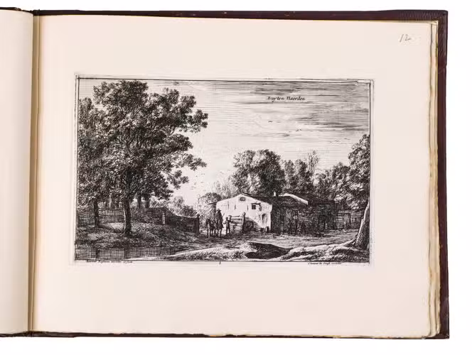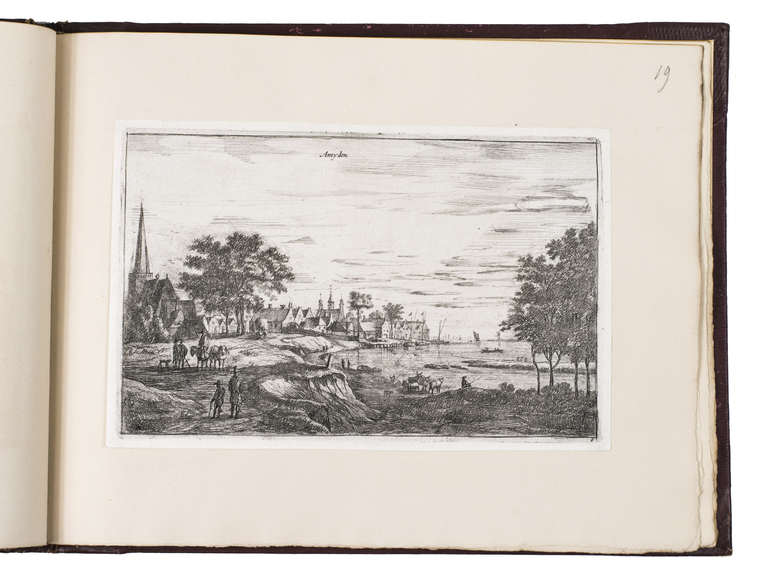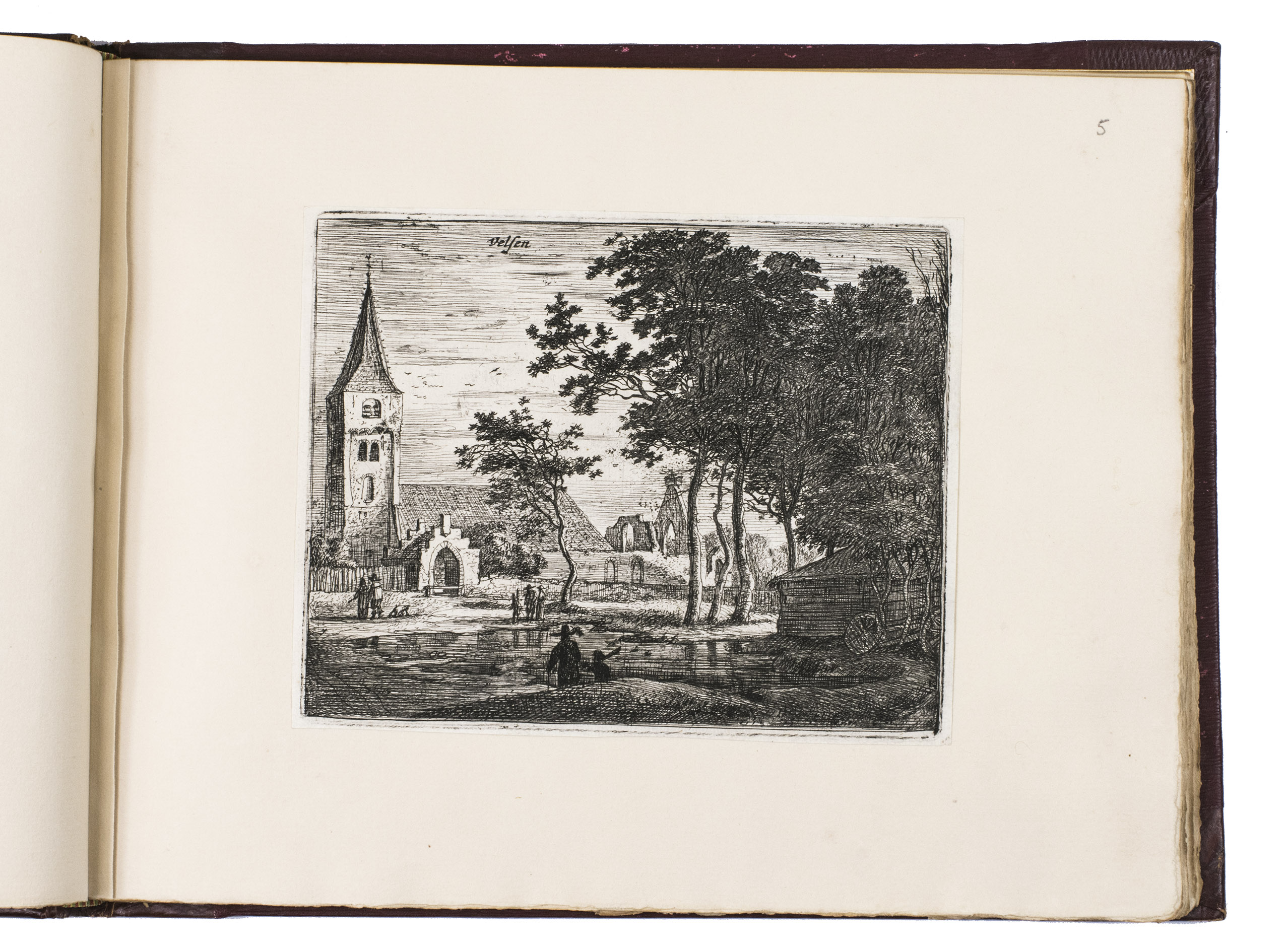 With inserted manuscript collations by the famous Dutch antiquarian Max Elte, mentioning this set is a duplicate of the copy of The Albertina Museum in Vienna, and a photograph of a Dutch landscape painting. The boards and spine have been rubbed, the edges and corners of the boards are slightly scuffed, the boards are warped. The leaves of the album are lightly browned, but the etchings themselves are in good condition, with most in strong impressions. Hollstein, Roghman, XX, 1-24; Laurentius, Clement de Jonghe, p. 137, nrs. 335-7, p. 104.