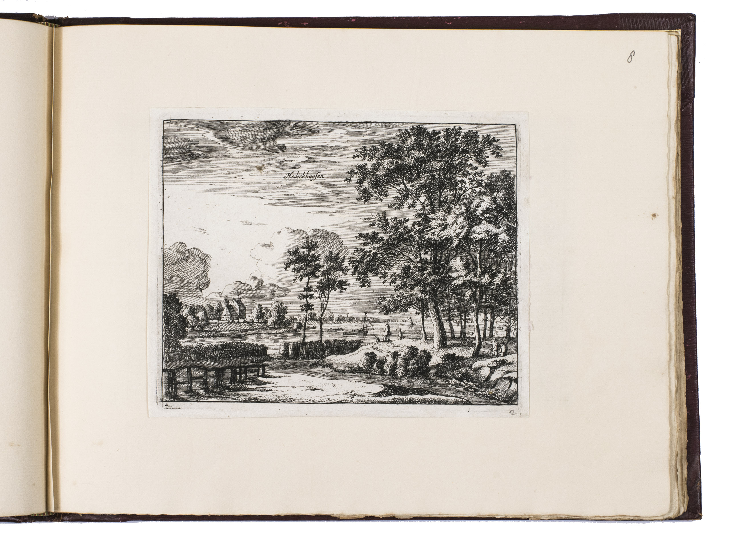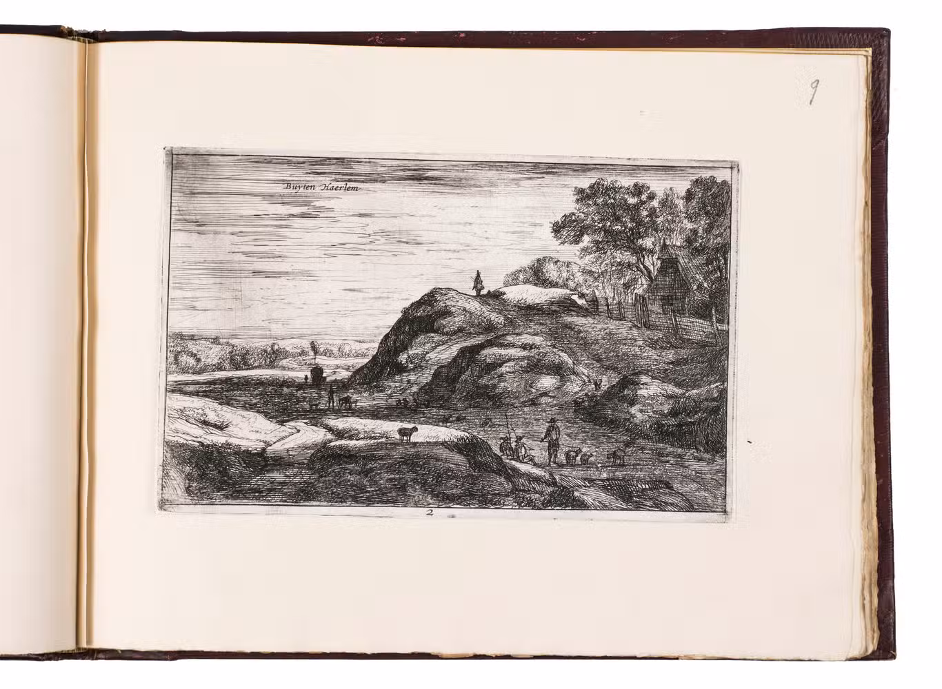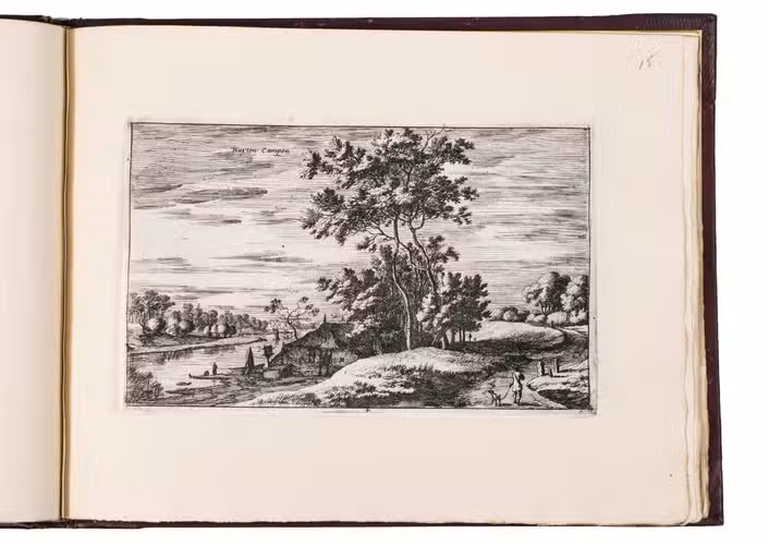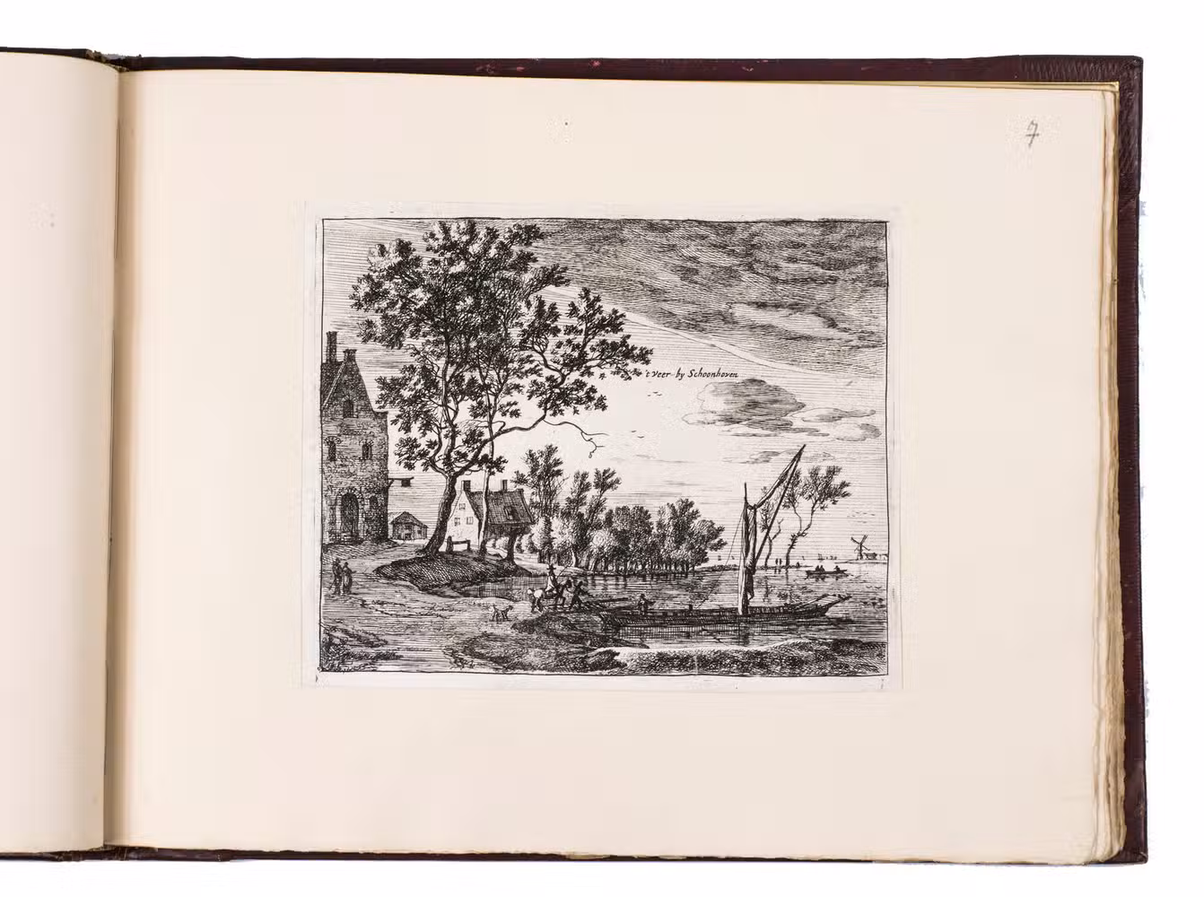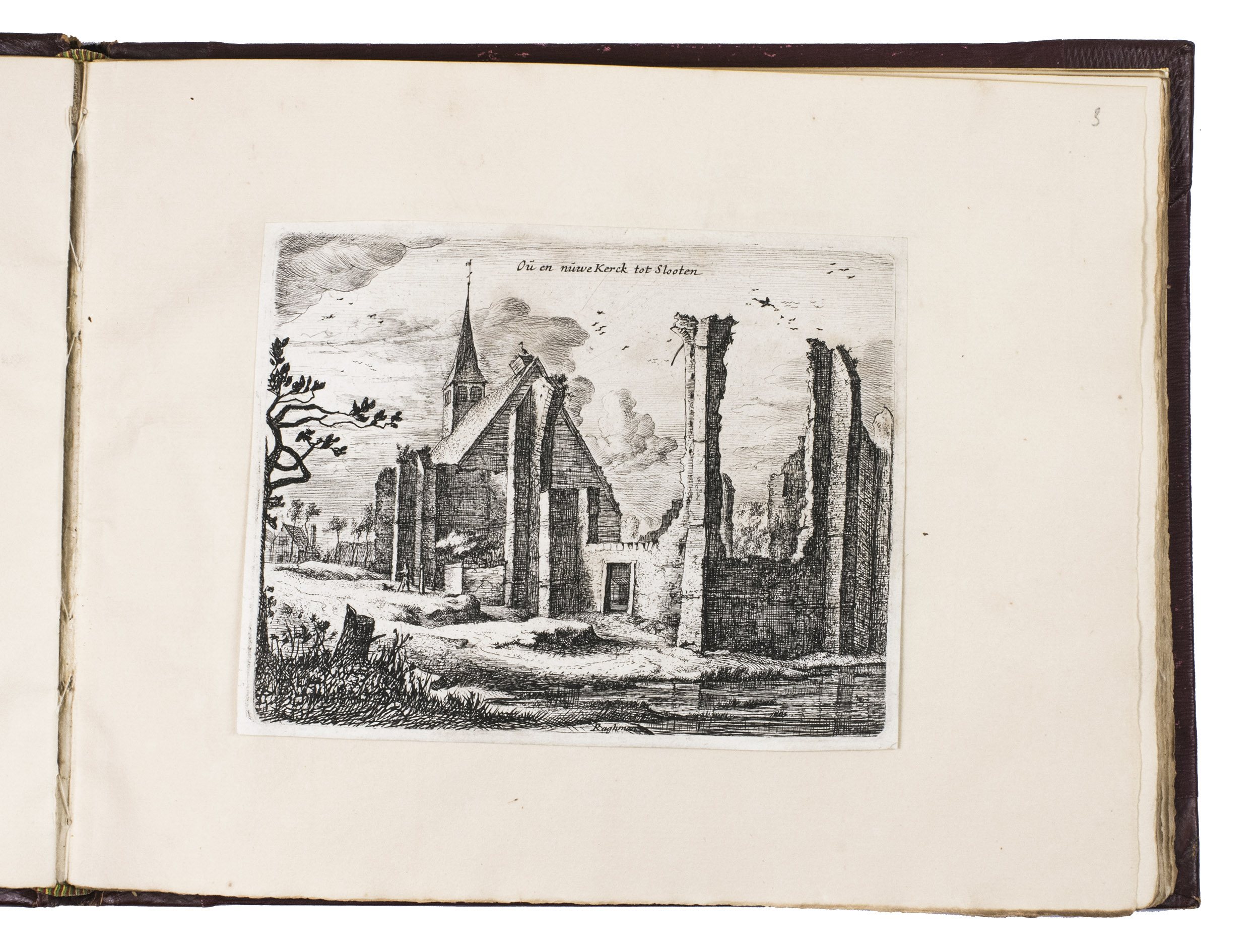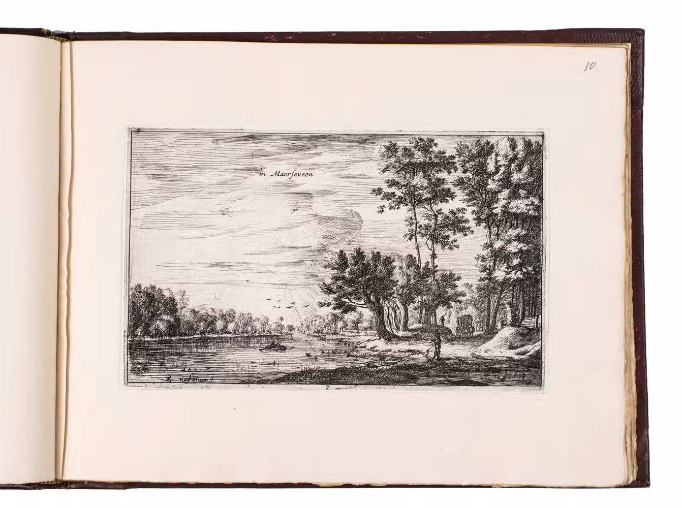 With inserted manuscript collations by the famous Dutch antiquarian Max Elte, mentioning this set is a duplicate of the copy of The Albertina Museum in Vienna, and a photograph of a Dutch landscape painting. The boards and spine have been rubbed, the edges and corners of the boards are slightly scuffed, the boards are warped. The leaves of the album are lightly browned, but the etchings themselves are in good condition, with most in strong impressions. Hollstein, Roghman, XX, 1-24; Laurentius, Clement de Jonghe, p. 137, nrs. 335-7, p. 104.