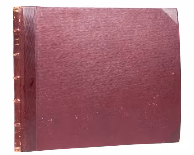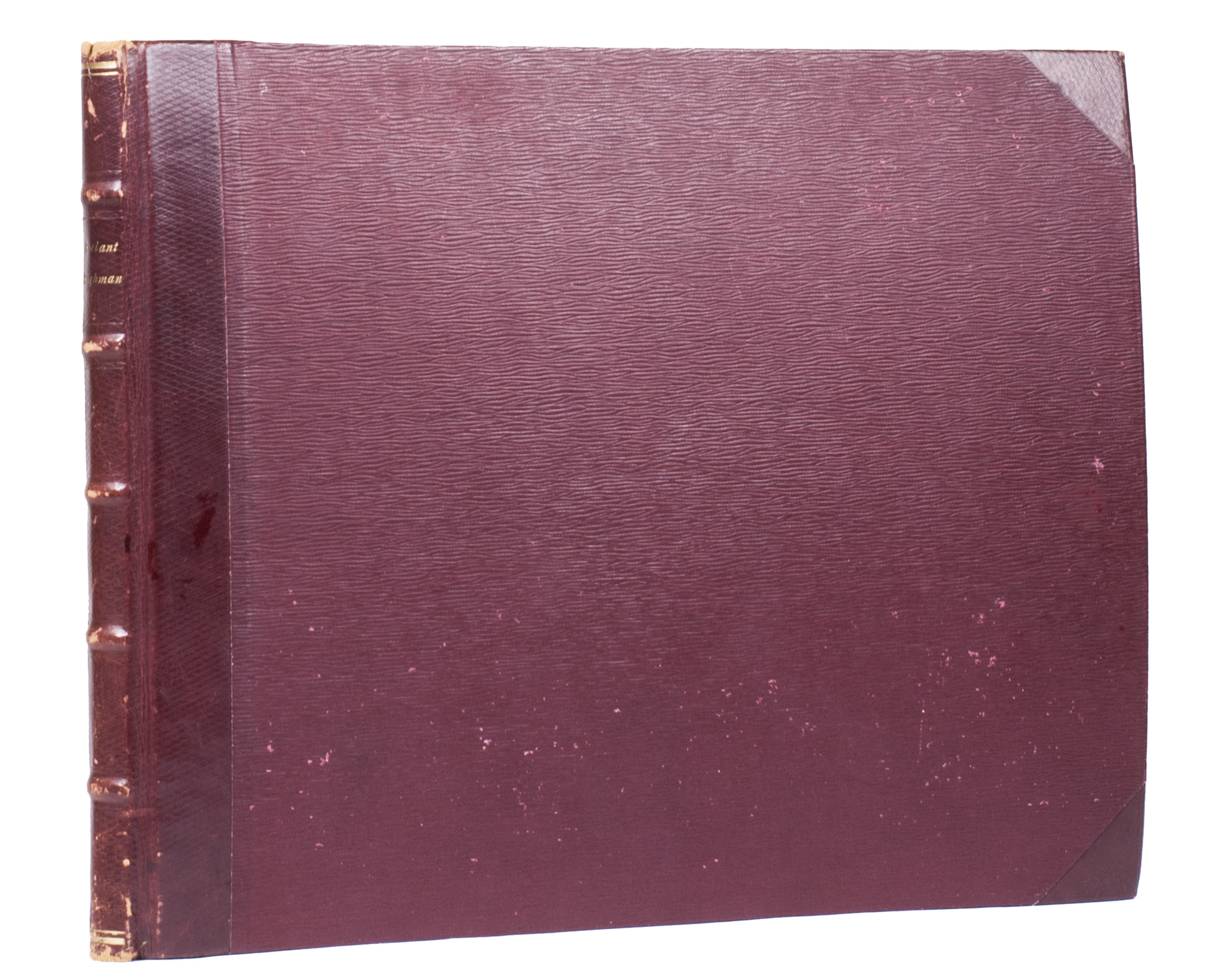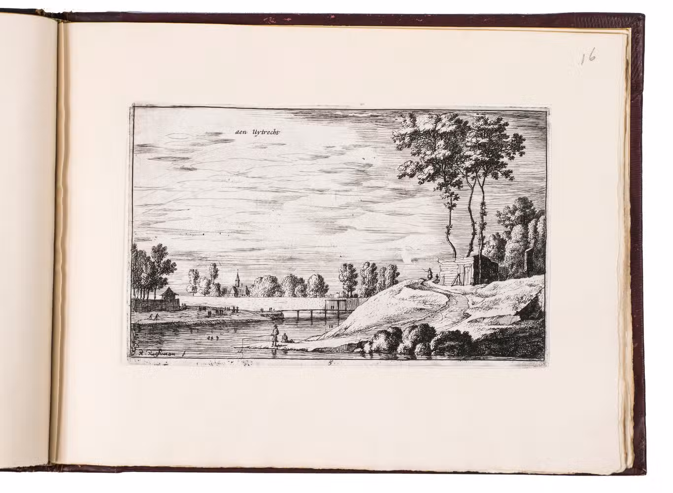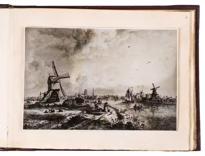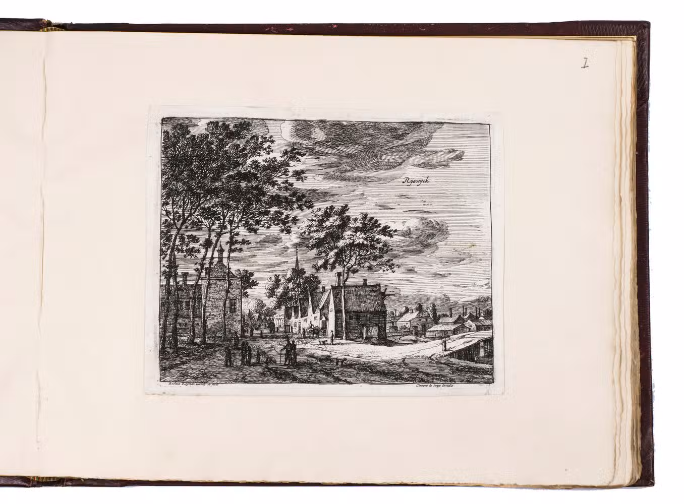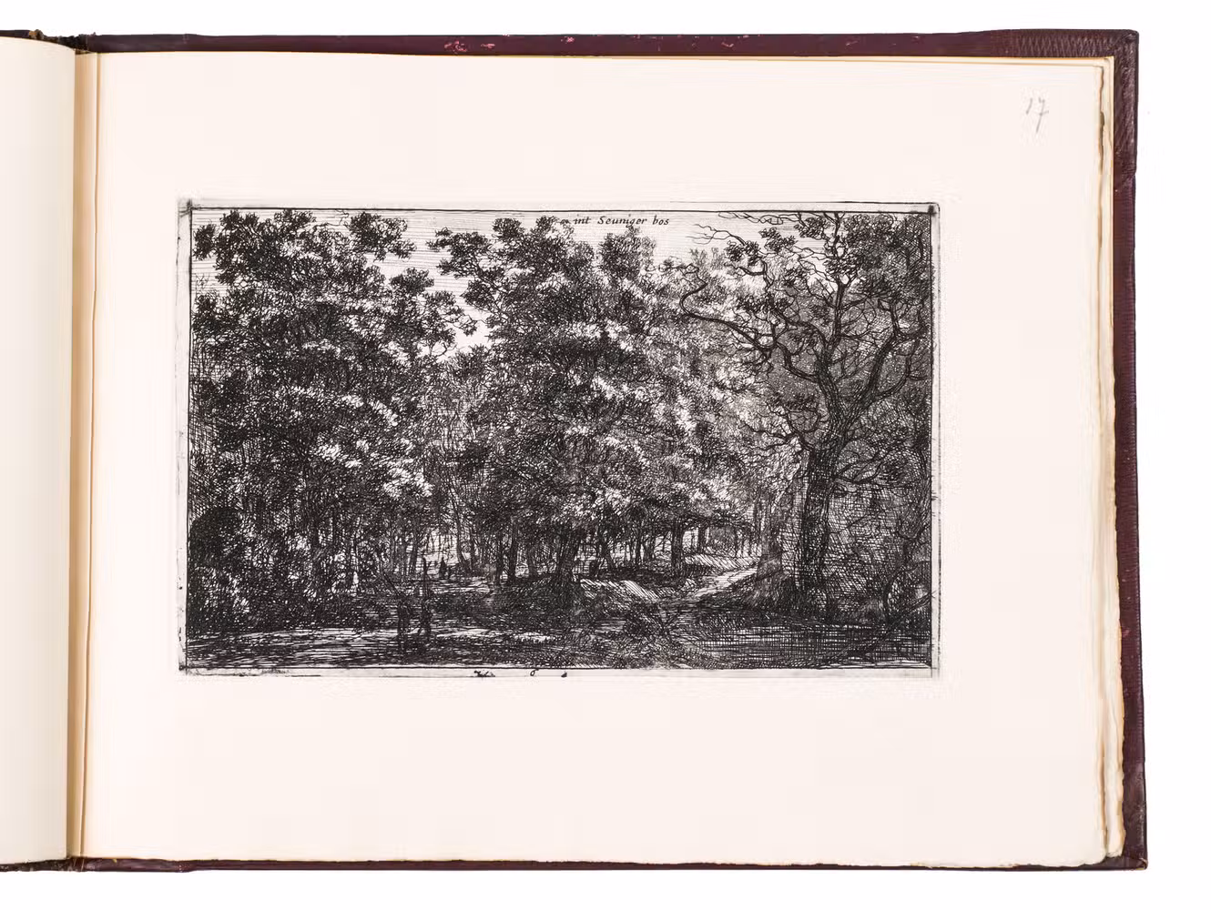 With inserted manuscript collations by the famous Dutch antiquarian Max Elte, mentioning this set is a duplicate of the copy of The Albertina Museum in Vienna, and a photograph of a Dutch landscape painting. The boards and spine have been rubbed, the edges and corners of the boards are slightly scuffed, the boards are warped. The leaves of the album are lightly browned, but the etchings themselves are in good condition, with most in strong impressions. Hollstein, Roghman, XX, 1-24; Laurentius, Clement de Jonghe, p. 137, nrs. 335-7, p. 104.
