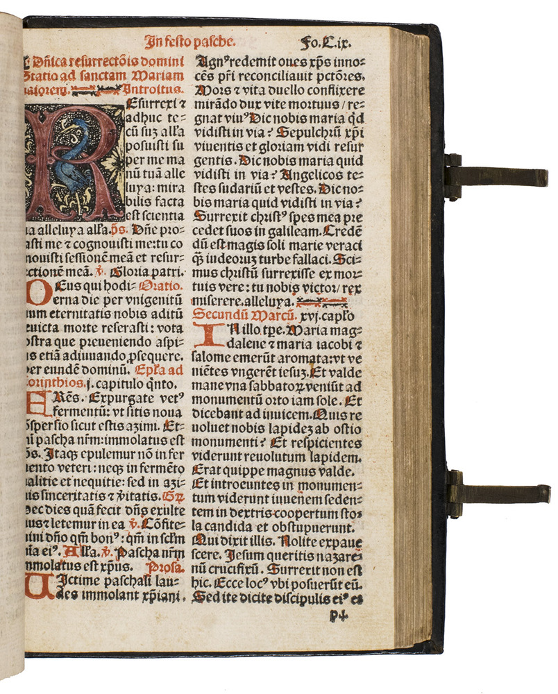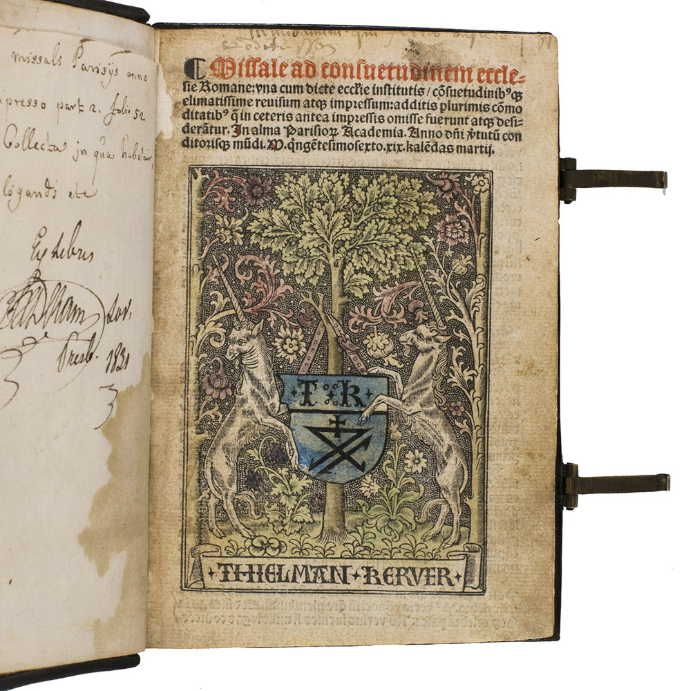 With an inscription in the head margin of the title page, partly shaved and difficult to read; the engraved publishers device of the Antwerp printer and publisher Jean Baptiste III Verdussen (1698-1773) on the front and back pastedown, serving as his bookplate (see above). Also with an 1831 owners inscription of S.[?] De Ram on a free endleaf facing the title page. The rubricator or an early owner has added several notes in red in the calendar. Further with an occasional early marginal manuscript note, some shaved. Four words in the Canon have been deliberately erased as an editorial revision. With an 8 cm tear into one leaf , the running heads of a few others shaved, the title-page slightly soiled, a 3 mm hole in leaf 232 (E4) affecting 2 or 3 words, some tiny marginal wormholes in a few leaves and some water stains in the endpapers, otherwise in very good condition. The binding shows a few small defects, one slightly affecting the gold lettering on the front board, but is also generally very good. A rare and beautifully produced missal, and the second major display of Kervers stunning criblée initials, all coloured by a contemporary hand, as are the woodcut and Kerver's device. Thierry Caerr, Imprimerie et réussite sociale à Paris ...: Thielman Kerver ..., 2000, 2 vols. (www.enssib.fr/bibliotheque-numerique), 117 (4 copies, erroneously described as a folio); Catalogue ... bibliothèque de feu ... Jean de Meyer (Ghent, 2-5 November 1869), lot 33 (8vo, 23 March 1506, not mentioning Kerver, but with "alma Parisiorum Academia"); Pettegree, French books 68270 (not noting Kervers name) & 68271 (erroneously described as a folio) (1 of the same 4 copies); Frank Isaac reworked by David Shaw, frenchpostincunables.djshaw.co.uk, IS000343; USTC 68270 (not noting Kervers name) & 180236 (erroneously described as a folio) (same copy as Pettegree); Catalogue ... de la bibliothèque de M. Jean François van de Velde (Ghent, 1831), lot 1360 (with an extra woodcut inserted facing leaf 58); Catalogus librorum Joannis Baptistae Verdussen (Antwerp, widow of Hieronymous Verdussen, 15 July 1776), liturgy lot 45 (the present copy); Weale & Bohatta, Bibliographia liturgica (1928), 982 (23 March 1506, 2 copies) & 985 ([11] February 1506, not noting Kervers name, no copy located), both on p. 147 in the 1886 ed.; WorldCat 152428895, 315474570, 843131050, 843131052, 906577964, 1063178422 (5 copies plus 2 ghosts); not in Adams (no Kerver missal before 1515); Davis, Fairfax Murray (French), (no Kerver missal); Mortimer, Harvard (French), (no Kerver missal before 1574); SUDOC; catalogue.bnf.fr.