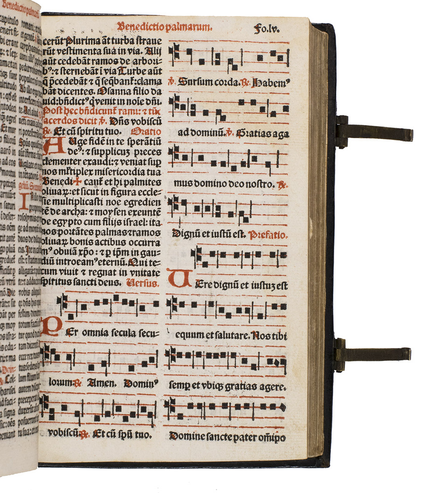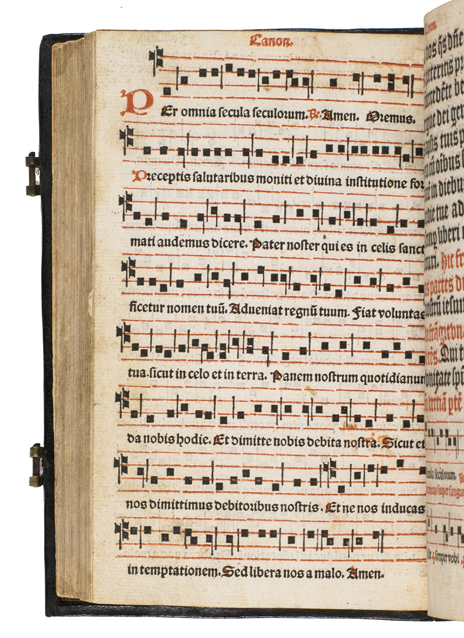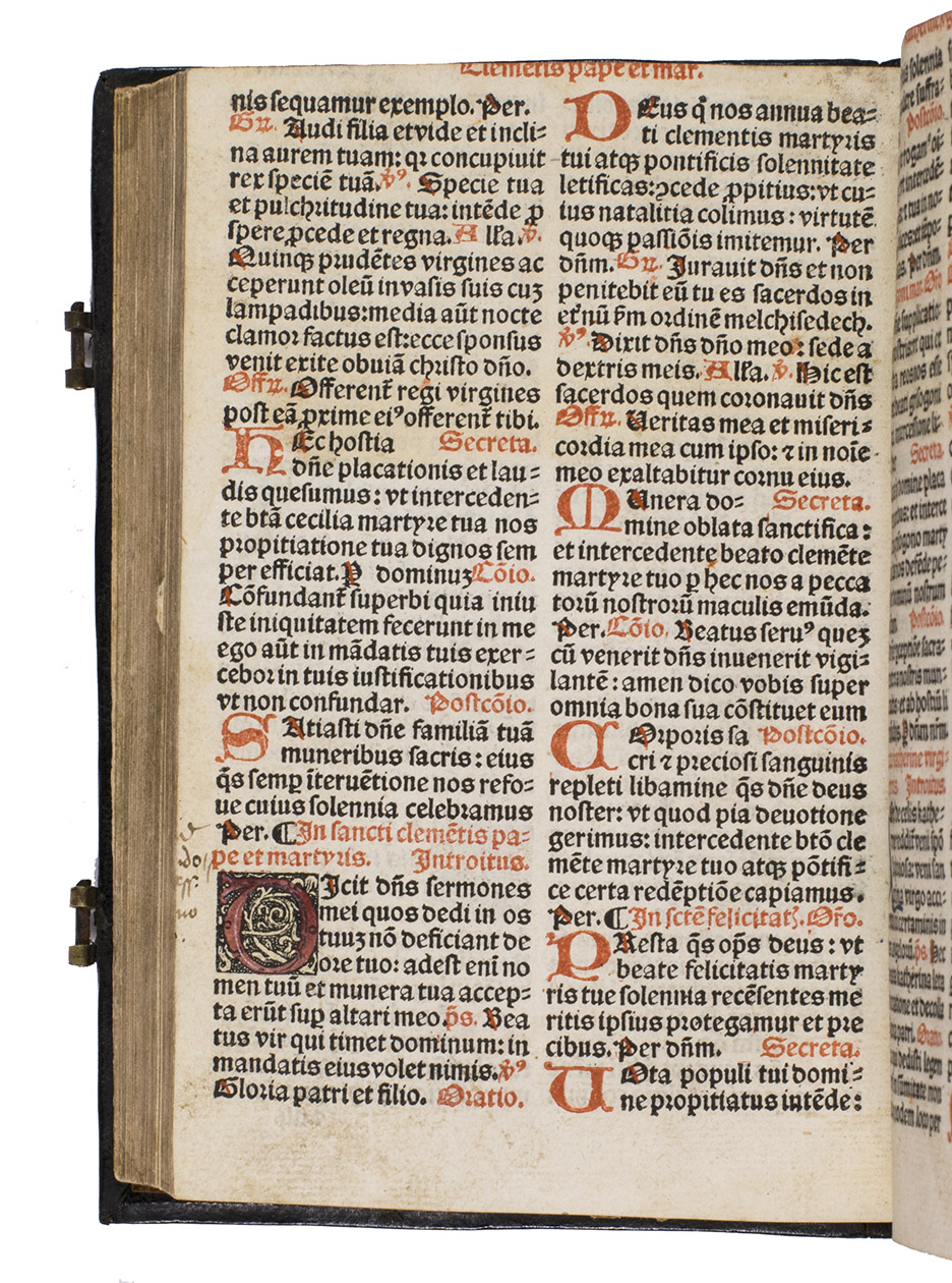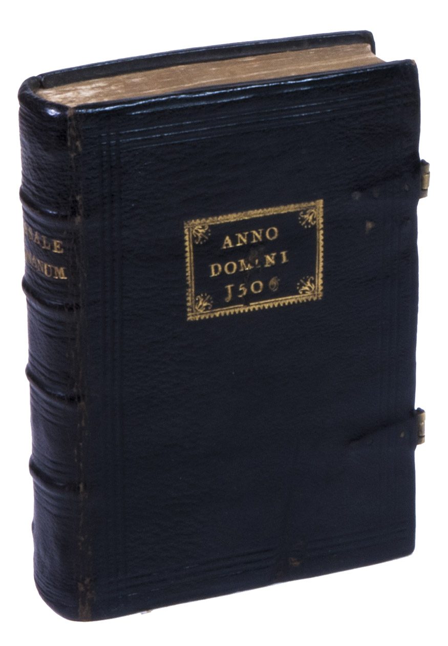 [Paris], Thielman Kerver, [colophon: anno domini 1506. x. kalendas apriles = 23 March 1507]. 8vo. Printed in red and black throughout in 2 columns, with Kervers finely executed criblée armorial device on the title page, a crucifixion woodcut, hundreds of impressions of at least 28 finely executed lombardic initials with decorations, as well as dozens of spaces left for manuscript initials, about half with printed guide letters, and a two-impression plainchant music type. The capitals are rubricated throughout. The main text is set in a rotunda gothic type, and the Canon in a larger textura gothic. The woodcut crucifixion, Kervers device and the criblée initials are all coloured by a contemporary hand. Gold- and blind-tooled black goatskin morocco (1st half of the 18th century), the front board dated "ANNO|DOMINI|1506" in gold, and the spine-title "MISSALE|ROMANUM" in gold, marbled endpapers, gilt edges, 2 brass fastenings. [8], 233, [3] ll.