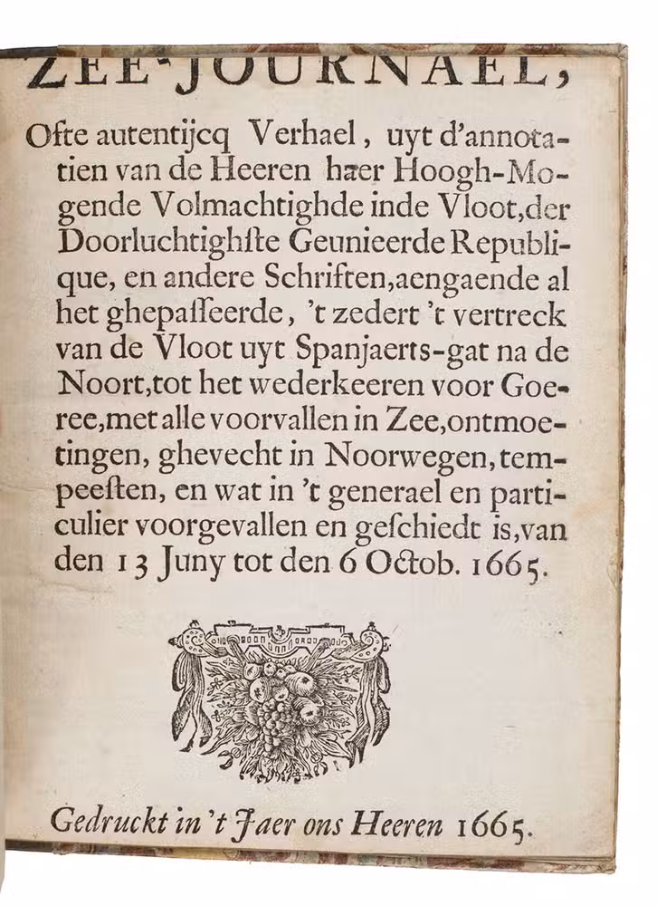 Zee-journael, ofte autentijcq verhael, uyt d'annotatien van de heeren haer hoogh-mogende volmachtighde inde vloot, der doorluchtighste geunieerde Republique, en andere schriften, aengaende al het ghepasseerde, 't zedert 't vertreck van de vloot uyt Spanjaerts-gat na de Noort, tot het wederkeeren voor Goeree, met alle voorvallen in zee, ontmoetingen, ghevecht in Noorwegen, tempeesten, en wat in 't generael en particulier voorgevallen en geschiedt is, van den 13 juny tot den 6 octob. 1665.